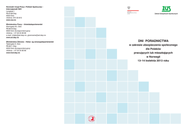 Norweski Urząd Pracy i Polityki Społecznej – Internasjonalt NAV Langkaia 1 PB 8138 Dep. 0033 Oslo infolinia: 810 33 810 www.nav.no Ambasada Rzeczypospolitej Polskiej w Oslo Zakład Ubezpieczeń Społecznych Ministerstwo Pracy – Arbeidsdepartementet Akersgata 64, Oslo PB 8019 Dep. 0030 Oslo (korespondencyjny) infolinia: +47 22 24 90 90 e-mail: [email protected], [email protected] www.ad.dep.no Ministerstwo Zdrowia – Helse- og omsorgsdepartementet Teatergata 9, Oslo PB 8011 Dep. 0030 Oslo (korespondencyjny) infolinia: +47 22 24 90 90 www.hod.dep.no DNI PORADNICTWA w zakresie ubezpieczenia społecznego dla Polaków pracujących lub mieszkających w Norwegii 13–14 kwietnia 2013 roku Każdy Polak, który pracuje lub przebywa w Norwegii ma takie same prawa do zabezpieczenia społecznego jak Norweg. Wynika to z zasad wspólnotowej koordynacji systemów zabezpieczenia społecznego. Określają je rozporządzenie Parlamentu Europejskiego i Rady nr 883/2004 w sprawie koordynacji systemów zabezpieczenia społecznego oraz rozporządzenie Parlamentu Europejskiego i Rady nr 987/2009 dotyczące wykonywania rozporządzenia nr 883/04. Oba rozporządzenia odnoszą się też do Islandii, Liechtensteinu i Norwegii – krajów Europejskiego Obszaru Gospodarczego (EOG) niebędących członkami Unii Europejskiej – i do Szwajcarii. Ze świadczeń społecznych można korzystać, gdy opłaca się składki. Rodzaj i zakres uprawnień do tych świadczeń zależą od sposobu zatrudnienia i okresu pracy. Norweski system ubezpieczeń społecznych to folketrygden. Aby mieć uprawnienia do świadczeń, trzeba być członkiem norweskiego systemu ubezpieczeń społecznych. Wszystkie osoby mieszkające na stałe w Norwegii są członkami norweskiego systemu ubezpieczeń społecznych. Jeżeli pracujesz legalnie na terenie Norwegii, to od pierwszego dnia pracy automatycznie zostajesz członkiem norweskiego systemu ubezpieczeń społecznych. Jako pracownik masz obowiązek płacenia składek na ubezpieczenia społeczne. Wysokość składki na ubezpieczenie społeczne (w tym na świadczenia emerytalne, rentowe, świadczenie z tytułu wypadku przy pracy oraz choroby zawodowej, zasiłek macierzyński, świadczenia rodzinne oraz zasiłek dla bezrobotnych) wynosi 7,8% wynagrodzenia brutto. Składki są potrącane razem z podatkiem. Jeśli pracujesz w Norwegii u norweskiego pracodawcy, powinieneś być ubezpieczony w Norwegii, a ten pracodawca powinien odprowadzać należne składki na Twoje ubezpieczenie społeczne. Rzeczowe świadczenia zdrowotne należą do obowiązków Narodowego Funduszu Zdrowia, natomiast świadczeniami rodzinnymi i dla bezrobotnych zajmuje się Ministerstwo Pracy i Polityki Społecznej. Emerytura (Alderspensjon) Emerytura z norweskiego systemu ubezpieczeń społecznych przysługuje osobom, które ukończyły 67 lat. Oprócz tego trzeba: zamieszkiwać w Norwegii przez przynajmniej 3 lata po ukończeniu 16. roku życia i mieć aktualne członkostwo w norweskim systemie ubezpieczeń społecznych. Od wymogu minimalnego okresu zamieszkania w Norwegii można odstąpić, jeżeli pracowałeś w którymś z krajów Unii Europejskiej (UE), Europejskiego Obszaru Gospodarczego (EOG) lub w Szwajcarii. Prawo do pełnej emerytury z Norwegii przysługuje po uzyskaniu 40-letniego okresu ubezpieczenia w norweskim systemie ubezpieczeń społecznych. Wlicza się do niego również okresy ubezpieczenia w krajach UE, EOG i Szwajcarii. Jeżeli przeprowadzisz się do innego kraju UE, EOG lub Szwajcarii emerytura z norweskiego systemu ubezpieczeń społecznych będzie Ci tam przekazywana. Zasiłek chorobowy (Sykepenger) Zasiłek chorobowy to rekompensata utraty dochodu z pracy w przypadku niezdolności do pracy spowodowanej chorobą lub obrażeniem. Abyś mógł ubiegać się o zasiłek chorobowy, musisz: być niezdolny do pracy z powodu naruszenia sprawności organizmu, które wyraźnie jest wynikiem własnej choroby lub obrażenia oraz przepracować co najmniej cztery tygodnie (okres przepracowany w innym kraju UE, EOG lub Szwajcarii wlicza się do okresu wymaganego dla uzyskania prawa do zasiłku). Otrzymasz prawo do zasiłku chorobowego, jeśli udokumentujesz niezdolność do pracy. Takim dokumentem jest zaświadczenie od lekarza albo oświadczenie własne (egenmelding), gdy zasiłek wypłaca pracodawca. Jeśli zostałeś wysłany (oddelegowany) do pracy w Norwegii, pracodawca polski powinien wystąpić do ZUS o wydanie formularza A1 (dawny formularz E 101). Formularz ten potwierdza, że nadal podlegasz zabezpieczeniu społecznemu w Polsce, a pracodawca nadal płaci za Ciebie składki do polskiego systemu. Ten formularz wydaje się na maksymalnie 24 miesiące. Sprawami ubezpieczenia chorobowego i zasiłków chorobowych zajmuje się Norweski Urząd Pracy i Opieki Społecznej za Granicą – Internasjonalt NAV. Jakie świadczenia podlegają koordynacji? Zakład Ubezpieczeń Społecznych zajmuje się następującymi świadczeniami pieniężnymi: • z tytułu choroby, • z tytułu macierzyństwa, • z tytułu inwalidztwa (renty), • z tytułu starości (emerytury), • z tytułu wypadków przy pracy i chorób zawodowych, • renty rodzinne, • zasiłki na wypadek śmierci, • świadczenia przedemerytalne. Osoby pracujące na własny rachunek nie mają prawa do zasiłku chorobowego za pierwsze 16 dni nieobecności w pracy z powodu choroby. NAV wypłaca zasiłek chorobowy od 17. dnia nieobecności z powodu choroby. Jeżeli zasiłek będzie wypłacać NAV, wniosek o zasiłek chorobowy musisz przesłać do biura NAV w miejscu Twojego pobytu w Norwegii. Jak długo możesz dostawać zasiłek chorobowy? Zasiłek chorobowy przyznaje się na okres do jednego roku. Zasiłek chorobowy wypłacony z innego kraju UE, EOG lub Szwajcarii przed rozpoczęciem przez pracownika pracy w Norwegii może zostać wliczony do tego okresu, jeżeli zasiłek dotyczył tego samego przypadku chorobowego. Jeżeli nadal jesteś niezdolny do pracy,