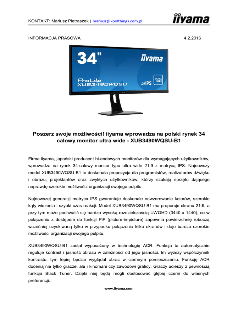 KONTAKT: Mariusz Pietraszek | [email protected] INFORMACJA PRASOWA 4.2.2016 Poszerz swoje możliwości! iiyama wprowadza na polski rynek 34 calowy monitor ultra wide - XUB3490WQSU-B1 Firma iiyama, japoński producent hi-endowych monitorów dla wymagających użytkowników, wprowadza na rynek 34-calowy monitor typu ultra wide 21:9 z matrycą IPS. Najnowszy model XUB3490WQSU-B1 to doskonała propozycja dla programistów, realizatorów dźwięku i obrazu, projektantów oraz zwykłych użytkowników, którzy szukają sprzętu dającego naprawdę szerokie możliwości organizacji swojego pulpitu. Najnowszej generacji matryca IPS gwarantuje doskonałe odwzorowanie kolorów, szerokie kąty widzenia i szybki czas reakcji. Model XUB3490WQSU-B1 ma proporcje ekranu 21:9, a przy tym może pochwalić się bardzo wysoką rozdzielczością UWQHD (3440 x 1440), co w połączeniu z dostępem do funkcji PiP (picture-in-picture) zapewnia powierzchnię roboczą wcześniej uzyskiwaną tylko w przypadku połączenia kliku ekranów i daje bardzo szerokie możliwości organizacji swojego pulpitu. XUB3490WQSU-B1 został wyposażony w technologię ACR. Funkcja ta automatycznie reguluje kontrast i jasność obrazu w zależności od jego jasności. Im wyższy współczynnik kontrastu, tym lepiej będzie wyglądał obraz w ciemnym pomieszczeniu. Funkcję ACR docenią nie tylko gracze, ale i kinomani czy zawodowi graficy. Graczy ucieszy z pewnością funkcja Black Tuner. Dzięki niej będą mogli dostosować głębię czerni do własnych preferencji. www.iiyama.com KONTAKT: Mariusz Pietraszek | [email protected] Ponieważ najnowszy monitor iiyama został stworzony przede wszystkim z myślą o profesjonalistach spędzających długie godziny przed ekranem komputera, XUB3490WQSUB1 został wyposażony w funkcję redukcji niebieskiego światła emitowanego przez monitor, które jest główną przyczyną odpowiedzialną za zmęczenie oczu. Panel posiada także regulowaną stopkę, która pozwoli na dostosowanie wysokości i kąta ekranu do poziomu wzroku i tym samym poprawia komfort pracy. Minimalistyczny, nowoczesny design sprawia, że monitor będzie dobrze prezentował się w każdym wnętrzu. Więcej informacji o produkcie pod adresem: http://iiyama.com/pl_pl/produkty/prolitexub3490wqsu-b1/ Sugerowana cena detaliczna monitora iiyama XUB3490WQSU-B1wynosi 3 599 PLN. Specyfikacja techniczna iiyama XUB3490WQSU-B1: Przekątna ekranu Panel Maks. powierzchnia robocza (wys. x szer.) Czas reakcji Kontrast Kontrast Jasność 34"; 86.7cm AH-IPS LED Rozdzielczość fizyczna Częstotliwość pozioma Częstotliwość pionowa Synchronizacja Format obrazu Funkcja PIP (Picture In Picture) Cyfrowe wejście sygnału HDCP Wyjścia 3440 x 1440 (4.9 megapiksela) 30 - 100 KHz 24 - 75 Hz Separate sync 21:09 334.8 x 799.8 mm; 13.2" x 31.5" 5 ms 1 000 : 1 typowy 80 000 000 : 1 ACR 320 cd/m² typowa poziomo/pionowo: 178°/ 178°; prawo/lewo: 89°/ 89°; Kąt widzenia CR>10 góra/dół: 89°/ 89° Wyświetlane kolory 1,07 miliardów Wielkość plamki (pion. x poz.) 0.2325 x 0.2325 mm Koncentrator USB PIP, PbP HDMI, HDMI 2.0, HDMI/MHL, Display Port 1.2 tak wyjście słuchawkowe UP 1 x USB 3.0 / DOWN 4: 2x USB 2.0, 2x USB 3.0 (1x fast charge) www.iiyama.com KONTAKT: Mariusz Pietraszek | [email protected] Kompatybilność z Apple Plug & Play Wszystkie monitory iiyama są kompatybilne z komputerami Apple Macintosh. VESA DDC2B™ Regulacja parametrów przy pomocy On-Screen-Display w 8 językach (EN, DE, FR, PL, RU, Chiński, NL, JP) i 5 przycisków obsługi (Power, Menu, + /Głośność, - /ECO, Auto) Parametry regulowane ustawienia obrazu (jasność, kontrast, ECO, i-style Colour, ACR), ustawienia kolorów (gamma, temperatura kolorów), ręczne ustawienia obrazu (format obrazu, Black Tuner, zapamiętaj), PiP/PbP (PiP/PbP, wejście sub win 1/2/3/4, rozmiar PiP położenie PiP, zamień), konfiguracja OSD (pozycja pozioma, pozycja pionowa, czas wygaszania menu OSD, język), ekstra (przywróć, Auto Off, wybór wejścia, wejście audio, DisplayPort, logo startowe, informacje), głośność, wycisz Głośniki Zabezpieczenie przed kradzieżą Certyfikaty 2 x 3 W (Stereo) Stopka z regulacją wysokości Regulacja wysokości Obrót ekranu (funkcja "PIVOT") Kąt obrotu Kąt pochylenia Standard VESA Kolor Sterowniki tak 130 mm kompatybilny z Kensington-lock™ TCO 6, CE, TÜV-GS, CU 90° 90°; 45° w lewo; 45° w prawo 20° w górę; 4° w dół 100 x 100 mm czarny Windows 95 / 98 / 2000 / ME / XP / Vista / 7 / 8 / 8.1 / 10 kabel zasilający, kabel DisplayPort, kabel, HDMI, kabel USB, kabel audio, stopka, skrócona instrukcja obsługi, instrukcja bezpieczeństwa Akcesoria w zestawie Zasilanie AC 100 - 240 V, 50 / 60 Hz Zasilacz wewnętrzny Zużycie energii 48W typowo; maks. 0.5W w trybie Power management 827.5 x 404.5 (534.5) x 230 mm 8,5 kg Wymiary (szer. x wys. x gł.) Waga Dowiedz się więcej o dystrybutorach monitorów iiyama: http://www.iiyama.com/pl_pl/kupmonitor/#dystrybutorzy Dowiedz się, gdzie monitor/#online kupić monitor iiyama online: www.iiyama.com http://www.iiyama.com/pl_pl/kup- KONTAKT: Mariusz Pietraszek | [email protected] Wszystkie monitory marki iiyama są objęte 3-letnią gwarancją producenta. W przypadku rozpoczęcia procesu gwarancyjnego, firma iiyama ponosi wszystkie koszty związane z naprawą wadliwego urządzenia lub z dostawą monitora zastępczego. Dowiedz się więcej na: http://www.iiyama.com/pl_pl/wsparcie O firmie iiyama Polska iiyama Polska od 11 lat oferuje monitory do zastosowań domowych, biurowych i profesjonalnych. W tym czasie japońska marka systematycznie zwiększała sprzedaż oraz udział w polskim rynku niezależnie od koniunktury gospodarczej. iiyama Polska zajmuje się również obsługą krajów z Centralnej i Wschodniej Europy.Specjaliści iiyama przywiązują niezwykle dużą wagę do jakości serwisu. Dlatego większość monitorów tej marki objętych jest 3-letnią gwarancją w prawdziwym systemie door-