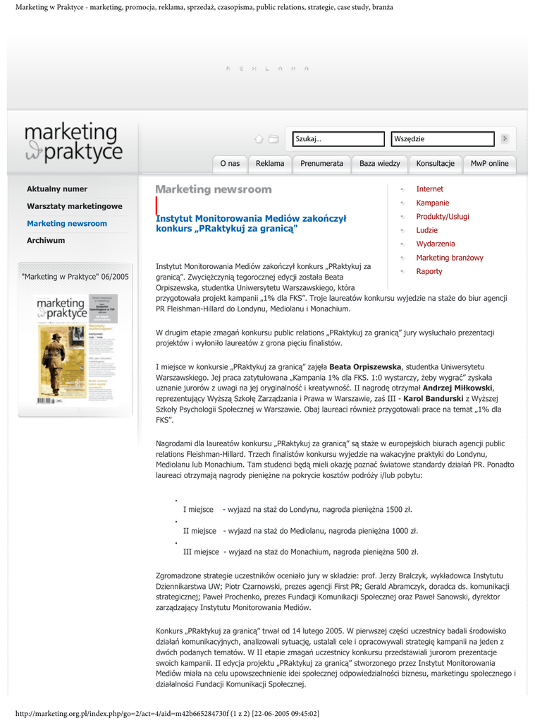 Marketing w Praktyce - marketing, promocja, reklama, sprzedaż, czasopisma, public relations, strategie, case study, branża Szukaj... O nas Reklama Prenumerata Wszędzie Baza wiedzy Konsultacje Aktualny numer Internet Warsztaty marketingowe Kampanie Marketing newsroom Instytut Monitorowania Mediów zakończył konkurs „PRaktykuj za granicą" Archiwum "Marketing w Praktyce" 06/2005 MwP online Produkty/Usługi Ludzie Wydarzenia Marketing branżowy Instytut Monitorowania Mediów zakończył konkurs „PRaktykuj za Raporty granicą”. Zwyciężczynią tegorocznej edycji została Beata Orpiszewska, studentka Uniwersytetu Warszawskiego, która przygotowała projekt kampanii „1% dla FKS”. Troje laureatów konkursu wyjedzie na staże do biur agencji PR Fleishman-Hillard do Londynu, Mediolanu i Monachium. W drugim etapie zmagań konkursu public relations „PRaktykuj za granicą” jury wysłuchało prezentacji projektów i wyłoniło laureatów z grona pięciu finalistów. I miejsce w konkursie „PRaktykuj za granicą” zajęła Beata Orpiszewska, studentka Uniwersytetu Warszawskiego. Jej praca zatytułowana „Kampania 1% dla FKS. 1:0 wystarczy, żeby wygrać” zyskała uznanie jurorów z uwagi na jej oryginalność i kreatywność. II nagrodę otrzymał Andrzej Miłkowski, reprezentujący Wyższą Szkołę Zarządzania i Prawa w Warszawie, zaś III - Karol Bandurski z Wyższej Szkoły Psychologii Społecznej w Warszawie. Obaj laureaci również przygotowali prace na temat „1% dla FKS”. Nagrodami dla laureatów konkursu „PRaktykuj za granicą” są staże w europejskich biurach agencji public relations Fleishman-Hillard. Trzech finalistów konkursu wyjedzie na wakacyjne praktyki do Londynu, Mediolanu lub Monachium. Tam studenci będą mieli okazję poznać światowe standardy działań PR. Ponadto laureaci otrzymają nagrody pieniężne na pokrycie kosztów podróży i/lub pobytu: ● I miejsce - wyjazd na staż do Londynu, nagroda pieniężna 1500 zł. ● II miejsce - wyjazd na staż do Mediolanu, nagroda pieniężna 1000 zł. ● III miejsce - wyjazd na staż do Monachium, nagroda pieniężna 500 zł. Zgromadzone strategie uczestników oceniało jury w składzie: prof. Jerzy Bralczyk, wykładowca Instytutu Dziennikarstwa UW; Piotr Czarnowski, prezes agencji First PR; Gerald Abramczyk, doradca ds. komunikacji strategicznej; Paweł Prochenko, prezes Fundacji Komunikacji Społecznej oraz Paweł Sanowski, dyrektor zarządzający Instytutu Monitorowania Mediów. Konkurs „PRaktykuj za granicą” trwał od 14 lutego 2005. W pierwszej części uczestnicy badali środowisko działań komunikacyjnych, analizowali sytuację, ustalali cele i opracowywali strategię kampanii na jeden z dwóch podanych tematów. W II etapie zmagań uczestnicy konkursu przedstawiali jurorom prezentacje swoich kampanii. II edycja projektu „PRaktykuj za granicą” stworzonego przez Instytut Monitorowania Mediów miała na celu upowszechnienie idei społecznej odpowiedzialności biznesu, marketingu społecznego i działalności Fundacji Komunikacji Społecznej. http://marketing.org.pl/index.php/go=2/act=4/aid=m42b665284730f (1 z 2) [22-06-2005 09:45:02] Marketing w Praktyce - marketing, promocja, reklama, sprzedaż, czasopisma, public relations, strategie, case study, branża 20.06.2005 INTERIA.PL zmieniła stronę główną Laureaci Trzeciej Edycji Belvedere International Achievement Awards Kampania dotyczaca segregacja odpadow ESKADRA Promarket zdobyła DWA BOOMERANGI Amerykański klient agencji SUPERMEDIA Interactive Oko w oko z ekspertem Czynniki sukcesu w 2010 roku – według raportu Economist Itelligence Unit góra | strona główna ul. Felińskiego 56/1 01-563 Warszawa tel / fax: (022) 839 07 23 e-mail: [email protected] http://marketing.org.pl/index.php/go=2/act=4/aid=m42b665284730f (2 z 2) [22-06-2005 09:45:02] Program bs4- CRM : bs4