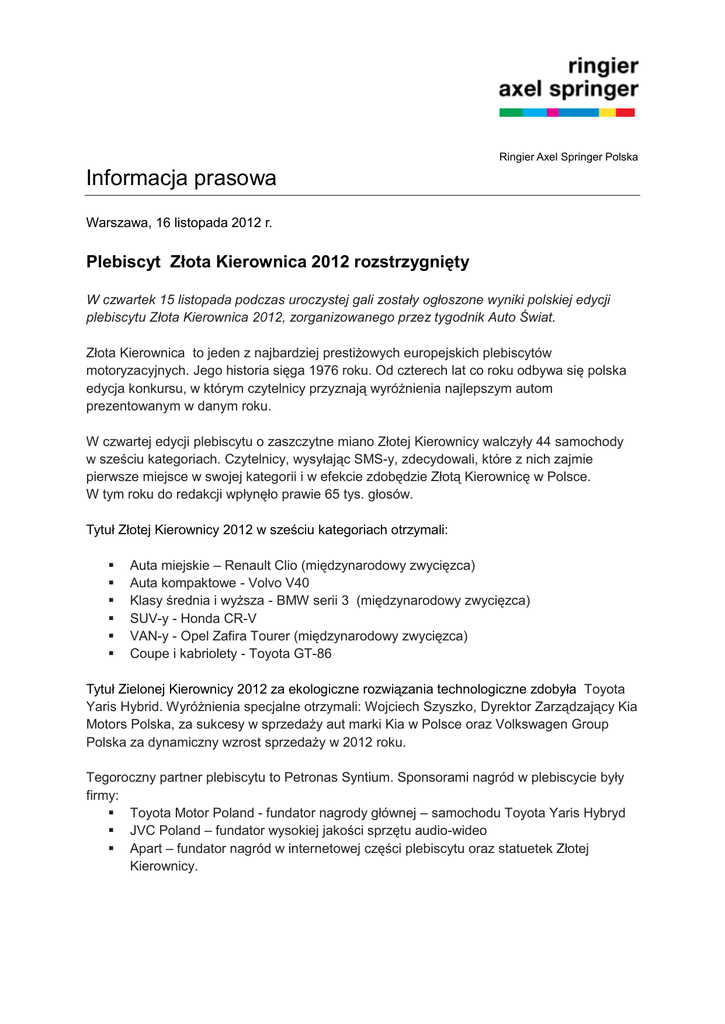 Ringier Axel Springer Polska Informacja prasowa Warszawa, 16 listopada 2012 r. Plebiscyt Złota Kierownica 2012 rozstrzygnięty W czwartek 15 listopada podczas uroczystej gali zostały ogłoszone wyniki polskiej edycji plebiscytu Złota Kierownica 2012, zorganizowanego przez tygodnik Auto Świat. Złota Kierownica to jeden z najbardziej prestiżowych europejskich plebiscytów motoryzacyjnych. Jego historia sięga 1976 roku. Od czterech lat co roku odbywa się polska edycja konkursu, w którym czytelnicy przyznają wyróżnienia najlepszym autom prezentowanym w danym roku. W czwartej edycji plebiscytu o zaszczytne miano Złotej Kierownicy walczyły 44 samochody w sześciu kategoriach. Czytelnicy, wysyłając SMS-y, zdecydowali, które z nich zajmie pierwsze miejsce w swojej kategorii i w efekcie zdobędzie Złotą Kierownicę w Polsce. W tym roku do redakcji wpłynęło prawie 65 tys. głosów. Tytuł Złotej Kierownicy 2012 w sześciu kategoriach otrzymali: Auta miejskie – Renault Clio (międzynarodowy zwycięzca) Auta kompaktowe - Volvo V40 Klasy średnia i wyższa - BMW serii 3 (międzynarodowy zwycięzca) SUV-y - Honda CR-V VAN-y - Opel Zafira Tourer (międzynarodowy zwycięzca) Coupe i kabriolety - Toyota GT-86 Tytuł Zielonej Kierownicy 2012 za ekologiczne rozwiązania technologiczne zdobyła Toyota Yaris Hybrid. Wyróżnienia specjalne otrzymali: Wojciech Szyszko, Dyrektor Zarządzający Kia Motors Polska, za sukcesy w sprzedaży aut marki Kia w Polsce oraz Volkswagen Group Polska za dynamiczny wzrost sprzedaży w 2012 roku. Tegoroczny partner plebiscytu to Petronas Syntium. Sponsorami nagród w plebiscycie były firmy: Toyota Motor Poland - fundator nagrody głównej – samochodu Toyota Yaris Hybryd JVC Poland – fundator wysokiej jakości sprzętu audio-wideo Apart – fundator nagród w internetowej części plebiscytu oraz statuetek Złotej Kierownicy. Kontakt: Anna Gancarz-Luboń rzecznik prasowy Tel. +48 22 232 14 03 Kom. +48 500 121 967 [email protected] *** Ringier Axel Springer Polska istnieje na rynku od 1994 roku. Od 2010 roku firma jest częścią międzynarodowej spółki medialnej Ringier Axel Springer Media AG, która działa również w Czechach, na Słowacji i w Serbii. Portfolio wydawcy obejmuje FAKT, największą pod względem sprzedaży gazetę w Polsce, dwa dzienniki sportowe – ogólnopolski Przegląd Sportowy i regionalny Sport, a także tygodnik Newsweek Polska, miesięcznik biznesowy Forbes, czasopisma komputerowe (m.in. Komputer Świat) i motoryzacyjne (m.in. Auto Świat, Top Gear). Spółka posiada również ponad 20 serwisów internetowych, a wśród nich portale informacyjne, serwisy sportowe, lifestylowe, motoryzacyjne, komputerowe i e-commerce. Ringier Axel Springer Polska posiada także 49 proc. udziałów w spółce INFOR Biznes, wydawcy Dziennika Gazety Prawnej.