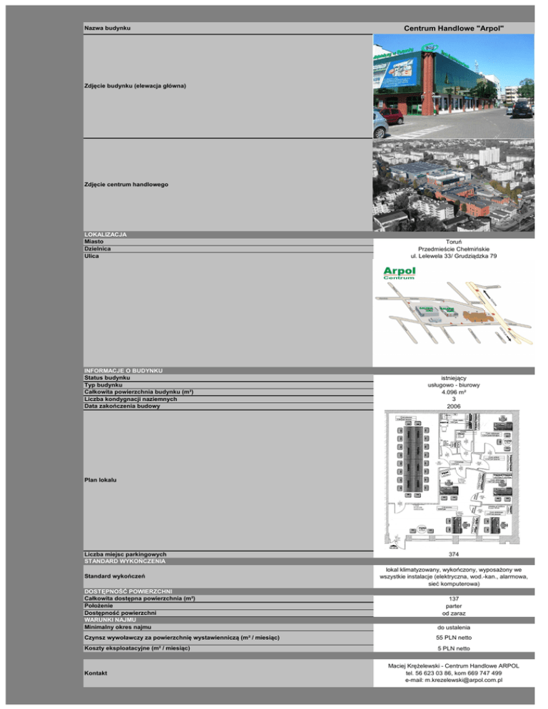 Nazwa budynku Centrum Handlowe "Arpol" Zdjęcie budynku (elewacja główna) Zdjęcie centrum handlowego LOKALIZACJA Miasto Dzielnica Ulica INFORMACJE O BUDYNKU Status budynku Typ budynku Całkowita powierzchnia budynku (m²) Liczba kondygnacji naziemnych Data zakończenia budowy Toruń Przedmieście Chełmińskie ul. Lelewela 33/ Grudziądzka 79 istniejący usługowo - biurowy 4.096 m² 3 2006 Plan lokalu Liczba miejsc parkingowych STANDARD WYKOŃCZENIA Standard wykończeń 374 lokal klimatyzowany, wykończony, wyposażony we wszystkie instalacje (elektryczna, wod.-kan., alarmowa, sieć komputerowa) DOSTĘPNOŚĆ POWIERZCHNI Całkowita dostępna powierzchnia (m²) Położenie Dostępność powierzchni WARUNKI NAJMU Minimalny okres najmu do ustalenia Czynsz wywoławczy za powierzchnię wystawienniczą (m² / miesiąc) 55 PLN netto Koszty eksploatacyjne (m² / miesiąc) 5 PLN netto Kontakt 137 parter od zaraz Maciej Krężelewski - Centrum Handlowe ARPOL tel. 56 623 03 86, kom 669 747 499 e-mail: [email protected]