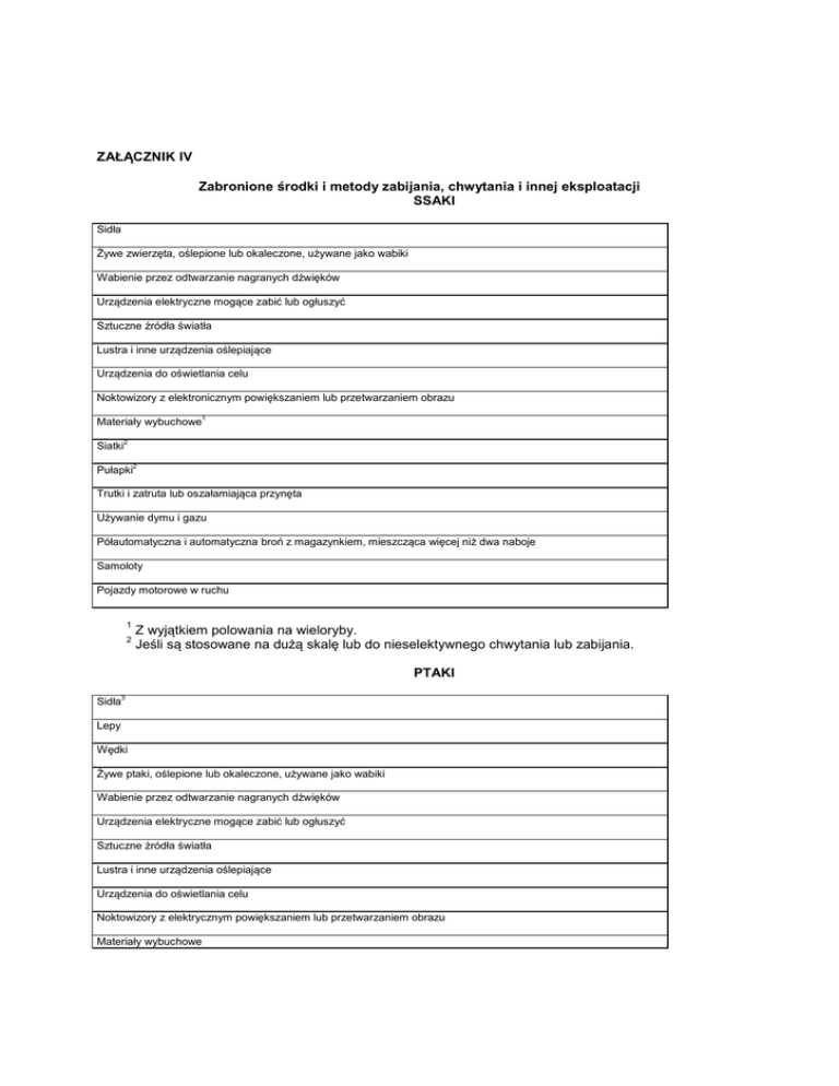 ZAŁĄCZNIK IV Zabronione środki i metody zabijania, chwytania i innej eksploatacji SSAKI Sidła Żywe zwierzęta, oślepione lub okaleczone, używane jako wabiki Wabienie przez odtwarzanie nagranych dźwięków Urządzenia elektryczne mogące zabić lub ogłuszyć Sztuczne źródła światła Lustra i inne urządzenia oślepiające Urządzenia do oświetlania celu Noktowizory z elektronicznym powiększaniem lub przetwarzaniem obrazu Materiały wybuchowe1 2 Siatki Pułapki2 Trutki i zatruta lub oszałamiająca przynęta Używanie dymu i gazu Półautomatyczna i automatyczna broń z magazynkiem, mieszcząca więcej niż dwa naboje Samoloty Pojazdy motorowe w ruchu 1 2 Z wyjątkiem polowania na wieloryby. Jeśli są stosowane na dużą skalę lub do nieselektywnego chwytania lub zabijania. PTAKI Sidła3 Lepy Wędki Żywe ptaki, oślepione lub okaleczone, używane jako wabiki Wabienie przez odtwarzanie nagranych dźwięków Urządzenia elektryczne mogące zabić lub ogłuszyć Sztuczne źródła światła Lustra i inne urządzenia oślepiające Urządzenia do oświetlania celu Noktowizory z elektrycznym powiększaniem lub przetwarzaniem obrazu Materiały wybuchowe Siatki Pułapki Trutki i zatruta lub oszałamiająca przynęta Półautomatyczna i automatyczna broń z magazynkiem mieszczącym więcej niż dwa naboje Samoloty Pojazdy motorowe w ruchu 3 Z wyjątkiem Lagopus (pardwa) na północ od 58 N. RYBY SŁODKOWODNE Materiały wybuchowe Broń palna Trucizny Środki oszałamiające Zmienny prąd elektryczny Sztuczne źródła światła SKORUPIAKI (Decapoda) Materiały wybuchowe Trucizny