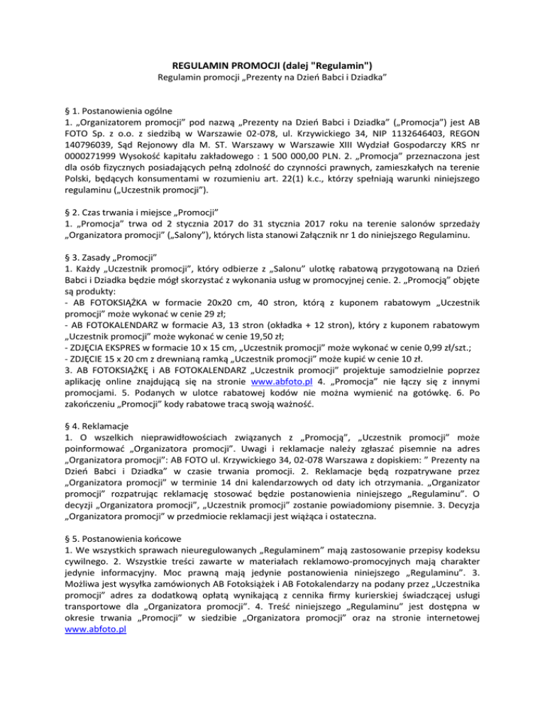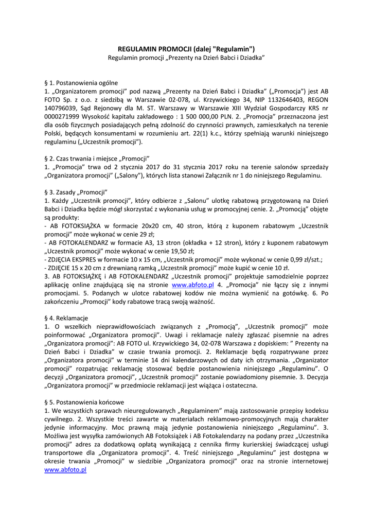 REGULAMIN PROMOCJI (dalej "Regulamin") Regulamin promocji „Prezenty na Dzieo Babci i Dziadka” § 1. Postanowienia ogólne 1. „Organizatorem promocji” pod nazwą „Prezenty na Dzieo Babci i Dziadka” („Promocja”) jest AB FOTO Sp. z o.o. z siedzibą w Warszawie 02-078, ul. Krzywickiego 34, NIP 1132646403, REGON 140796039, Sąd Rejonowy dla M. ST. Warszawy w Warszawie XIII Wydział Gospodarczy KRS nr 0000271999 Wysokośd kapitału zakładowego : 1 500 000,00 PLN. 2. „Promocja” przeznaczona jest dla osób fizycznych posiadających pełną zdolnośd do czynności prawnych, zamieszkałych na terenie Polski, będących konsumentami w rozumieniu art. 22(1) k.c., którzy spełniają warunki niniejszego regulaminu („Uczestnik promocji”). § 2. Czas trwania i miejsce „Promocji” 1. „Promocja” trwa od 2 stycznia 2017 do 31 stycznia 2017 roku na terenie salonów sprzedaży „Organizatora promocji” („Salony”), których lista stanowi Załącznik nr 1 do niniejszego Regulaminu. § 3. Zasady „Promocji” 1. Każdy „Uczestnik promocji”, który odbierze z „Salonu” ulotkę rabatową przygotowaną na Dzieo Babci i Dziadka będzie mógł skorzystad z wykonania usług w promocyjnej cenie. 2. „Promocją” objęte są produkty: - AB FOTOKSIĄŻKA w formacie 20x20 cm, 40 stron, którą z kuponem rabatowym „Uczestnik promocji” może wykonad w cenie 29 zł; - AB FOTOKALENDARZ w formacie A3, 13 stron (okładka + 12 stron), który z kuponem rabatowym „Uczestnik promocji” może wykonad w cenie 19,50 zł; - ZDJĘCIA EKSPRES w formacie 10 x 15 cm, „Uczestnik promocji” może wykonad w cenie 0,99 zł/szt.; - ZDJĘCIE 15 x 20 cm z drewnianą ramką „Uczestnik promocji” może kupid w cenie 10 zł. 3. AB FOTOKSIĄŻKĘ i AB FOTOKALENDARZ „Uczestnik promocji” projektuje samodzielnie poprzez aplikację online znajdującą się na stronie www.abfoto.pl 4. „Promocja” nie łączy się z innymi promocjami. 5. Podanych w ulotce rabatowej kodów nie można wymienid na gotówkę. 6. Po zakooczeniu „Promocji” kody rabatowe tracą swoją ważnośd. § 4. Reklamacje 1. O wszelkich nieprawidłowościach związanych z „Promocją”, „Uczestnik promocji” może poinformowad „Organizatora promocji”. Uwagi i reklamacje należy zgłaszad pisemnie na adres „Organizatora promocji”: AB FOTO ul. Krzywickiego 34, 02-078 Warszawa z dopiskiem: ” Prezenty na Dzieo Babci i Dziadka” w czasie trwania promocji. 2. Reklamacje będą rozpatrywane przez „Organizatora promocji” w terminie 14 dni kalendarzowych od daty ich otrzymania. „Organizator promocji” rozpatrując reklamację stosowad będzie postanowienia niniejszego „Regulaminu”. O decyzji „Organizatora promocji”, „Uczestnik promocji” zostanie powiadomiony pisemnie. 3. Decyzja „Organizatora promocji” w przedmiocie reklamacji jest wiążąca i ostateczna. § 5. Postanowienia koocowe 1. We wszystkich sprawach nieuregulowanych „Regulaminem” mają zastosowanie przepisy kodeksu cywilnego. 2. Wszystkie treści zawarte w materiałach reklamowo-promocyjnych mają charakter jedynie informacyjny. Moc prawną mają jedynie postanowienia niniejszego „Regulaminu”. 3. Możliwa jest wysyłka zamówionych AB Fotoksiążek i AB Fotokalendarzy na podany przez „Uczestnika promocji” adres za dodatkową opłatą wynikającą z cennika firmy kurierskiej świadczącej usługi transportowe dla „Organizatora promocji”. 4. Treśd niniejszego „Regulaminu” jest dostępna w okresie trwania „Promocji” w siedzibie „Organizatora promocji” oraz na stronie internetowej www.abfoto.pl Załącznik nr 1 – Lista Salonów „Organizatora promocji” BB1_BB _X25 9.00-21.00 Galeria Sfera ul. Mostowa 2, 43-300 Bielsko-Biała tel. 33/484 22 51 kom. 665-353-381, [email protected] BI1_D _X22 9.00-21.00 Alfa Białystok ul. Świętojaoska 15, 15-277 Białystok, tel. 85/ 741-82-58 kom. 509-665-355, [email protected] BY4_X33 9.00-21.00 Zielone Arkady Al. Wojska Polskiego 1, 85-171 Bydgoszcz Tel. 52/342-78-34 kom. 665-353-307, [email protected] DG2_DG _X28 9.00-21.00 Centrum Handlowe Pogoria ul. Jana III Sobieskiego 6, 42-530 Dąbrowa Górnicza Tel. 32/261-20-60 kom. 665 353 344 ,[email protected] GD2 _C _X03 9.00-21.00 Galeria Madison ul. Rajska 10, 80-850 Gdaosk tel. 58/ 690-80-20 kom. 665-353-328, [email protected] KI1_H _X23 10.00-21.00 Galeria Korona Kielce ul. Warszawska 26, 25-317 Kielce tel. 41/ 201-31-83 kom. 509 665 220 ,[email protected] KR4 _ T _X19 10.00-21.00 Centrum Handlowe Bonarka ul. Kamioskiego 11, 30-644 Kraków tel. 12/ 298-67-03 kom. 665-353-301, [email protected] KR5_KK _X26 10.00-21.00 Galeria Kazimierz ul. Podgórska 34, 31-536 Kraków tel. 12/ 42-64-688 kom. 509-665-282, [email protected] LO1 _ W _X21 10.00-22.00 CH Manufaktura ul. Ogrodowa 19, 91-065 Łódź, Tel. 42/ 630-20-38 kom. 665-353-310, [email protected] LU1_LU_X29 9.00-21.00 CH Atrium Felicity Al. Wincentego Witosa 32, 20-315 Lublin, Tel. 81/452-88-48 kom. 665-353-321, [email protected] ON2 _ OA _X31 9.00-21.00 Galeria Aura Al. Marszałka Józefa Piłsudskiego 16, 10-576 Olsztyn tel. 89/ 542-4340 kom. 665-353-329, [email protected] PN1 _G _X07 9.00-21.00 Stary Browar ul. Półwiejska 42, 61-888 Poznao tel. 61/ 859-63-38 kom. 665-353-316, [email protected] PN4_PP_X35 10.00-22.00 Posnania ul. Pleszewska 1, 61-136 Poznao tel. 61/ 646-31-76 kom. 518-307-196, [email protected] RZ1 _ U _X20 10.00-21.00 Millenium Hall al. Majora Wacława Kopisto 1, 35-315 Rzeszów tel. 17/ 770 04-20 kom. 665-353-302, [email protected] RZ2 _ RR _X30 9.00-21.00 Galeria Rzeszów ul. Piłsudskiego 44 , 35-005 Rzeszów tel. 17/ 777-10-72 kom. 509-665-017, [email protected] SZ1_ SZ_4.3.1 X27 9.00-21.00 Centrum Handlowe Galaxy Al. Wyzwolenia 18, 70-554 Szczecin tel. 91/ 311- 55- 85 kom. 509 665 948, [email protected] TO3 _J _X10 9.00-21.00 Galeria Handlowa Bielawy ul. Olsztyoska 8, 87-100 Toruo tel. 56/ 662-53-50 kom. 665-353-324, [email protected] T