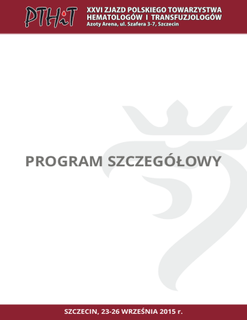 XXVI ZJAZD POLSKIEGO TOWARZYSTWA HEMATOLOGÓW I TRANSFUZJOLOGÓW Azoty Arena, ul. Szafera 3-7, Szczecin PROGRAM SZCZEGÓŁOWY SZCZECIN, 23-26 WRZEŚNIA 2015 r. czwartek, 24.09.2015 r. PROGRAM SZCZEGÓŁOWY 08.00 - 09.30 sala RUDOLF VIRCHOW Standaryzacja w biologii molekularnej Przewodniczący: K. Lewandowski (Poznań) Współprzewodniczący: T. Sacha (Kraków), M. Gniot (Poznań) 1. Challenges in molecular standardisation N. Cross (Wielka Brytania) 2. Standardisation of MPN PCR analyses N. Pallisgaard (Dania) Prezentacje ustne: 1. Molekularne monitorowanie leczenia przewlekłej białaczki szpikowej – czynniki prognostyczne i dynamika odpowiedzi M. Gniot (Poznań) M. Gniot, K. Lewandowski, M. Lewandowska, A. Lehmann-Kopydłowska, R. Kroll-Balcerzak, A. Balcerzak, M. Iwoła, M. Komarnicki 2. Udoskonalenie diagnostyki talasemii oraz analiza mutacji występujących u polskich chorych J. Skulimowska (Warszawa) J. Skulimowska, E. Klimczak-Jajor, P. Turowski, H. Pyl, K. Guz, J. Spychalska, E. Gołaszewska, M. Uhrynowska, E. Mendek-Czajkowska, E. Brojer 08.30 - 09.30 sala ELHARD LUBINUS Śniadanie edukacyjne Diagnostyka i leczenie nocnej napadowej hemoglobinurii. Ukryte poważne zagrożenia i widoczne skutki leczenia 08.30 - 10.00 sala WILHELM MEYER-SCHWARTAU Rola mikroskopowania w hematologii - sesja interaktywna Przewodniczący: K. Sułek (Warszawa) Współprzewodniczący: A. Deptała (Warszawa) 08.30 - 10.00 sala CARL LOEWE Ostre białaczki u młodzieży i młodych dorosłych Przewodniczący: J. Kowalczyk (Lublin) Współprzewodniczący: W. Balwierz (Kraków) 1. Acute lymphoblastic leukemia in teenage and young adult patients: successes and challenges R. Hough (Wielka Brytania) XXVI ZJAZD POLSKIEGO TOWARZYSTWA HEMATOLOGÓW I TRANSFUZJOLOGÓW czwartek, 24.09.2015 r. PROGRAM SZCZEGÓŁOWY 2. AML in teenagers and young adults D. Reinhardt (Niemcy) 3. Problemy psychospołeczne nastoletnich i młodych dorosłych pacjentów z chorobą nowotworową M. Samardakiewicz (Lublin) Prezentacje ustne: 1. Stadium zaawansowania nowotworu a remisja u dzieci i młodzieży leczonych w Klinice Onkologii, Hematologii i Transplantologii Pediatrycznej Uniwersytetu Medycznego w Poznaniu w latach 20062013 M. Wesołowska (Poznań) M. Wesołowska, P. Szymańska, M. Smorowska, J. Wachowiak, K. Derwich 2. Wyniki leczenia młodzieży z ostrą białaczką szpikową wg protokołu AML-BFM 2004 Interim w ośrodkach Polskiej Grupy Pediatrycznej ds. Leczenia Białaczek i Chłoniaków W. Balwierz (Kraków) W. Balwierz, M. Czogała, K. Pawińska-Wąsikowska, W. Badowska, A. Balcerska, A. Chybicka, E. Kamieńska, I. Karpińska-Derda, S. Kołtan, J. Kowalczyk, M. Krawczuk-Rybak, L. Maciejka-Kembłowska, M. Matysiak, A. Mizia-Malarz, W. Młynarski, K. Muszyńska-Rosłan, J. Pohorecka, K. Potocka, B. Sikorska–Fic, J. Skalska-Sadowska, G. Sobol-Milejska, M. Stolarska, T. Szczepański, R. Tomaszewska, T. Urasiński, J. Wachowiak, H. Wiśniewska-Ślusarz, M. Wysocki 09.30 - 10.30 sala ELHARD LUBINUS Inwazyjne zakażenia grzybicze - profilaktyka i leczenie Przewodniczący: W. W. Jędrzejczak (Warszawa) 1. Inwazyjne zakażenia grzybicze - diagnostyka i terapia M. Bieniaszewska (Gdańsk) 2. Farmakokinetyka azoli w aspekcie profilaktyki i leczenia inwazyjnych grzybic układowych - rola pozakonazolu. i.v. K. Kałwak (Wrocław) 09.30 - 11.15 sala GRYFITÓW Zebranie Wyborcze Sekcji Transfuzjologicznej XXVI ZJAZD POLSKIEGO TOWARZYSTWA HEMATOLOGÓW I TRANSFUZJOLOGÓW czwartek, 24.09.2015 r. PROGRAM SZCZEGÓŁOWY 10.00 - 11.30 sala WILHELM MEYER-SCHWARTAU Bezpieczeństwo i komfort terapii lekami rekombinowanymi Prowadzący: K. Zawilska (Poznań), J. Windyga (Warszawa) 1. Zalety leków rekombinowanych z punktu widzenia lekarza J. Windyga (Warszawa) 2. Znaczenie leków rekombinowanych dla pacjenta z hemofilią B. Gajewski (Warszawa) 3. Turoktokog alfa – nowa cząsteczka rekombinowanego czynnika VIII dla pacjentów z hemofilią A A. Klukowska (Warszawa) 4. Eptakog alfa (NovoSeven®) – rekombinowany aktywowany czynnik VII dla pacjentów z hemofilią powikłaną inhibitorem A. Mital (Gdańsk) 5. Kompleksowa terapia lekami rekombinowanymi w hemofilii powikłanej i niepowikłanej inhibitorem K. Zawilska (Poznań) Dyskusja 10.00 - 11.30 sala RUDOLF VIRCHOW Wyzwania współczesnej hematologii. Mielofibroza, czerwienica prawdziwa, stany nadmiaru żelaza w organizmie – czas na fakty Moderator: J. Góra-Tybor (Warszawa) 1. Przyczyny, objawy oraz sposoby leczenia nadmiaru żelaza w organizmie. Praktyczne aspekty diagnostyczne i terapeutyczne K. Kałwak (Wrocław) 2. Czynniki rokownicze w mielofibrozie a wybór optymalnej terapii J. Góra-Tybor (Warszawa) 3. Czerwienica prawdziwa - rzadki zespół mieloproliferacyjny. Współczesna diagnostyka i terapia T. Wróbel (Wrocław) 10.00 - 10.45 sala CARL LOEWE Sesja satelitarna XXVI ZJAZD POLSKIEGO TOWARZYSTWA HEMATOLOGÓW I TRANSFUZJOLOGÓW czwartek, 24.09.2015 r. PROGRAM SZCZEGÓŁOWY 10.45 - 12.15 sala ELHARD LUBINUS Leczenie pacjentów z nowotworami układu limfoidalnego (CLL/chłoniaki indolentne) i chorobami współistniejącymi Przewodniczący: T. Robak (Łódź) 1. Pacjenci z nowotworami układu limfoidalnego: epidemiologia i dane demograficzne T. Robak (Łódź) 2. Przewlekła białaczka limfocytowa jako choroba ludzi starszych I. Hus (Lublin) 3. Czym się kierować w doborze leków u pacjentów z przewlekłą białaczką limfocytową i chorobami współistniejącymi? J. Walewski (Warszawa) 4. Czym się kierować w doborze leków u pacjentów z chłoniakami grudkowymi i chorobami współistniejącymi? W. Jurczak (Kraków) 5. Pacjent z nowotworem układu limfoidalnego i ze schorzeniami układu sercowo-naczyniowego S. Szmit (Warszawa) 6. Pacjenci z nowotworem układu limfoidalnego i ze schorzeniami nerek 10.45 - 12.15 sala CARL LOEWE Sponsorowana Sesja Edukacyjna Szpiczak plazmocytowy: diagnostyka a decyzje terapeutyczne 1. Nowoczesne techniki w diagnostyce szpiczaka plazmocytowego W. Gorczyca (USA) 