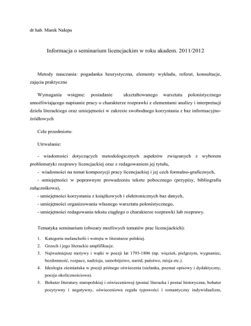 dr hab. Marek Nalepa Informacja o seminarium licencjackim w roku akadem. 2011/2012 Metody nauczania: pogadanka heurystyczna, elementy wykładu, referat, konsultacje, zajęcia praktyczne Wymagania wstępne: posiadanie ukształtowanego warsztatu polonistycznego umoŜliwiającego napisanie pracy o charakterze rozprawki z elementami analizy i interpretacji dzieła literackiego oraz umiejętności w zakresie swobodnego korzystania z baz informacyjnoźródłowych Cele przedmiotu: Utrwalanie: - wiadomości dotyczących metodologicznych aspektów związanych z wyborem problematyki rozprawy licencjackiej oraz z redagowaniem jej tytułu, - wiadomości na temat kompozycji pracy licencjackiej i jej cech formalno-graficznych, - umiejętności w poprawnym prowadzeniu tekstu pobocznego (przypisy, bibliografia załącznikowa), - umiejętności korzystania z ksiąŜkowych i elektronicznych baz danych, - umiejętności organizowania własnego warsztatu polonistycznego, - umiejętności redagowania tekstu ciągłego o charakterze rozprawki lub rozprawy. Tematyka seminarium (obszary moŜliwych tematów prac licencjackich): 1. Kategoria melancholii i wstrętu w literaturze polskiej. 2. Grzech i jego literackie amplifikacje. 3. NajwaŜniejsze motywy i wątki w poezji lat 1793-1806 (np. więzień, pielgrzym, wygnaniec, bezdomność, rozpacz, nadzieja, samobójstwo, naród, państwo, misja etc.). 4. Ideologia ziemiańska w poezji późnego oświecenia (sielanka, poemat opisowy i dydaktyczny, poezja okolicznościowa). 5. Bohater literatury staropolskiej i oświeceniowej (postać literacka i postać historyczna, bohater pozytywny i negatywny, oświeceniowa reguła typowości i romantyczny indywidualizm, wzorce osobowe, róŜne typy bohatera związane z pełnionymi funkcjami społecznymi, przynaleŜnością środowiskową i zawodową, wiekiem etc, np. dziecko, kobieta, matka, Ŝona modna, mieszczanin, dworzanin, błazen, Ŝołnierz, ksiądz, kochanek, mąŜ, libertyn etc.) 6. śałoba ojca i matki po stracie dziecka na przykładzie wybranych utworów literatury polskiej. 7. Męska perspektywa postrzegania kobiecości na wybranych przykładach literackich – „od uwielbienia do wzgardy”. 8. Edytorstwo tekstów oświeceniowych. 9. Poezja okolicznościowa w Polsce w l.1730-1830.