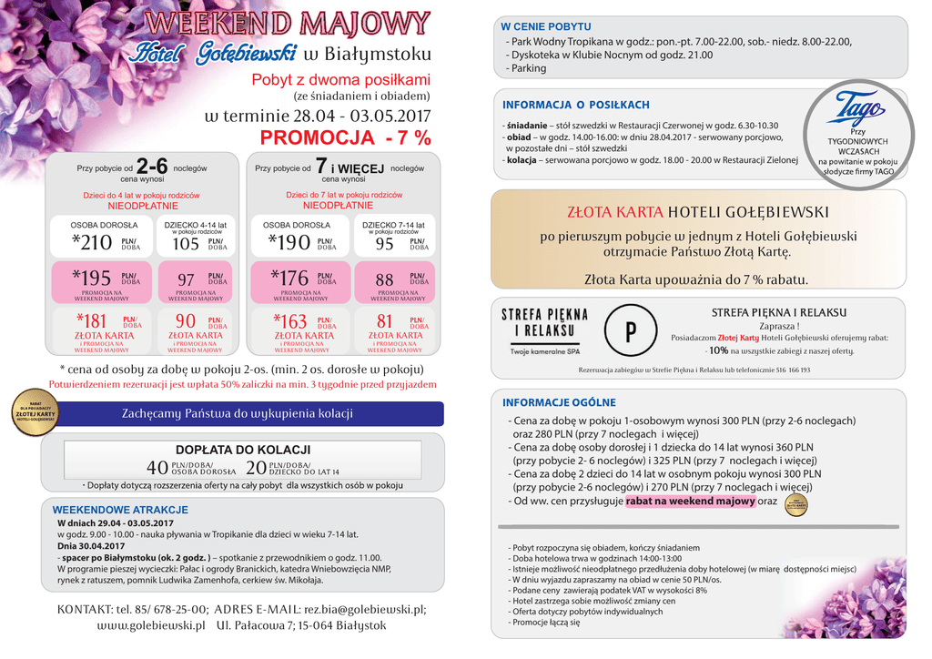 WEEKEND MAJOWY w Białymstoku Pobyt z dwoma posiłkami W CENIE POBYTU - Park Wodny Tropikana w godz.: pon.-pt. 7.00-22.00, sob.- niedz. 8.00-22.00, - Dyskoteka w Klubie Nocnym od godz. 21.00 - Parking (ze śniadaniem i obiadem) w terminie 28.04 - 03.05.2017 PROMOCJA - 7 % 2-6 noclegów Przy pobycie od cena wynosi Przy pobycie od noclegów cena wynosi Dzieci do 7 lat w pokoju rodziców Dzieci do 4 lat w pokoju rodziców NIEODPŁATNIE NIEODPŁATNIE OSOBA DOROSŁA 7 i WIĘCEJ DZIECKO 4-14 lat w pokoju rodziców OSOBA DOROSŁA ZŁOTA KARTA HOTELI GOŁĘBIEWSKI DZIECKO 7-14 lat w pokoju rodziców *210 PLN/ DOBA 105 PLN/ DOBA *190 PLN/ DOBA 95 PLN/ DOBA *195 PLN/ DOBA 97 PLN/ DOBA *176 PLN/ DOBA 88 PLN/ DOBA *181 PLN PLN/ DOBA *163 PLN PLN/ DOBA PROMOCJA NA WEEKEND MAJOWY - śniadanie – stół szwedzki w Restauracji Czerwonej w godz. 6.30-10.30 - obiad – w godz. 14.00-16.00: w dniu 28.04.2017 - serwowany porcjowo, w pozostałe dni – stół szwedzki - kolacja – serwowana porcjowo w godz. 18.00 - 20.00 w Restauracji Zielonej PROMOCJA NA WEEKEND MAJOWY 90 PROMOCJA NA WEEKEND MAJOWY PLN PLN/ DOBA ZŁOTA KARTA ZŁOTA KARTA i PROMOCJA NA WEEKEND MAJOWY i PROMOCJA NA WEEKEND MAJOWY po pierwszym pobycie w jednym z Hoteli Gołębiewski otrzymacie Państwo Złotą Kartę. Złota Karta upoważnia do 7 % rabatu. PROMOCJA NA WEEKEND MAJOWY 81 PLN PLN/ DOBA ZŁOTA KARTA ZŁOTA KARTA i PROMOCJA NA WEEKEND MAJOWY i PROMOCJA NA WEEKEND MAJOWY * cena od osoby za dobę w pokoju 2-os. (min. 2 os. dorosłe w pokoju) STREFA PIĘKNA I RELAKSU Zaprasza ! Posiadaczom Złotej Karty Hoteli Gołębiewski oferujemy rabat: - 10% na wszystkie zabiegi z naszej oferty. Rezerwacja zabiegów w Strefie Piękna i Relaksu lub telefonicznie 516 166 193 Potwierdzeniem rezerwacji jest wpłata 50% zaliczki na min. 3 tygodnie przed przyjazdem HOTELI GOŁĘBIEWSKI Zachęcamy Państwa do wykupienia kolacji DOPŁATA DO KOLACJI 40 20 WEEKENDOWE ATRAKCJE W dniach 29.04 - 03.05.2017 w godz. 9.00 - 10.00 - nauka pływania w Tropikanie dla dzieci w wieku 7-14 lat. Dnia 30.04.2017 - spacer po Białymstoku (ok. 2 godz. ) – spotkanie z przewodnikiem o godz. 11.00. W programie pieszej wycieczki: Pałac i ogrody Branickich, katedra Wniebowzięcia NMP, rynek z ratuszem, pomnik Ludwika Zamenhofa, cerkiew św. Mikołaja. KONTAKT: tel. 85/ 678-25-00; ADRES E-MAIL: [email protected]; www.golebiewski.pl Ul. Pałacowa 7; 15-064 Białystok - Cena za dobę w pokoju 1-osobowym wynosi 300 PLN (przy 2-6 noclegach) oraz 280 PLN (przy 7 noclegach i więcej) - Cena za dobę osoby dorosłej i 1 dziecka do 14 lat wynosi 360 PLN (przy pobycie 2- 6 noclegów) i 325 PLN (przy 7 noclegach i więcej) - Cena za dobę 2 dzieci do 14 lat w osobnym pokoju wynosi 300 PLN (przy pobycie 2-6 noclegów) i 270 PLN (przy 7 noclegach i więcej) - Od ww. cen przysługuje rabat na weekend majowy oraz HOTELI GOŁĘBIEWSKI - Pobyt rozpoczyna się obiadem, kończy śniadaniem - Doba hotelowa trwa w godzinach 14:00-13:00 - Istnieje możliwość nieodpłatnego przedłużenia doby hotelowej (w miarę dostępności miejsc) - W dniu wyjazdu zapraszamy na obiad w cenie 50 PLN/os. - Podane ceny zawierają podatek VAT w wysokości 8% - Hotel zastrzega sobie możliwość zmiany cen - Oferta dotyczy pobytów indywidualnych - Promocje łączą się