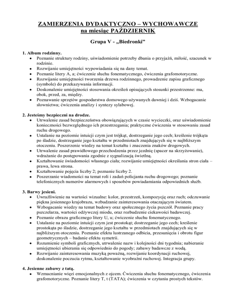 ZAMIERZENIA DYDAKTYCZNO – WYCHOWAWCZE na miesiąc PAŹDZIERNIK Grupa V - „Biedronki” 1. Album rodzinny. Poznanie struktury rodziny, uświadomienie potrzeby dbania o przyjaźń, miłość, szacunek w rodzinie. Rozwijanie umiejętności wypowiadania się na dany temat. Poznanie litery A, a; ćwiczenie słuchu fonematycznego, ćwiczenia grafomotoryczne. Rozwijanie umiejętności tworzenia drzewa rodzinnego, prowadzenie zapisu graficznego (symbole) do przekazywania informacji. Doskonalenie umiejętności stosowania określeń opisujących stosunki przestrzenne: ma, obok, przed, za, między. Poznawanie sprzętów gospodarstwa domowego używanych dawniej i dziś. Wzbogacanie słownictwa; ćwiczenia analizy i syntezy sylabowej. 2. Jesteśmy bezpieczni na drodze. Utrwalenie zasad bezpieczeństwa obowiązujących w czasie wycieczki, oraz uświadomienie konieczności bezwzględnego ich przestrzegania; praktyczne ćwiczenia w stosowaniu zasad ruchu drogowego. Ustalanie na poziomie intuicji czym jest trójkąt, dostrzeganie jego cech; kreślenie trójkąta po śladzie, dostrzeganie jego kształtu w przedmiotach znajdujących się w najbliższym otoczeniu. Poszerzenie wiedzy na temat kształtu i znaczenia znaków drogowych. Utrwalenie zasad prawidłowego przechodzenia przez jezdnię (spacer na skrzyżowanie), wdrażanie do postępowania zgodnie z sygnalizacją świetlną. Kształtowanie świadomości własnego ciała; rozwijanie umiejętności określania stron ciała – prawa, lewa strona. Kształtowanie pojęcia liczby 2; poznanie liczby 2. Poszerzanie wiadomości na temat roli i zadań policjanta ruchu drogowego; poznanie telefonicznych numerów alarmowych i sposobów powiadamiania odpowiednich służb. 3. Barwy jesieni. Uwrażliwienie na wartości wizualne: kolor, przestrzeń, kompozycję oraz ruch; odczuwanie piękna jesiennego krajobrazu, wzbudzanie zainteresowania otaczającym światem. Wzbogacanie wiedzy na temat budowy oraz społecznego życia pszczół. Poznanie pracy pszczelarza, wartości odżywczej miodu, oraz rozbudzenie ciekawości badawczej. Poznanie obrazu graficznego litery U, u; ćwiczenie słuchu fonematycznego. Ustalanie na poziomie intuicji czym jest prostokąt; dostrzeganie jego cech; kreślenie prostokąta po śladzie, dostrzeganie jego kształtu w przedmiotach znajdujących się w najbliższym otoczeniu. Poznanie efektu lustrzanego odbicia, przesunięcia i obrotu figur geometrycznych – badanie efektu symetrii. Rozumienie symboli graficznych, utrwalenie nazw i kolejności dni tygodnia; nabieranie umiejętności ubierania się odpowiednio do pogody; zabawy badawcze z wodą. Rozwijanie zainteresowania muzyką poważną, rozwijanie koordynacji ruchowej, doskonalenie poczucia rytmu, kształtowanie wyobraźni ruchowej. Integracja grupy. 4. Jesienne zabawy z tatą. Wzmacnianie więzi emocjonalnych z ojcem. Ćwiczenia słuchu fonematycznego, ćwiczenia grafomotoryczne. Poznanie litery T, t (TATA); ćwiczenia w czytaniu prostych tekstów. „Wyprawa samochodowa z tatą” - utrwalenie zasad ruchu drogowego; odwzorowywanie i odtwarzanie w zakresie poznanego zbioru liczbowego. Kształtowanie pojęcia liczby 3; poznanie cyfry 3; nabywanie umiejętności konstruowania gier. Doskonalenie umiejętności dodawania i odejmowania; doskonalenie umiejętności wnioskowania i używania określeń: więcej, mniej, tyle samo. Doskonalenie sprawności w konstruowaniu z materiału przyrodniczego; rozwijanie wyobraźni przestrzennej. „Rozmowa z tatą” - historyjka obrazkowa; rozwijanie myślenia przyczynowo – skutkowego; doskonalenie umiejętności prowadzenia rozmowy. Dostrzeganie bezpośredniego wykorzystania zjawisk przyrody do konstrukcji urządzeń technicznych; doskonalenie umiejętności konstrukcyjnych, rozwijanie zainteresowań techniką. Utrwalenie obrazu graficznego poznanych liczb i liter. Ponadto: PAŹDZIERNIK – LISTOPAD: Projekt edukacyjny „Powietrze”. „CZA - CZA DLA PANI” „ŚWIATŁA NA SKRZYŻOWANIU” (piosenka) (wiersz; W. Faber) Co mogę dać Pani z przedszkola, gdy święto ma swoje jesienią. Gdy puste już łąki i pola. Co może dać mały przedszkolak. Niech każdy stanie przed skrzyżowaniem. Palą się światła... Popatrzmy na nie! Ten uśmiech, ten uśmiech, hej cza-cza-cza. Ten taniec, ten taniec, hej cza-cza-cza. Życzenia najlepsze, hej cza-cza-cza. Klaskanie i śpiewanie dla niej hej, cza-cza-cza. Światło zielone, jak młode listki, na drugą stronę zaprasza wszystkich. A może jej kupić samochód, albo jej dać serduszko złote. I z całych sił zaśpiewać sto lat. Co może dać mały przedszkolak? Ten uśmiech, ten uśmiech... Pomysłów mam sto jedenaście. Co wybrać dla Pani już nie wiem? Tak trudna jest dziś moja rola. Co może dać mały przedszkolak? Ten uśmiech, ten uśmiech... Światło czerwone, jak mak, jak ogień wszystkim przechodniom zamyka drogę.