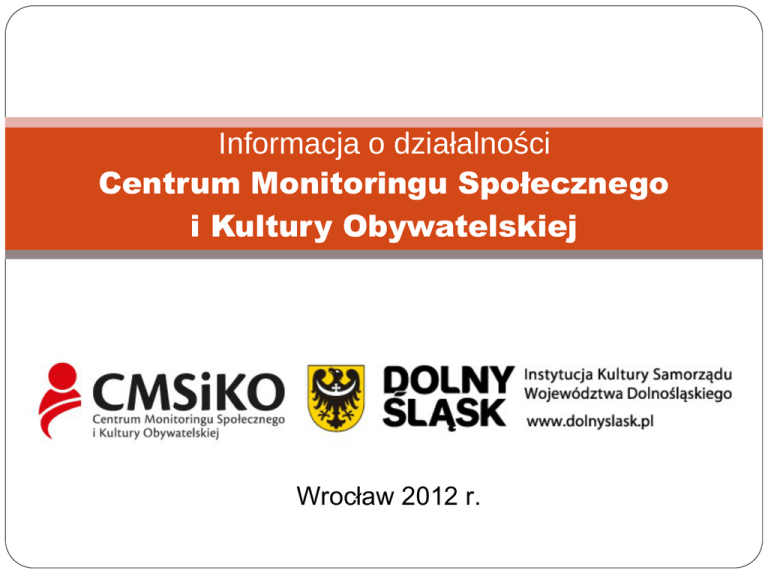 Informacja o działalności Centrum Monitoringu Społecznego i Kultury Obywatelskiej Wrocław 2012 r. Informacje o CMSiKO Centrum Monitoringu Społecznego i Kultury Obywatelskiej, Instytucja Kultury Samorządu Województwa Dolnośląskiego zostało powołane dnia 1 sierpnia 2011 r. Uchwałą Nr XII/234/11 Sejmiku Województwa Dolnośląskiego z dnia 14 lipca 2011 r. Centrum posiada status jednostki organizacyjnej (jednostki kultury) Samorządu Województwa Dolnośląskiego i posiada osobowość prawną. Cele CMSiKO Zgodnie ze Statutem celem Centrum jest: 1. Upowszechnianie kultury obywatelskiej Województwa Dolnośląskiego wśród mieszkańców 2. Pobudzanie aktywności społeczno-kulturalnej Dolnego Śląska 3. Pomoc w zakresie opracowywania planów rozwoju i polityki społeczno-kulturowej Dolnego Śląska 4. Popularyzacja wiedzy o procesach zachodzących na Dolnym Śląsku 5. Prowadzenie działalności edukacyjnej służącej budowaniu świadomości kulturowej i obywatelskiej mieszkańców Dolnego Śląska społeczno-kulturowych Informacje o CMSiKO Realizując swoje działania, Centrum współpracuje z: organizacjami społecznymi i pozarządowymi (np. Ośrodek Analiz Społecznych i Edukacji Kulturowej, Stowarzyszenie Kultura i Media), ośrodkami badawczymi (np. Kantar Media Sp. z o.o., Pactor Sp. z o.o., Centrum Badań Stosowanych Ultex Ankieter, Laboratorium Badań Społecznych Sp. z o.o.), uczelniami (np. Uniwersytet Wrocławski, Politechnika Wrocławska, Ośrodek Badań nad Migracjami Uniwersytetu Warszawskiego), instytucjami kultury (np. Dolnośląska Biblioteka Publiczna im. T. Mikulskiego), osobami fizycznymi i prawnymi (np. uniwersyteccy pracownicy naukowi), innymi jednostkami administracji samorządowej, państwowej i rządowej (Dolnośląski Wojewódzki Urząd Pracy, Ministerstwo Kultury i Dziedzictwa Narodowego, Przedstawicielstwem Komisji Europejskiej i Parlamentu Europejskiego we Wrocławiu). Badania zrealizowane przez CMSiKO (2011 r.) 1. „Obywatele Dolnego Śląska w działaniu. Analiza kondycji sfery obywatelskiej wśród mieszkańców województwa dolnośląskiego” Celem badania było uzyskanie informacji na temat sfery obywatelskiej na Dolnym Śląsku oraz wypracowanie rekomendacji dla budowy silnego kapitału społecznego Dolnoślązaków. Badanie zrealizowano na terenie całego województwa dolnośląskiego: Telefoniczne badania ankietowe – uczestniczyło w nich 600 dorosłych mieszkańców województwa dolnośląskiego Fokusy – zrealizowano 25 wywiadów grupowych, po 5 w każdym podregionie województwa Wywiady – przeprowadzono 84 wywiady z przedstawicielami lokalnych liderów opinii publicznej, instytucji i organizacji pozarządowych, władz samorządowych szczebla wojewódzkiego oraz partii politycznych Analiza danych statystycznych, wskaźników dotyczących województwa Badania zrealizowane przez CMSiKO (2011 r.) 2. „Tożsamość mieszkańców Dolnego Śląska” Głównym celem badania było uzyskanie informacji na temat tożsamości regionalnej i lokalnej mieszkańców Dolnego Śląska. Badanie zrealizowano na terenie całego województwa dolnośląskiego: Telefoniczne badania ankietowe – uczestniczyło w nich 1067 dorosłych mieszkańców województwa dolnośląskiego Internetowe badanie ankietowe – uczestniczyło w nich 507 mieszkańców województwa dolnośląskiego Fokusy – zrealizowano 30 wywiadów grupowych Wywiady – przeprowadzono 84 wywiady z przedstawicielami władz samorządowych, administracji, lokalnych liderów oraz przedstawiciele organizacji pozarządowych. Analiza danych statystycznych, wskaźników dotyczących województwa Badania zrealizowane przez CMSiKO (2011 r.) 3. „Uczestnictwo w kulturze mieszkańców województwa dolnośląskiego” Głównym celem badania było zidentyfikowanie form, zakresu, potrzeb, barier i rezultatów uczestnictwa w kulturze mieszkańców województwa dolnośląskiego. Badanie zrealizowano na terenie całego województwa dolnośląskiego: Telefoniczne badania ankietowe – uczestniczyło w nich 600 dorosłych mieszkańców województwa dolnośląskiego Fokusy – zrealizowano 25 wywiadów grupowych Wywiady – przeprowadzono 84 wywiady z przedstawicielami instytucji kultury, organizacji pozarządowych działających w sferze kultury na terenie województwa, instytucji administracji samorządowej odpowiedzialnymi za realizację zadań związanych z kulturą na terenie województwa, organizacji/instytucji przygotowujących ważne przedsięwzięcia kulturalne na terenie województwa Wywiady – przeprowadzono 30 wywiadów z mieszkańcami Dolnego Śląska podzielonymi na kategorie: zagrożonych wykluczeniem społecznym, uczestniczących w kulturze na przeciętnym poziomie, intensywnie uczestniczących w kulturze oraz ekspertów codzienności Analiza danych statystycznych, wskaźników dotyczących województwa Badania realizowane przez CMSiKO (2012 r.) 1. „Przemiany modelu rodziny, społeczne i ekonomiczne skutki tego procesu w perspektywie Dolnego Śląska oraz kraju” Celem projektu było przeanalizowanie zagadnień związanych z przeobrażeniami współczesnych rodzin, a także konsekwencji społecznych, ekonomicznych czy konsumpcyjnych tych zmian w skali Dolnego Śląska, z zachowaniem porównania dla skali kraju. Telefoniczne badanie ankietowe – w badaniu uczestniczyło 800 dorosłych mieszkańców Dolnego Śląska Fokusy – z przedstawicielami różnych typów rodzin, zrealizowano 8 fokusów Wywiady – zrealizowano 30 wywiadów z przedstawicielami: rodzin wielopokoleniowych, zrekonstruowanych, kohabitantów, rodziców samotnie wychowujących dzieci, małżeństw bezdzietnych oraz par homoseksualnych, a także 20 wywiadów z przedstawicielami: instytucji bankowych, pracowników społecznych oraz osób pracujących w marketingu Analiza danych statystycznych, wskaźników dotyczących województwa oraz kraju Spotkanie ekspertów Badania realizowane przez CMSiKO (2012 r.) 2. „Jakość 