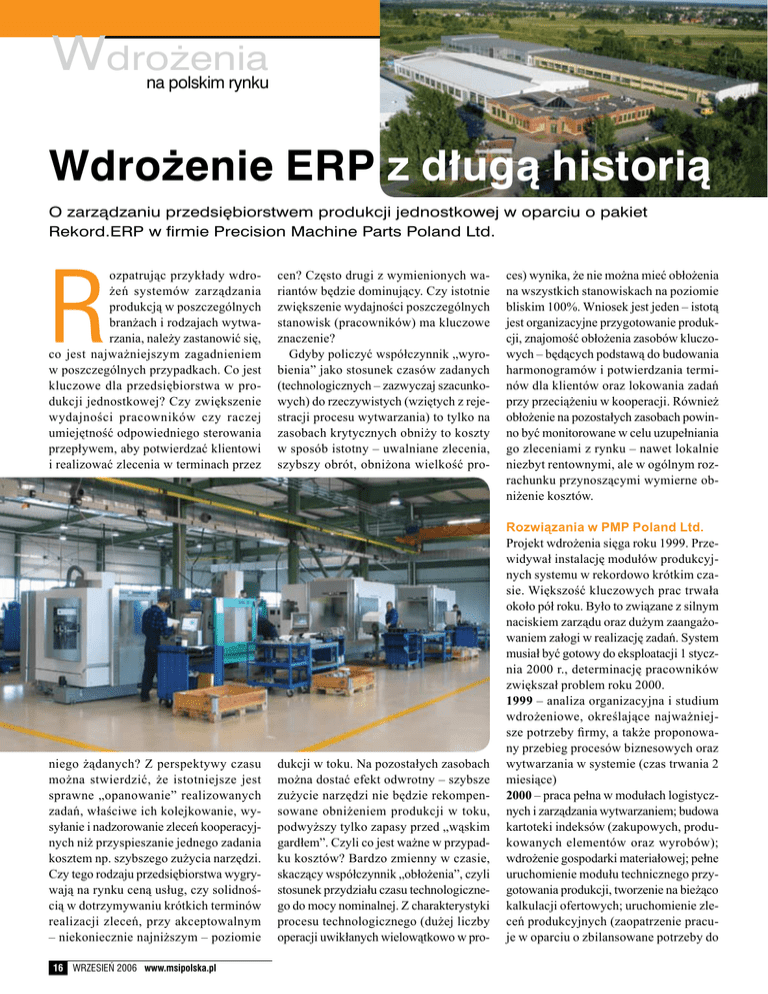 Wdrożenia na polskim rynku Wdrożenie ERP z długą historią O zarządzaniu przedsiębiorstwem produkcji jednostkowej w oparciu o pakiet Rekord.ERP w firmie Precision Machine Parts Poland Ltd. R ozpatrując przykłady wdrożeń systemów zarządzania produkcją w poszczególnych branżach i rodzajach wytwarzania, należy zastanowić się, co jest najważniejszym zagadnieniem w poszczególnych przypadkach. Co jest kluczowe dla przedsiębiorstwa w produkcji jednostkowej? Czy zwiększenie wydajności pracowników czy raczej umiejętność odpowiedniego sterowania przepływem, aby potwierdzać klientowi i realizować zlecenia w terminach przez niego żądanych? Z perspektywy czasu można stwierdzić, że istotniejsze jest sprawne „opanowanie” realizowanych zadań, właściwe ich kolejkowanie, wysyłanie i nadzorowanie zleceń kooperacyjnych niż przyspieszanie jednego zadania kosztem np. szybszego zużycia narzędzi. Czy tego rodzaju przedsiębiorstwa wygrywają na rynku ceną usług, czy solidnością w dotrzymywaniu krótkich terminów realizacji zleceń, przy akceptowalnym – niekoniecznie najniższym – poziomie 16 WRZESIEŃ 2006 www.msipolska.pl cen? Często drugi z wymienionych wariantów będzie dominujący. Czy istotnie zwiększenie wydajności poszczególnych stanowisk (pracowników) ma kluczowe znaczenie? Gdyby policzyć współczynnik „wyrobienia” jako stosunek czasów zadanych (technologicznych – zazwyczaj szacunkowych) do rzeczywistych (wziętych z rejestracji procesu wytwarzania) to tylko na zasobach krytycznych obniży to koszty w sposób istotny – uwalniane zlecenia, szybszy obrót, obniżona wielkość pro- dukcji w toku. Na pozostałych zasobach można dostać efekt odwrotny – szybsze zużycie narzędzi nie będzie rekompensowane obniżeniem produkcji w toku, podwyższy tylko zapasy przed „wąskim gardłem”. Czyli co jest ważne w przypadku kosztów? Bardzo zmienny w czasie, skaczący współczynnik „obłożenia”, czyli stosunek przydziału czasu technologicznego do mocy nominalnej. Z charakterystyki procesu technologicznego (dużej liczby operacji uwikłanych wielowątkowo w pro- ces) wynika, że nie można mieć obłożenia na wszystkich stanowiskach na poziomie bliskim 100%. Wniosek jest jeden – istotą jest organizacyjne przygotowanie produkcji, znajomość obłożenia zasobów kluczowych – będących podstawą do budowania harmonogramów i potwierdzania terminów dla klientów oraz lokowania zadań przy przeciążeniu w kooperacji. Również obłożenie na pozostałych zasobach powinno być monitorowane w celu uzupełniania go zleceniami z rynku – nawet lokalnie niezbyt rentownymi, ale w ogólnym rozrachunku przynoszącymi wymierne obniżenie kosztów. Rozwiązania w PMP Poland Ltd. Projekt wdrożenia sięga roku 1999. Przewidywał instalację modułów produkcyjnych systemu w rekordowo krótkim czasie. Większość kluczowych prac trwała około pół roku. Było to związane z silnym naciskiem zarządu oraz dużym zaangażowaniem załogi w realizację zadań. System musiał być gotowy do eksploatacji 1 stycznia 2000 r., determinację pracowników zwiększał problem roku 2000. 1999 – analiza organizacyjna i studium wdrożeniowe, określające najważniejsze potrzeby firmy, a także proponowany przebieg procesów biznesowych oraz wytwarzania w systemie (czas trwania 2 miesiące) 2000 – praca pełna w modułach logistycznych i zarządzania wytwarzaniem; budowa kartoteki indeksów (zakupowych, produkowanych elementów oraz wyrobów); wdrożenie gospodarki materiałowej; pełne uruchomienie modułu technicznego przygotowania produkcji, tworzenie na bieżąco kalkulacji ofertowych; uruchomienie zleceń produkcyjnych (zaopatrzenie pracuje w oparciu o zbilansowane potrzeby do Okiem odbiorcy systemu D zisiaj, z perspektywy 6-letniego użytkowania systemu Rekord mamy świadomość, jak ważne było dla naszej firmy wdrożenie i poprawna eksploatacja systemu klasy ERP. Przed sześcioma laty świadomie zdecydowaliśmy się na wyłączenie z wdrożenia modułu finansowo-księgowego, ale zgodnie z założeniami wszystkie inne dziedziny funkcjonowania firmy miały być objęte systemem Rekord: Gospodarka magazynowa, Zamówienia obce, Zamówienia własne (zaopatrzenie), TPP (techniczne przygotowanie produkcji), Sterowanie produkcją, SKJ (system kontroli jakości), Rejestracja produkcji i inne. Wdrożenie poprzedzone zostało studium wdrożeniowym. Z końcem roku 1999 rozpoczęliśmy wdrożenie. Tempo prac było bardzo szybkie, bowiem na 1 stycznia 2000 r. wszystkie dokumenty magazynowe i produkcyjne oraz wszystkie zamówienia od klientów i zamówienia zaopatrzeniowe miały funkcjonować w oparciu o system Rekord. Intensywność prac miała wielką zaletę, mogliśmy bardzo precyzyjnie kontrolować postęp prac i mieliśmy dużą satysfakcję, widząc wymierne efekty naszej pracy. Udało nam się dotrzymać założonych terminów. Od 1 stycznia wszystko zaczęło funkcjonować w oparciu o nowe dokumenty w nowym systemie. Nie oznaczało to jednak końca prac wdrożeniowych. Zamknęliśmy jedynie I etap. Później jeszcze przez 9 kolejnych miesięcy poprawialiśmy własne założenia i dokładaliśmy inne funkcje, aby po roku prac zamknąć etap wdrożenia. W kolejnych latach nastąpił intensywny rozwój naszej firmy, co natychmiast pociągnęło potrzebę przebudowy systemu. Ale ponieważ współpraca z firmą Rekord układała się od początku bardzo dobrze, nie mieliśmy żadnych hamulców, aby zlecić wykonanie stosownych zmian w systemie. Dzięki dobrej współpracy miedzy firmą Rekord a PMP Poland nigdy nie mieliśmy problemów z naprawą usterek, z wykonaniem potrzebnych zmian oraz całkiem nowych funkcji wg naszych pomysłów. Przykładem niech będzie moduł Rozdzielca, którego zadaniem jest planowanie obciążeń na produkcji i rozdział poszczególnych zadań na poszczególne gniazda produkcyjne. Ten moduł zaspokaja nasze specyfic