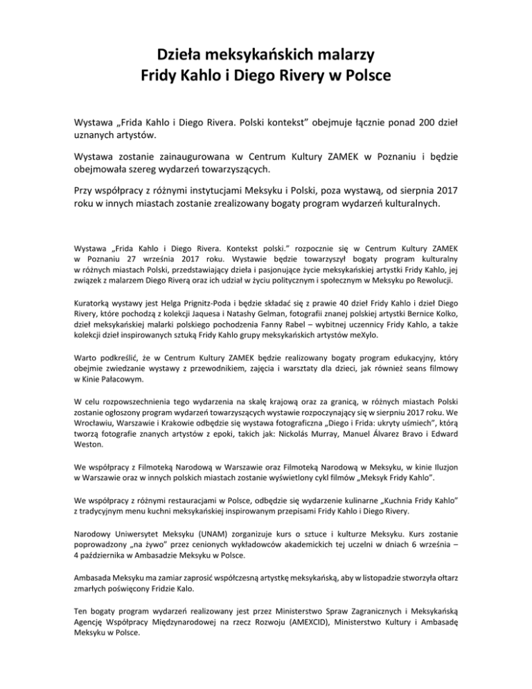 Dzieła meksykańskich malarzy Fridy Kahlo i Diego Rivery w Polsce Wystawa „Frida Kahlo i Diego Rivera. Polski kontekst” obejmuje łącznie ponad 200 dzieł uznanych artystów. Wystawa zostanie zainaugurowana w Centrum Kultury ZAMEK w Poznaniu i będzie obejmowała szereg wydarzeń towarzyszących. Przy współpracy z różnymi instytucjami Meksyku i Polski, poza wystawą, od sierpnia 2017 roku w innych miastach zostanie zrealizowany bogaty program wydarzeń kulturalnych. Wystawa „Frida Kahlo i Diego Rivera. Kontekst polski.” rozpocznie się w Centrum Kultury ZAMEK w Poznaniu 27 września 2017 roku. Wystawie będzie towarzyszył bogaty program kulturalny w różnych miastach Polski, przedstawiający dzieła i pasjonujące życie meksykańskiej artystki Fridy Kahlo, jej związek z malarzem Diego Riverą oraz ich udział w życiu politycznym i społecznym w Meksyku po Rewolucji. Kuratorką wystawy jest Helga Prignitz-Poda i będzie składać się z prawie 40 dzieł Fridy Kahlo i dzieł Diego Rivery, które pochodzą z kolekcji Jaquesa i Natashy Gelman, fotografii znanej polskiej artystki Bernice Kolko, dzieł meksykańskiej malarki polskiego pochodzenia Fanny Rabel – wybitnej uczennicy Fridy Kahlo, a także kolekcji dzieł inspirowanych sztuką Fridy Kahlo grupy meksykańskich artystów meXylo. Warto podkreślić, że w Centrum Kultury ZAMEK będzie realizowany bogaty program edukacyjny, który obejmie zwiedzanie wystawy z przewodnikiem, zajęcia i warsztaty dla dzieci, jak również seans filmowy w Kinie Pałacowym. W celu rozpowszechnienia tego wydarzenia na skalę krajową oraz za granicą, w różnych miastach Polski zostanie ogłoszony program wydarzeń towarzyszących wystawie rozpoczynający się w sierpniu 2017 roku. We Wrocławiu, Warszawie i Krakowie odbędzie się wystawa fotograficzna „Diego i Frida: ukryty uśmiech”, którą tworzą fotografie znanych artystów z epoki, takich jak: Nickolás Murray, Manuel Álvarez Bravo i Edward Weston. We współpracy z Filmoteką Narodową w Warszawie oraz Filmoteką Narodową w Meksyku, w kinie Iluzjon w Warszawie oraz w innych polskich miastach zostanie wyświetlony cykl filmów „Meksyk Fridy Kahlo”. We współpracy z różnymi restauracjami w Polsce, odbędzie się wydarzenie kulinarne „Kuchnia Fridy Kahlo” z tradycyjnym menu kuchni meksykańskiej inspirowanym przepisami Fridy Kahlo i Diego Rivery. Narodowy Uniwersytet Meksyku (UNAM) zorganizuje kurs o sztuce i kulturze Meksyku. Kurs zostanie poprowadzony „na żywo” przez cenionych wykładowców akademickich tej uczelni w dniach 6 września – 4 października w Ambasadzie Meksyku w Polsce. Ambasada Meksyku ma zamiar zaprosić współczesną artystkę meksykańską, aby w listopadzie stworzyła ołtarz zmarłych poświęcony Fridzie Kalo. Ten bogaty program wydarzeń realizowany jest przez Ministerstwo Spraw Zagranicznych i Meksykańską Agencję Współpracy Międzynarodowej na rzecz Rozwoju (AMEXCID), Ministerstwo Kultury i Ambasadę Meksyku w Polsce. The life and work of the Mexican painters Frida Kahlo and Diego Rivera will be exhibited in Poland The exhibition "Frida Kahlo and Diego Rivera in the Polish Context" will present more than 200 works by renowned artists. The exhibition will be exhibited at the Zamek Culture Centre in Poznan, Poland and will include a series of side events. In collaboration with various Mexican and Polish institutions, in addition to the exhibition, a series of cultural activities will be presented in different cities of Poland from August 2017. The exhibition "Frida Kahlo and Diego Rivera in the Polish Context" will be presented at the Zamek Culture Centre in Poznan, Poland from September 27, 2017. The exhibition will be accompanied by a wide cultural program in different cities of Poland that will present the passionate life and work of the Mexican artist Frida Kahlo, also her relationship with the painter Diego Rivera and her intense participation in political and social life in post-revolutionary Mexico. The exhibition was curated by Helga Prignitz-Poda and includes almost 40 works by Frida Kahlo and various works by Diego Rivera from the Jacques and Natasha Gelman collection; photographs by renowned polish artist Bernice Kolko; works of Mexican painter with polish roots, Fanny Rabel, who was one of the most outstanding disciples of Frida Kahlo and the collection of works inspired by Frida Kahlo group of Mexican artists meXylo. It should be noted that the Zamek Culture Centre, will carry out an extensive educational program that will include guided tours, children's activities and workshops, as well as a film projection at the Palacowy Cinema. With the purpose of giving a national projection to the painter's work in Poland, a parallel program will be presented from August 2017 in different cities, among which the exhibition on the famous couple entitled Diego y Frida: una sonrisa a mitad de camino, which includes photographs by Nickolas Murray, Manuel Álvarez Bravo and Edward Weston, which will be exhibited in the cities of Wroclaw, Warsaw and Krakow. With the support of the Warsaw National Film Library and the Cineteca National de México, El México de Frida Kahlo (The Mexico of Frida Kahlo) will be presented at the Iluzjon Cinema in Warsaw and other cinemas in the country. In collaboration with various restaurants in Poland, will be developed a gastronomic event entitled La cocina de Frida Kahlo with a menu of traditional Mexican cuisine, inspired by the recipes of Frida Kahlo and Diego Rivera. The National Autonomous University of Mexico (UNAM) will give a course on Mexican art and culture by specialists in live transmission, from September 6 to October 4 at the Mexican Embassy in Poland. Finally, in the month of November a contemporary Mexican artist will be invited to install an altar of the dead dedicated to Frida Kahlo. This extensive program of activities is organized by The Mexican Agency for International Developme