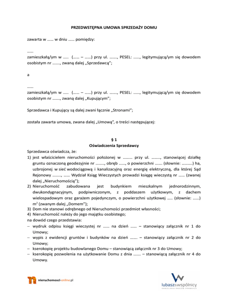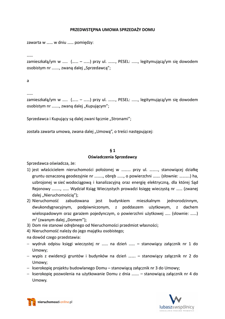 PRZEDWSTĘPNA UMOWA SPRZEDAŻY DOMU zawarta w …… w dniu …… pomiędzy: …… zamieszkałą/ym w ….. (…… – ……) przy ul. ……., PESEL: ……, legitymującą/ym się dowodem osobistym nr ……., zwaną dalej „Sprzedawcą”; a …… zamieszkałą/ym w ….. (…… – ……) przy ul. ……., PESEL: ……, legitymującą/ym się dowodem osobistym nr ……., zwaną dalej „Kupującym”; Sprzedawca i Kupujący są dalej zwani łącznie „Stronami”; została zawarta umowa, zwana dalej „Umową”, o treści następującej: §1 Oświadczenia Sprzedawcy Sprzedawca oświadcza, że: 1) jest właścicielem nieruchomości położonej w ……… przy ul. …….., stanowiącej działkę gruntu oznaczoną geodezyjnie nr …….., obręb ……, o powierzchni ……. (słownie: ……….) ha, uzbrojonej w sieć wodociągową i kanalizacyjną oraz energię elektryczną, dla której Sąd Rejonowy …….., …… Wydział Ksiąg Wieczystych prowadzi księgę wieczystą nr …… (zwanej dalej „Nieruchomością”); 2) Nieruchomość zabudowana jest budynkiem mieszkalnym jednorodzinnym, dwukondygnacyjnym, podpiwniczonym, z poddaszem użytkowym, z dachem wielospadowym oraz garażem pojedynczym, o powierzchni użytkowej ….. (słownie: ……) m2 (zwanym dalej „Domem”); 3) Dom nie stanowi odrębnego od Nieruchomości przedmiot własności; 4) Nieruchomość należy do jego majątku osobistego; na dowód czego przedstawia: wydruk odpisu księgi wieczystej nr …… na dzień …… – stanowiący załącznik nr 1 do Umowy; wypis z ewidencji gruntów i budynków na dzień ……. – stanowiący załącznik nr 2 do Umowy; kserokopię projektu budowlanego Domu – stanowiącą załącznik nr 3 do Umowy; kserokopię pozwolenia na użytkowanie Domu z dnia ……. – stanowiącą załącznik nr 4 do Umowy. 1 §2 Przedmiot Umowy Strony zobowiązują się do zawarcia w formie aktu notarialnego umowy sprzedaży, na podstawie której Sprzedawcą sprzeda Kupującemu Nieruchomość, o której mowa w § 1 Umowy, zaś Kupujący nabędzie ją za cenę …… (słownie: ……) złotych (zwanej dalej „Umową przyrzeczoną”). §3 Zawarcie Umowy przyrzeczonej 1. Strony zobowiązują się zawrzeć Umowę przyrzeczoną w terminie do dnia ...... 2. Kupujący/Sprzedawca jest uprawniony do wybrania notariusza, który sporządzi akt notarialny obejmujący Umowę przyrzeczoną. 3. Strony postanawiają, że koszty zawarcia Umowy przyrzeczonej poniesie Kupujący/Sprzedawca z wyłączeniem podatku od czynności cywilnoprawnych, do zapłaty którego obowiązany jest Kupujący. §4 Stan Nieruchomości oraz Domu i jego przekazanie 1. Kupujący oświadcza, że obejrzał Nieruchomość wraz z posadowionym na niej Domem, w szczególności zapoznał się z jego stanem prawnym oraz technicznym i nie wnosi w tym zakresie żadnych zastrzeżeń. 2. Sprzedawca zobowiązany jest do przekazania Kupującemu Nieruchomości wraz z posadowionym na niej Domem oraz kluczy do Domu najpóźniej do dnia zawarcia Umowy przyrzeczonej. 3. Przekazanie Nieruchomości i Domu zostanie potwierdzone protokołem sporządzonym przez Strony. §5 Zadatek 1. W dniu zawarcia Umowy Kupujący wpłacił Sprzedawcy gotówką kwotę ……. (słownie: ……) złotych tytułem zadatku, co Sprzedawca potwierdza. 2. Strony zgodnie postanawiają, że kwota …… (słownie: ……) tytułem pozostałej do zapłaty ceny zostanie zapłacona przez Kupującego w dniu zawarcia Umowy przyrzeczonej. §6 Kara umowna 1. Strony postanawiają, że w przypadku niezawarcia Umowy przyrzeczonej wskutek okoliczności, za które odpowiedzialność ponosi jedna ze Stron, jest ona zobowiązana do zapłacenia drugiej Stronie kary umownej w wysokości …… (słownie: ……) złotych. 2. Kara umowna powinna zostać zapłacona w terminie 14 dni od dnia, do którego Umowa przyrzeczona winna zostać zawarta. 2 3. Strony są uprawnione do dochodzenia odszkodowania przenoszącego zastrzeżoną karę umowną na zasadach ogólnych. 4. Uprawnienie do żądania zastrzeżonej karu umownej jest niezależne od uprawnień wynikających z zadatku. 1. 2. 3. 4. §7 Postanowienia końcowe Wszelkie zmiany Umowy wymagają zachowania formy pisemnej pod rygorem nieważności. Wszelkie spory wynikające z Umowy, Strony poddają sądowi powszechnemu właściwemu dla miejsca zamieszkania Sprzedawcy/Kupującego. W sprawach nieuregulowanych zastosowanie mają przepisy Kodeksu cywilnego. Umowa została sporządzona w dwóch jednobrzmiących egzemplarzach, po jednym dla każdej ze Stron. Załączniki do Umowy: 1) wydruk odpisu księgi wieczystej nr …… na dzień ……; 2) wypis z ewidencji gruntów i budynków na dzień …….; 3) kserokopia projektu budowlanego Domu; 4) kserokopia pozwolenia na użytkowanie Domu z dnia …….. SPRZEDAWCA: 3 KUPUJĄCY: