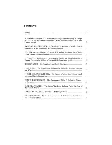 CONTENTS Preface ................................................................................................................... 7 KONRAD CHMIELECKI – Transcultural Congo as the Periphery of Europe or a Hybrid and Networked Archipelago: Transculturality within the Visual Culture Studies ..................................................................................................... 9 RYSZARD KLUSZCZYŃSKI – Experience – Memory – Identity. Media experiences as the foundations of hybridized identity ........................................ 31 BEN PARRY – An Allegory of Labour: Life and the Self in the Art of Tatzu Nishi. Cultural Hijack in London ........................................................................ 47 KATARZYNA KOSMALA – Constructed Stories of (Non)Belonging to Europe: Performative Videos of Marina Gržinić and Aina Šmid ....................... 65 TEODOR AJDER – On Foreclosure and Fresh Cherries ................................... 89 JOSIP ZANKI – The Stone Flower in Pannonia: Collective Trauma, Memory, and War ................................................................................................................ 107 NICOLE DOŁOWY-RYBIŃSKA – The Europe of Minorities. Cultural Landscapes and Ethnic Boundaries ............................................................................. 125 ROMAN BROMBOSZCZ – The Catalague of Walls. A Collective Memory of Europeans ........................................................................................................ 139 ELŻBIETA WIĄCEK – “The Orient” in Global Cultural Flow: the Case of the Turkish Riviera .............................................................................................. 153 DAGMARA DRZAZGA – Bobrek – Life through Dance ................................ 183 JULIA SOWIŃSKA-HEIM – Conversions and Redefinitions – Architecture and Identity of a Place .......................................................................................... 191 ROMAN KUBICKI – On the Artistic Perspectives of the European Union ... 205 PRZEMYSŁAW PIOTROWSKI, ZBIGNIEW BAJEK, STEFAN FLOREK – The Artistic Statements of Inmates about Freedom: the “Labyrinth of Freedom” Project and Its Possible Applications ....................................................... 215 Notes on the Contributors ..................................................................................... 231 Konrad Chmielecki TRANSCULTURAL CONGO AS THE PERIPHERY OF EUROPE OR A HYBRID AND NETWORKED ARCHIPELAGO: TRANSCULTURALITY WITHIN THE VISUAL CULTURE STUDIES (abstract) The article takes up the issue of imagining and representing the periphery of Europe in the context of colonial and post-colonial reflection. The analyzed examples are art works that can be treated as transcultural representations. The main concept that has been scrutinized is transculturality as proposed by Wolfgang Welsch, who criticizes the existing concepts of individual cultures, as well as the ideas of multiculturalism and interculturalism. The starting point is the belief of Nicholas Mirzoeff that all cultures are transcultures. Within the field of Visual Culture Studies, the concept of transculturality has been replaced by transculturation and transculture, which are involved in the process of constructing networked cultural identities with a hybrid structure. The notions of transculturation and transculture can also be applied to the works of José Bedia. The evolution of Mirzoeff’s thinking about transculturality proceeds from the affirmation of the position of the Cuban anthropologist Alfonso Ortiz to the transformation of Welsch’s concept. The photographs of Herbert Lang are juxtaposed with the concept of “imperial transculture”, which refers to the scopic regimes of Martin Jay. These connotations also direct us toward the understanding of the concept of “imperialism” of Edward W. Said, who treats the Orient as an artificial construct. In this sense, one example of the operation of the visual regime of colonialization can be provided by the nkisi figures that appear in the works Fetish No. 2 (1988) by Renée Stout and Ta Tele (1988) by Trigo Piula, which can be interpreted in relation to Marcel Mauss’s magic fetishism and Karl Marx’s commodity fetishism. Another example of the operation of the visual regime of colonialization is the necropolitics of the civil war in Rwanda between the Hutu and Tutsi tribes and two more works – Scramble for Africa (2003) by Yinka Shonibare and The Chief: he who sold Africa to the colonists (1997) by Samuel Fosso. The concept of constructing an image of the Kongo peoples presented here is based on the assumption that it is the result of the operation of the discourse created by the European colonizers. This point of view can be also found in the book The Right to Look, where Mirzoeff constructs the definitions of visuality and countervisuality. Keywords: transculturality, Congo, imagining Europe, representing periphery, hybridity, networked archipelago, Visual Culture Studies. TRANSKULTUROWE KONGO JAKO PERYFERIE EUROPY ALBO HYBRYDOWY I USIECIOWIONY “ARCHIPELAG”: TRANSKULTUROWOŚĆ W BADANIACH NAD KULTURĄ WIZUALNĄ (streszczenie) Artykuł podejmuje problematykę wyobrażeń i reprezentacji peryferii Europy w kontekście refleksji kolonialnej i postkolonialnej. Analizowanymi przykładami są prace artystyczne, które mogą być traktowane jako reprezentacje transkulturowe. Głównym pojęciem, które zostało poddane rewizji jest transkulturowość w ujęciu proponowanym przez Wolfganga Welscha, który krytykuje istniejące koncepcje izolowanych kultur, a także idee wielokulturowości i interkulturowości. Punktem wyjścia jest przekonanie Nicholasa Mirzoeffa, że wszystkie kultury są transkulturami. W obszarze badań nad kulturą wizualną pojęcie transkulturowości zostaje zastąpione przez transkulturację i transkulturę, które uczestniczą w 