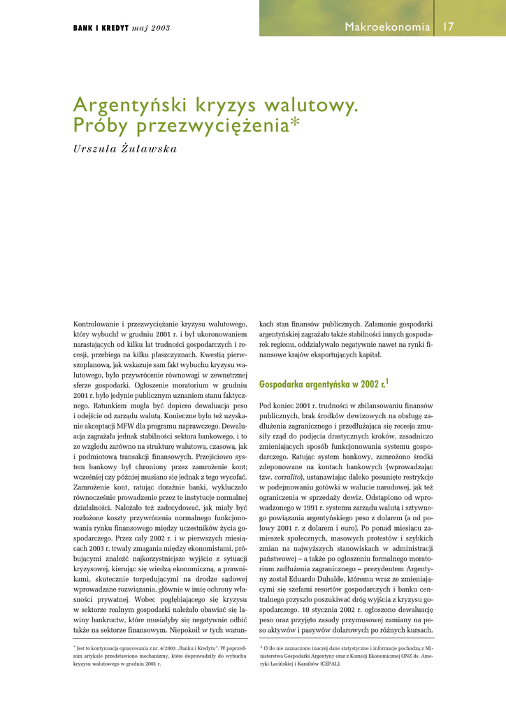 Makroekonomia BANK I KREDYT m a j 2 0 0 3 Argentyƒski kryzys walutowy. Próby przezwyci´˝enia* Urszula ˚u∏awska Kontrolowanie i przezwyci´˝anie kryzysu walutowego, który wybuch∏ w grudniu 2001 r. i by∏ ukoronowaniem narastajàcych od kilku lat trudnoÊci gospodarczych i recesji, przebiega na kilku p∏aszczyznach. Kwestià pierwszoplanowà, jak wskazuje sam fakt wybuchu kryzysu walutowego, by∏o przywrócenie równowagi w zewn´trznej sferze gospodarki. Og∏oszenie moratorium w grudniu 2001 r. by∏o jedynie publicznym uznaniem stanu faktycznego. Ratunkiem mog∏a byç dopiero dewaluacja peso i odejÊcie od zarzàdu walutà. Konieczne by∏o te˝ uzyskanie akceptacji MFW dla programu naprawczego. Dewaluacja zagra˝a∏a jednak stabilnoÊci sektora bankowego, i to ze wzgl´du zarówno na struktur´ walutowà, czasowà, jak i podmiotowà transakcji finansowych. PrzejÊciowo system bankowy by∏ chroniony przez zamro˝enie kont; wczeÊniej czy póêniej musiano si´ jednak z tego wycofaç. Zamro˝enie kont, ratujàc doraênie banki, wyklucza∏o równoczeÊnie prowadzenie przez te instytucje normalnej dzia∏alnoÊci. Nale˝a∏o te˝ zadecydowaç, jak mia∏y byç roz∏o˝one koszty przywrócenia normalnego funkcjonowania rynku finansowego mi´dzy uczestników ˝ycia gospodarczego. Przez ca∏y 2002 r. i w pierwszych miesiàcach 2003 r. trwa∏y zmagania mi´dzy ekonomistami, próbujàcymi znaleêç najkorzystniejsze wyjÊcie z sytuacji kryzysowej, kierujàc si´ wiedzà ekonomicznà, a prawnikami, skutecznie torpedujàcymi na drodze sàdowej wprowadzane rozwiàzania, g∏ównie w imi´ ochrony w∏asnoÊci prywatnej. Wobec pog∏´biajàcego si´ kryzysu w sektorze realnym gospodarki nale˝a∏o obawiaç si´ lawiny bankructw, które musia∏yby si´ negatywnie odbiç tak˝e na sektorze finansowym. Niepokoi∏ w tych warun- kach stan finansów publicznych. Za∏amanie gospodarki argentyƒskiej zagra˝a∏o tak˝e stabilnoÊci innych gospodarek regionu, oddzia∏ywa∏o negatywnie nawet na rynki finansowe krajów eksportujàcych kapita∏. * Jest to kontynuacja opracowania z nr. 4/2003 „Banku i Kredytu”. W poprzednim artykule przedstawiono mechanizmy, które doprowadzi∏y do wybuchu kryzysu walutowego w grudniu 2001 r. 1 Gospodarka argentyƒska w 2002 r.1 Pod koniec 2001 r. trudnoÊci w zbilansowaniu finansów publicznych, brak Êrodków dewizowych na obs∏ug´ zad∏u˝enia zagranicznego i przed∏u˝ajàca si´ recesja zmusi∏y rzàd do podj´cia drastycznych kroków, zasadniczo zmieniajàcych sposób funkcjonowania systemu gospodarczego. Ratujàc system bankowy, zamro˝ono Êrodki zdeponowane na kontach bankowych (wprowadzajàc tzw. corralito), ustanawiajàc daleko posuni´te restrykcje w podejmowaniu gotówki w walucie narodowej, jak te˝ ograniczenia w sprzeda˝y dewiz. Odstàpiono od wprowadzonego w 1991 r. systemu zarzàdu walutà i sztywnego powiàzania argentyƒskiego peso z dolarem (a od po∏owy 2001 r. z dolarem i euro). Po ponad miesiàcu zamieszek spo∏ecznych, masowych protestów i szybkich zmian na najwy˝szych stanowiskach w administracji paƒstwowej – a tak˝e po og∏oszeniu formalnego moratorium zad∏u˝enia zagranicznego – prezydentem Argentyny zosta∏ Eduardo Duhalde, któremu wraz ze zmieniajàcymi si´ szefami resortów gospodarczych i banku centralnego przysz∏o poszukiwaç dróg wyjÊcia z kryzysu gospodarczego. 10 stycznia 2002 r. og∏oszono dewaluacj´ peso oraz przyj´to zasady przymusowej zamiany na peso aktywów i pasywów dolarowych po ró˝nych kursach. O ile nie zaznaczono inaczej dane statystyczne i informacje pochodzà z Ministerstwa Gospodarki Argentyny oraz z Komisji Ekonomicznej ONZ ds. Ameryki ¸aciƒskiej i Karaibów (CEPAL). 17 18 Makroekonomia BANK I KREDYT m a j 2 0 0 3 Wykres 1 Kurs nominalny 4,50 4,00 3,50 peso za dolara 3,00 PKB realny Konsumpcja Inwestycje Eksport Import Deflator PKB Kurs nominalny (koniec okresu, peso za USD) Kurs realny (koniec okresu, peso za USD) I kw. -16,3 -20,1 -45,4 5,6 -57,4 7,6 II kw. -13,6 -15,6 -43,0 -0,8 -56,7 34,1 III kw. -10,4 -12,8 -32,3 -2,7 -51,3 39,4 IV kw. Rok 2002 -3,1 -11,0 -4,3 -13,4 -25,0 -36,9 9,6 2,6 -31,4 -50,7 45,1 20,2 2,00 1,50 1,00 0,50 2003-03-21 2003-03-07 2003-02-21 2003-02-07 2003-01-24 2003-01-10 2002-12-27 2002-12-13 2002-11-29 2002-11-15 2002-11-01 2002-10-18 2002-10-04 2002-09-20 2002-09-06 2002-08-23 2002-08-09 2002-07-26 2002-07-12 2002-06-28 2002-06-14 2002-05-31 2002-05-17 2002-05-03 2002-04-19 2002-04-05 2002-03-22 2002-03-08 2002-02-22 2002-02-08 2002-01-25 2002-01-11 2001-12-28 2001-12-14 0,00 èród∏o: Ministerio de Economía RA, Indicadores económicos. 40% importu, mo˝na okreÊliç jako substytuujàcà import2. Przeprowadzona dewaluacja zasadniczo zmieni∏a struktur´ argentyƒskiego bilansu p∏atniczego. Kszta∏towanie si´ uwolnionego w styczniu 2002 r. kursu waluty ilustruje wykres 1. Uwolnienie kursu peso w pierwszym pó∏roczu 2002 r. zaowocowa∏o szybkà utratà wartoÊci przez walut´ argentyƒskà, a tak˝e znacznymi wahaniami kursowymi. Drugie pó∏rocze cechowa∏a najpierw stabilizacja kursu, a nast´pnie wzrost wartoÊci peso w stosunku do dolara. Tendencja ta pog∏´bi∏a si´ w I kwartale 2003 r. Realna deprecjacja peso w I pó∏roczu 2002 r. by∏a niemal tak szybka, jak zmiany nominalne. Od po∏owy roku obserwuje si´ natomiast realnà aprecjacj´ peso: najszybszà wzgl´dem waluty g∏ównego regionalnego partnera gospodarczego, nieco wolniejszà wzgl´dem dolara USA i najwolniejszà wzgl´dem euro. Radykalne zahamowanie importu spowodowane dewaluacjà, ale tak˝e zmniejszeniem popytu globalnego pozwoli∏o na osiàgni´cie wysokiego dodatniego salda obrotów handlowych. Osiàgni´to je mimo pewnego opóênienia w uzyskiwaniu dochodów z eksportu, b´dàcego skutkiem wprowadzenia obowiàzku odsprzeda˝y dewiz, co wobec niepewnoÊci rynku wewn´trznego 2 Tabela 1 Gospodarka Argentyny w 2002 r. (zmiany w stosunku do an