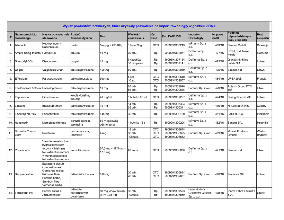 Wykaz produktów leczniczych, które uzyskały pozwolenie na import równoległy w grudniu 2016 r. Nazwa produktu leczniczego Nazwa powszechnie Postać stosowana farmaceutyczna Moc Wielkość opakowania 1. Altabactin Neomycinum + Bacitracinum maść 5 mg/g + 250 IU/g 1 tuba 20 g 2. Ampril 10 mg tabletki Ramiprilum tabletki 10 mg 3. Bisacodyl GSK Bisacodylum czopki 4. Ceglar Valganciclovirum 5. Efferalgan Paracetamolum 6. L.p. Kat. dost. Kod EAN/UCC Importer równoległy InPharm Sp. z o.o. Delfarma Sp. z o.o. Podmiot odpowiedzialny w kraju eksportu Kraj eksportu 483/16 Sandoz GmbH Słowacja 477/16 KRKA, d.d. Novo mesto Rumunia Nr pozw. na IR OTC 5909991309213 30 tabl. Rp 5909991308971 10 mg 5 czopków 10 czopków Rp Rp 5909991307134 5909991307141 Delfarma Sp. z o.o. 473/16 GlaxoSmithKline Latvia SIA Łotwa tabletki powlekane 450 mg 60 tabl. Rp 5909991308919 Delfarma Sp. z o.o. 476/16 Sandoz d.d. Łotwa tabletki musujące 500 mg 8 szt. 16 szt. OTC OTC 5909991309640 5909991309657 InPharm Sp. z o.o. 484/16 UPSA SAS Francja Escitalopram Actavis Escitalopramum tabletki powlekane 10 mg 28 tabl. 56 tabl. Rp Rp 5909991309848 5909991309855 Forfarm Sp. z o.o. 479/16 Actavis Group PTC ehf Litwa 7. Espumisan Simeticonum krople doustne, emulsja 40 mg/ml 1 butelka 30 ml OTC 5909991307257 Delfarma Sp. z o.o. 474/16 Bering-Chemie AG Łotwa 8. Lexapro Escitalopramum tabletki powlekane 10 mg 14 tabl. 28 tabl. Rp Rp 5909991306304 5909991306311 InPharm Sp. z o.o. 470/16 H. Lundbeck A/S Czechy 9. Lipanthyl NT 145 Fenofibratum tabletki powlekane 145 mg 30 tabl. Rp 5909991309190 InPharm Sp. z o.o. 481/16 LACER, S.A. Hiszpania Mometasoni furoas aerozol do nosa, zawiesina 50 mcg/dawkę odmierzoną 1 butelka 18 g Rp 5909991309206 InPharm Sp. z o.o. 482/16 Sandoz B.V. Holandia Nicotinum guma do żucia, lecznicza 4 mg 15 tabl. 30 tabl. 105 tabl. OTC OTC OTC 5909991306618 5909991306625 5909991306632 Forfarm Sp. z o.o. 469/16 McNeil Products Limited Wielka Brytania 12. Persen forte Valerianae extractum hydroalcoholicum siccum + Melissae kapsułki twarde folii extractum siccum + Menthae piperitae folii extractum siccum 87,5 mg + 17,5 mg + 20 kaps. 17,5 mg OTC 5909991306830 Delfarma Sp. z o.o. 471/16 Sandoz d.d. Litwa 13. Sinupret extract Extractum siccum compositum ex: Gentianae radice, Primulae flore, Rumicis herba, Sambuci flore, Verbenae herba tabletki drażowane 160 mg 20 tabl. 40 tabl. OTC OTC 5909991309824 5909991309831 Forfarm Sp. z o.o. 480/16 Bionorica SE Łotwa 14. Tardyferon-Fol Ferrosi sulfas + Acidum folicum tabletki o przedłużonym uwalnianiu 80 mg jonów żelaza (II) + 0,35 mg 30 tabl. 100 tabl. Rp Rp 5909991307523 5909991307530 Laboratorium Galenowe Olsztyn Sp. z o.o. 475/16 Pierre Fabre Farmaka Grecja S.A. 10. Nasometin 11. Nicorette Classic Gum Wykaz produktów leczniczych, które uzyskały pozwolenie na import równoległy w grudniu 2016 r. Nazwa powszechnie Postać stosowana farmaceutyczna Moc Wielkość opakowania 15. Vigantoletten 1000 Cholecalciferolum tabletki 25 mcg (1000 j.m.) 25 tabl. 50 tabl. OTC OTC 5909991309299 5909991309305 Delfarma Sp. z o.o. 16. Xanax SR Alprazolamum tabletki o przedłużonym uwalnianiu 0,5 mg 30 tabl. 60 tabl. Rp Rp 5909991307172 5909991307189 Delfarma Sp. z o.o. L.p. Nazwa produktu leczniczego Kat. dost. Kod EAN/UCC Importer równoległy Podmiot odpowiedzialny w kraju eksportu Kraj eksportu 478/16 Merck Serono GmbH Niemcy 472/16 Pfizer, S.L. Hiszpania Nr pozw. na IR