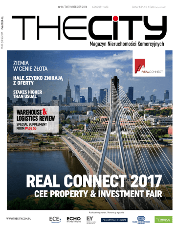 nr 8 / (65) WRZESIEŃ 2016 ISSN 2081-1683 Cena 15 PLN / 4 Euro (w tym 8% VAT) WRZESIEŃ 2016 Magazyn Nieruchomości Komercyjnych ZIEMIA W CENIE ZŁOTA HALE SZYBKO ZNIKAJĄ Z OFERTY STAKES HIGHER THAN USUAL WAREHOUSE & LOGISTICS REVIEW SPECIAL SUPPLEMENT FROM PAGE 55 REAL CONNECT 2017 CEE PROPERTY & INVESTMENT FAIR Publication paners / Panerzy wydania WWW.THECITY.COM.PL INSIDE THE PROPERTY INDUSTRY CEE PROPERTY & INVESTMENT FAIR REAL CONNECT 2017 26-27 APRIL 2017 | EXPO XXI WARSAW WWW.REALCONNECT.PL Real Connect - CEE Propey & Investment Fair P ierwsza w Polsce i jedyna odbywająca się w Europie Środkowo-Wschodniej wystawa najbardziej dynamicznych firm i instytucji z obszaru nieruchomości komercyjnych – REAL CONNECT 2017. Wydarzenie odbędzie się w dniach 26 – 27 kwietnia 2017 roku w warszawskim Centrum Expo XXI, najnowocześniejszym obiekcie wystawienniczokonferencyjnym stolicy – o powierzchni 20 000 mkw. W imprezie weźmie udział około 100 wystawców i 2000 odwiedzających z naszego regionu Europy oraz liczne grono profesjonalistów z kraju i zagranicy. Główną częścią dwudniowego wydarzenia będą targi rynku nieruchomości i inwestycji Europy Środkowo-Wschodniej, które obejmą rynek gruntów, nieruchomości handlowych, biurowych, magazynowych, logistycznych, sportowych oraz nieruchomości apartamentowych. Tematyka wydarzenia uwzględni także finansowanie, budowę i rozbudowę obiektów, zarządzanie, marketing oraz transakcje na rynku nieruchomości. Równolegle z targami odbędzie się REAL CONNECT CONFERENCE 2017. Podczas konferencji zaplanowane zostały inspirujące panele dyskusyjne oraz prezentacje ekspertów i praktyków rynku. REAL CONNECT 2017 umożliwia prezentację projektów, potencjału terenów inwestycyjnych, planów rozwojowych dotyczących nieruchomości komercyjnych, znalezienie finansowania czy pozyskanie partnera biznesowego. Organizatorem targów jest spółka 4Value działająca w grupie Property Media Group. Szczegóły dotyczące wydarzenia oraz rejestracja uczestników dostępne są na stronie www.realconnect.pl T he first in Poland and only one in Central and Eastern Europe exhibition of the most dynamic companies and institutions from the commercial real estate sector – REAL CONNECT 2017. The event will take place on 26 – 27 April 2017 in Expo XXI centre in Warsaw – the most modern exhibition and conference centre in the Polish capital – at an area of 20,000 sqm. The event will be attended by around 100 exhibitors and 2,000 visitors from this region of Europe, as well as a number of industry professionals from Poland and abroad. The main part of the two-day event will be a CEE real estate and investment market fair, which will cover the following sectors: land market, retail market, office market, industrial market, sport facilities market and apartment market. The scope of the event will also include topics such as financing, construction and extension of assets, management, marketing and transactions in the real estate market. Parallel to the fair, REAL CONNECT CONFERENCE 2017 will take place. The conference programme includes inspiring panels and presentations of market experts and practitioners. REAL CONNECT 2017 allows to present projects, potential of investment land, and development plans in the field of commercial real estate, to find financing, or to acquire business partners. The event is organised by 4Value which is part of Property Media Group. The details of the event and participant registration form are available at www.realconnect.pl SPIS TREŚCI SPIS TREŚCI TABLE OF CONTENTS TABLE OF CONTENTS |4| SPIS TREŚCI / CONTENT | 37 | OKIEM PRAKTYKA / PRACTITIONER’S POINT OF VIEW Pomysł na nieruchomości / Idea for properties |6| WSTĘP / EDITORIAL | 10 | Inwestycje / Investment Polskimi obiektami interesują się inwestorzy z całego świata Investors from all over the world are interested in Polish buildings | 18 | WYWIAD / FACE TO FACE Stawka większa niż zwykle / Stakes higher than usual | 25 | RYNEK / MARKET Zaczynamy konkurować z Europą Zachodnią We are start ing to compete with Western Europe | 32 | GRUNTY INWESTYCYJNE / LAND INVESTMENT Ziemia w cenie złota / Land as expensive as gold | 38 | WYWIAD / FACE TO FACE W Galerii Malta marketing szyjemy na miarę In Galeria Malta we offer tailored marketing | 44 | OKIEM PRAKTYKA / PRACTITIONER’S POINT OF VIEW Carrefour wzmacnia swoją pozycję na rynku centrów handlowych w Polsce Carrefour is strengthening its position in the shopping centre market in Poland | 46 | OKIEM PRAKTYKA / PRACTITIONER’S POINT OF VIEW Działania lokalne w Bonarka City Center Local actions in Bonarka City Center | 47 | Informacje Centra Handlowe / News Shopping Centres | 50 | Informacje biurowce / News Offices | 52 | Transfery / Transfers 4 / WRZESIEŃ | SEPTEMBER 2016 WRZESIEŃ | SEPTEMBER 2016 / 5 WSTĘP EDITORIAL Optymizm rynkowy Market optimism DANIEL JABŁOŃSKI, REDAKTOR PROWADZĄCY | MANAGING EDITOR J ak przekonują analitycy, bieżący rok dla Polski ma zapowiadać się znakomicie. Na jego przestrzeni deweloperzy oddadzą rekordową powierzchnię biurową, znacznie przekraczającą średnią z ostatnich czterech lat. Zwiększy to nadpodaż powierzchni oraz siłę przetargową najemców – jak to często bywa, sukces jednych to kłopoty innych. Zarządcy i właściciele starszych obiektów muszą być przygotowani na dodatkowe oczekiwania najemców i konieczność modernizacji obiektów. Stan ten nie zniechęca deweloperów do podejmowania kolejnych inwestycji. Przekonują oni o stabilności i rozwoju polskiego rynku. Pojawiają się także głosy, że sprzyjające okoliczności tworzy sprawa Brexitu. Zauważalna jest wzmożona aktywność w prowadzeniu globalnych funduszy inwestycyjnych, które nieustannie poszukują obiektów komercyjnych, z biurowcami i obiektami handlowymi na czele. W przypadku tych ostatnich powodzeniem cieszą się również starsze budynki, które można