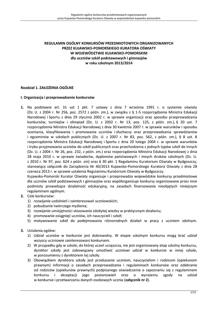 Regulamin ogólny konkursów przedmiotowych organizowanych przez Kujawsko-Pomorskiego Kuratora Oświaty w województwie kujawsko-pomorskim REGULAMIN OGÓLNY KONKURSÓW PRZEDMIOTOWYCH ORGANIZOWANYCH PRZEZ KUJAWSKO-POMORSKIEGO KURATORA OŚWIATY W WOJEWÓDZTWIE KUJAWSKO-POMORSKIM dla uczniów szkół podstawowych i gimnazjów w roku szkolnym 2013/2014 Rozdział 1. ZAŁOŻENIA OGÓLNE I. Organizacja i przeprowadzenie konkursów 1. Na podstawie art. 31 ust 1 pkt. 7 ustawy z dnia 7 września 1991 r. o systemie oświaty (Dz. U. z 2004 r. Nr 256, poz. 2572 z późn. zm.), w związku z § 1-5 rozporządzenia Ministra Edukacji Narodowej i Sportu z dnia 29 stycznia 2002 r. w sprawie organizacji oraz sposobu przeprowadzania konkursów, turniejów i olimpiad (Dz. U. z 2002 r. Nr 13, poz. 125, z późn. zm.), § 20 ust. 7 rozporządzenia Ministra Edukacji Narodowej z dnia 30 kwietnia 2007 r. w sprawie warunków i sposobu oceniania, klasyfikowania i promowania uczniów i słuchaczy oraz przeprowadzania sprawdzianów i egzaminów w szkołach publicznych (Dz. U. z 2007 r. Nr 83, poz. 562, z późn. zm.), § 8 ust. 8 rozporządzenia Ministra Edukacji Narodowej i Sportu z dnia 20 lutego 2004 r. w sprawie warunków i trybu przyjmowania uczniów do szkół publicznych oraz przechodzenia z jednych typów szkół do innych (Dz. U. z 2004 r. Nr 26, poz. 232, z późn. zm.) oraz rozporządzenia Ministra Edukacji Narodowej z dnia 28 maja 2010 r. w sprawie świadectw, dyplomów państwowych i innych druków szkolnych (Dz. U. z 2010 r. Nr 97, poz. 624 z późn. zm) oraz § 30 pkt. 1 Regulaminu Kuratorium Oświaty w Bydgoszczy, stanowiący załącznik do Zarządzenia Nr 40/2013 Kujawsko-Pomorskiego Kuratora Oświaty z dnia 28 czerwca 2013 r. w sprawie ustalenia Regulaminu Kuratorium Oświaty w Bydgoszczy. Kujawsko-Pomorski Kurator Oświaty organizuje i przeprowadza wojewódzkie konkursy przedmiotowe dla uczniów szkół podstawowych i gimnazjów oraz współorganizuje konkursy organizowane przez inne podmioty prowadzące działalność edukacyjną, na zasadach finansowania nieobjętych niniejszym regulaminem ogólnym. 2. Cele konkursów: 1) rozwijanie uzdolnień i zainteresowań uczniowskich; 2) pobudzanie twórczego myślenia; 3) rozwijanie umiejętności stosowania zdobytej wiedzy w praktycznym działaniu; 4) promowanie osiągnięć uczniów, ich nauczycieli i szkół; 5) motywowanie szkół do podejmowania różnorodnych działań w pracy z uczniem zdolnym. 3. Ustalenia ogólne: 1) Udział uczniów w konkursie jest dobrowolny. W etapie szkolnym konkursu mogą brać udział wszyscy uczniowie zainteresowani konkursem. 2) W przypadku gdy w szkole, do której uczeń uczęszcza, nie jest organizowany etap szkolny konkursu, dyrektor szkoły jest zobowiązany umożliwić uczniowi udział w konkursie w innej szkole, w porozumieniu z dyrektorem tej szkoły. 3) Obowiązkiem dyrektora szkoły jest przekazanie uczniom, nauczycielom i rodzicom (opiekunom prawnym) informacji o zasadach przeprowadzania i regulaminach konkursów oraz odebranie od rodziców (opiekunów prawnych) podpisanego oświadczenia o zapoznaniu się z regulaminem konkursu i akceptacji jego postanowień oraz o wyrażeniu zgody na udział w konkursie i przetwarzaniu danych osobowych ucznia (załącznik nr 2). 1/12 Regulamin ogólny konkursów przedmiotowych organizowanych przez Kujawsko-Pomorskiego Kuratora Oświaty w województwie kujawsko-pomorskim 4) Obowiązkiem uczniów jest przestrzeganie zasad określonych w regulaminach konkursów i instrukcji stanowiących integralną część zestawów zadań konkursowych. 5) Nadzór nad organizacją konkursu sprawuje wizytator, który jest przewodniczącym komisji wojewódzkiej konkursu. 6) Informacje dotyczące organizacji, przebiegu i wyników konkursu będą przekazywane wyłącznie poprzez stronę www.kuratorium.bydgoszcz.uw.gov.pl/main.php?start=konkursy 7) Zestawy zadań oraz schematy oceniania i punktacji do wszystkich etapów konkursów będą opracowywane przez autora. Testy zostaną dopuszczone do wykorzystania po uzyskaniu pozytywnej, merytorycznej recenzji oraz uzgodnieniu i sprawdzeniu zadań zawartych w teście przez wiceprzewodniczącego. 8) Autorzy i recenzenci zadań oraz wiceprzewodniczący komisji wojewódzkiej nie mogą przygotowywać uczniów lub własnych dzieci do udziału w konkursie. 9) Przewodniczących, wiceprzewodniczących i członków wojewódzkich, rejonowych i szkolnych komisji konkursów przedmiotowych obowiązują zasady przechowywania i przekazywania tematów konkursowych w warunkach uniemożliwiających ich nieuprawnione ujawnienie. 10) Etap szkolny przeprowadza szkolna komisja konkursowa. 11) Etap rejonowy przeprowadza rejonowa komisja konkursowa. 12) Etap wojewódzki przeprowadza wojewódzka komisja konkursowa. 13) Organizacja poszczególnych konkursów przedmiotowych odbywać się będzie z wykorzystaniem systemu PIKO. Do aplikacji dostęp będą mieli dyrektorzy szkół podstawowych i gimnazjów oraz przewodniczący poszczególnych wojewódzkich komisji konkursowych. 14) Organizator zapewnia zgodną z obowiązującymi przepisami ochronę przetwarzanych danych osobowych. 15) Finaliści oraz laureaci konkursów otrzymają zaświadczenie Kujawsko-Pomorskiego Kuratora Oświaty, obowiązujące na terenie całego kraju. 4. Tryb powoływania komisji konkursowych: 1) rejonowe i wojewódzkie komisje konkursowe powołuje Kujawsko-Pomorski Kurator Oświaty na wniosek Przewodniczących Wojewódzkich Komisji Konkursowych; 2) szkolne komisje konkursowe powołują dyrektorzy szkół. 5. Harmonogram realizacji konkursów organizowanych przez Kujawsko-Pomorskiego Kuratora Oświaty w roku szkolnym 2013/2014 przedstawia załącznik nr 1. 6. Wojewódzkie konkursy przedmiotowe są trzystopniowe: 1) etap I – szkolny; 2) etap II – rejonowy; 3) etap III – wojewódzki. 7. Przebieg konkursu: 1) Eliminacje konkursowe na wszystkich etapach są przeprowadzane w formie pisemnej (i ustnej – w przyp
