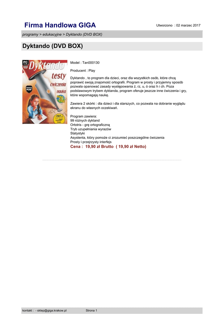 Firma Handlowa GIGA Utworzono : 02 marzec 2017 programy > edukacyjne > Dyktando (DVD BOX) Dyktando (DVD BOX) Model : Tan000130 Producent : Play Dyktando , to program dla dzieci, oraz dla wszystkich osób, które chcą poprawić swoją znajomość ortografii. Program w prosty i przyjemny sposób pozwala opanować zasady występowania ż, rz, u, ó oraz h i ch. Poza podstawowym trybem dyktanda, program oferuje jeszcze inne ćwiczenia i gry, które wspomagają naukę. Zawiera 2 skórki : dla dzieci i dla starszych, co pozwala na dobranie wyglądu ekranu do własnych oczekiwań. Program zawiera: 99 różnych dyktand Ortotris - grę ortograficzną Tryb uzupełniania wyrazów Statystyki Asystenta, który pomoże ci zrozumieć poszczególne ćwiczenia Prosty i przejrzysty interfejs Cena : 19,90 zł Brutto ( 19,90 zł Netto) kontakt : - [email protected] Strona 1