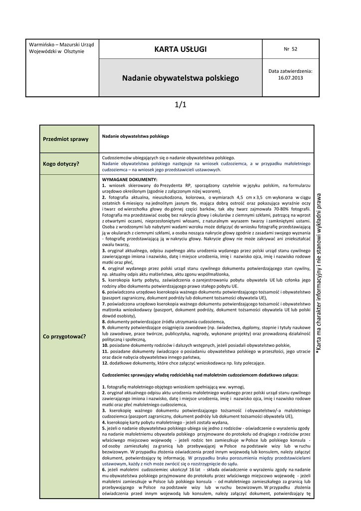 Warmińsko – Mazurski Urząd Wojewódzki w Olsztynie KARTA USŁUGI Nr 52 Nadanie obywatelstwa polskiego Data zatwierdzenia: 16.07.2013 1/1 Przedmiot sprawy Kogo dotyczy? Co przygotować? Nadanie obywatelstwa polskiego Cudzoziemców ubiegających się o nadanie obywatelstwa polskiego. Nadanie obywatelstwa polskiego następuje na wniosek cudzoziemca, a w przypadku małoletniego cudzoziemca – na wniosek jego przedstawicieli ustawowych. WYMAGANE DOKUMENTY: 1. wniosek skierowany do Prezydenta RP, sporządzony czytelnie w języku polskim, na formularzu urzędowo określonym (zgodnie z załączonym niżej wzorem), 2. fotografia aktualna, nieuszkodzona, kolorowa, o wymiarach 4,5 cm x 3,5 cm wykonana w ciągu ostatnich 6 miesięcy na jednolitym jasnym tle, mająca dobrą ostrość oraz pokazująca wyraźnie oczy i twarz od wierzchołka głowy do górnej części barków, tak aby twarz zajmowała 70-80% fotografii. Fotografia ma przedstawiać osobę bez nakrycia głowy i okularów z ciemnymi szkłami, patrzącą na wprost z otwartymi oczami, nieprzesłoniętymi włosami, z naturalnym wyrazem twarzy i zamkniętymi ustami. Osoba z wrodzonymi lub nabytymi wadami wzroku może dołączyć do wniosku fotografię przedstawiającą ją w okularach z ciemnymi szkłami, a osoba nosząca nakrycie głowy zgodnie z zasadami swojego wyznania - fotografię przedstawiającą ją w nakryciu głowy. Nakrycie głowy nie może zakrywać ani zniekształcać owalu twarzy, 3. oryginał aktualnego, odpisu zupełnego aktu urodzenia wydanego przez polski urząd stanu cywilnego zawierającego imiona i nazwisko, datę i miejsce urodzenia, imię i nazwisko ojca, imię i nazwisko rodowe matki oraz płeć, 4. oryginał wydanego przez polski urząd stanu cywilnego dokumentu potwierdzającego stan cywilny, np. aktualny odpis aktu małżeństwa, aktu zgonu współmałżonka, 5. kserokopia karty pobytu, zaświadczenia o zarejestrowaniu pobytu obywatela UE lub członka jego rodziny albo dokumentu potwierdzającego prawo stałego pobytu UE. 6. poświadczona urzędowo kserokopia ważnego dokumentu potwierdzającego tożsamość i obywatelstwo (paszport zagraniczny, dokument podróży lub dokument tożsamości obywatela UE), 7. poświadczona urzędowo kserokopia ważnego dokumentu potwierdzającego tożsamość i obywatelstwo małżonka wnioskodawcy (paszport, dokument podróży, dokument tożsamości obywatela UE lub polski dowód osobisty), 8. dokumenty potwierdzające źródła utrzymania cudzoziemca, 9. dokumenty potwierdzające osiągnięcia zawodowe (np. świadectwa, dyplomy, stopnie i tytuły naukowe lub zawodowe, prace twórcze, publicystyka, nagrody, wykonane projekty) oraz prowadzoną działalność polityczną i społeczną, 10. posiadane dokumenty rodziców i dalszych wstępnych, jeżeli posiadali obywatelstwo polskie, 11. posiadane dokumenty świadczące o posiadaniu obywatelstwa polskiego w przeszłości, jego utracie oraz dacie nabycia obywatelstwa innego państwa, 12. dodatkowe dokumenty, które chce załączyć wnioskodawca np. listy polecające. Cudzoziemiec sprawujący władzę rodzicielską nad małoletnim cudzoziemcem dodatkowo załącza: 1. fotografię małoletniego objętego wnioskiem spełniającą ww. wymogi, 2. oryginał aktualnego odpisu aktu urodzenia małoletniego wydanego przez polski urząd stanu cywilnego zawierającego imiona i nazwisko, datę i miejsce urodzenia, imię i nazwisko ojca, imię i nazwisko rodowe matki oraz płeć małoletniego cudzoziemca, 3. kserokopię ważnego dokumentu potwierdzającego tożsamość i obywatelstwo/-a małoletniego cudzoziemca (paszport zagraniczny, dokument podróży lub dokument tożsamości obywatela UE), 4. kserokopię karty pobytu małoletniego - jeżeli została wydana, 5. jeżeli o nadanie obywatelstwa polskiego ubiega się jedno z rodziców - oświadczenie o wyrażeniu zgody na nadanie małoletniemu obywatela polskiego przyjmowane do protokołu od drugiego z rodziców przez właściwego miejscowo wojewodę - jeżeli rodzic ten zamieszkuje w Polsce lub polskiego konsula od osoby zamieszkałej za granicą lub przebywającej w Polsce na podstawie wizy lub w ruchu bezwizowym. W przypadku złożenia oświadczenia przed innym wojewodą lub konsulem, należy załączyć dokument, potwierdzający tę informację. W przypadku braku porozumienia między przedstawicielami ustawowym, każdy z nich może zwrócić się o rozstrzygnięcie do sądu. 6. jeżeli małoletni cudzoziemiec ukończył 16 lat - składa oświadczenie o wyrażeniu zgody na nadanie mu obywatelstwa polskiego przyjmowane do protokołu przez właściwego miejscowo wojewodę - jeżeli małoletni zamieszkuje w Polsce lub polskiego konsula - od małoletniego zamieszkałego za granicą lub przebywającego w Polsce na podstawie wizy lub w ruchu bezwizowym. W przypadku złożenia oświadczenia przed innym wojewodą lub konsulem, należy załączyć dokument, potwierdzający tę Warmińsko – Mazurski Urząd Wojewódzki w Olsztynie KARTA USŁUGI Nr 52 Nadanie obywatelstwa polskiego Data zatwierdzenia: 16.07.2013 2/1 informację. Jakie dokumenty muszę wypełnić? 1.Wniosek o nadanie obywatelstwa polskiego wypełniony w całości. Wzór formularza wniosku określony został w rozporządzeniu Prezydenta Rzeczypospolitej z dnia 7 sierpnia 2012 r. w sprawie określenia wzoru formularza wniosku o nadanie obywatelstwa polskiego, wymogów dotyczących fotografii dołączonej do wniosku oraz wzorów aktu nadania obywatelstwa polskiego i zawiadomienia o odmowie nadania obywatelstwa polskiego (Dz. U. z 2012 r. poz. 927) – wniosek do pobrania Jak wypełnić dokumenty? Dokumenty należy wypełnić czytelnie, zgodnie z zawartymi objaśnieniami. Ile muszę zapłacić? Bez opłaty. Kiedy należy złożyć dokumenty? Nie ma określonego terminu. Gdzie załatwię sprawę? Warmińsko-Mazurski Urząd Wojewódzki w Olsztynie Al. Mar.J. Piłsudskiego 7/9 10-575 Olsztyn Złożyć osobiście w Wydziale Spraw Obywatelskich i Cudz