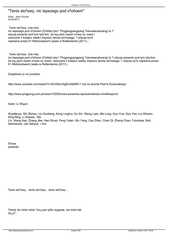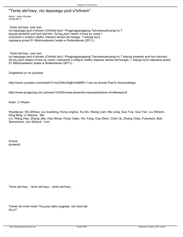 Integralny Tenis Sto³owy "Tenis sto³owy, nic lepszego pod s³oñcem" Autor: Jerzy Grycan 23.09.2011. Tenis sto³owy (nie ma) nic lepszego pod s³oñcem (Chiñski tytu³: Pingpingpangpang Tianxiawushuang) to 7 edycja piosenki pod tym tytu³em. Za ka¿dym razem s³owa s± nowe i zwi±zane z kolejn± wielk± imprez± tenisa sto³owego. 7 edycja by³a napisana przed 51 Mistrzostwami ¦wiata w Rotterdamie (2011)... Tenis sto³owy (nie ma) nic lepszego pod s³oñcem (Chiñski tytu³: Pingpingpangpang Tianxiawushuang) to 7 edycja piosenki pod tym tytu³em. Za ka¿dym razem s³owa s± nowe i zwi±zane z kolejn± wielk± imprez± tenisa sto³owego. 7 edycja by³a napisana przed 51 Mistrzostwami ¦wiata w Rotterdamie (2011)... Znajdziesz j± na youtube: http://www.youtube.com/watch?v=bCXNcUXgEmA&NR=1 lub na stronie Paw³a G±siorskiego: http://www.pingpong.com.pl/news/10330/nowa-piosenka-reprezentantow-chin#respond Autor: Li Wujun. Wystêpuj±: Shi Zhihao, Liu Guoliang, Kong Linghui, Xu Xin, Wang Liqin, Ma Long, Guo Yue, Guo Yan, Liu Shiwen, Ding Ning, Li Xiaoxia, Ma Lin, Wang Hao, Zhang Jike, Hao Shuai, Feng Yalan, Wu Yang, Cao Zhen, Chen Qi, Zhang Chao, Fukuhara, Boll, Samsonow, Joo Sehyuk i inni. S³owa piosenki: Tenis sto³owy... tenis sto³owy... tenis sto³owy... Trener do mnie mówi "mo¿esz tylko wygraæ, nie mów tak du¿o"; http://integralnytenisstolowy.com Kreator PDF Utworzono 2 March, 2017, 20:05 Integralny Tenis Sto³owy rodzice do mnie mówi± "daj z siebie wszystko, nie my¶l tak du¿o"; sam do siebie mówiê "o co w tym chodzi"& "czy nie o zwyciêstwo?" 51 Mistrzostwa ¦wiata w³a¶nie nas zapraszaj±. http://integralnytenisstolowy.com Kreator PDF Utworzono 2 March, 2017, 20:05 Integralny Tenis Sto³owy Zawody zaraz maj± siê zacz±æ. Gry pojedyncze mê¿czyzn, kobiet, przeciwnicy s± bardzo silni. Konfrontacji nie da siê unikn±æ. Gra przy wrzasku kibiców jest dla nich ogromn± przewag±, wzmaga chêæ dostarczenia swoim krajom dobrych prze¿yæ, i dodatkow± chêæ zwyciêstwa. http://integralnytenisstolowy.com Kreator PDF Utworzono 2 March, 2017, 20:05 Integralny Tenis Sto³owy Zdobyæ dla swojego kraju chwa³ê i zwyciêstwo. Jest czyst± przyjemno¶ci± wygraæ te zawody. Drugim zawodnikiem rankingu ¶wiatowego jest niemiecki zawodnik Boll, jest jeszcze nowocze¶nie graj±cy Japoñczyk Mizutani, weteran z Bia³orusi Samsonow, http://integralnytenisstolowy.com Kreator PDF Utworzono 2 March, 2017, 20:05 Integralny Tenis Sto³owy defensor z Korei, który nazywa siê Joo Sehyuk. Feng Tianwei z Singapuru, Japonka Fukuhara Ai (Fuyuan Ai). Shen Yanfei z Hiszpanii. Kim Kyungah (Jin Jinge) z Korei Po³udniowej Wszyscy ci wspaniali zawodnicy zebrani w jednej du¿ej hali, obecni pod ¶wiat³em jupiterów. Tylko tenis sto³owy! No i trzeba te¿ zobaczyæ nas Chiñczyków. http://integralnytenisstolowy.com Kreator PDF Utworzono 2 March, 2017, 20:05 Integralny Tenis Sto³owy Trener do mnie mówi "mo¿esz tylko wygraæ, nie mów tak du¿o"; rodzice do mnie mówi± "daj z siebie wszystko, nie my¶l tak du¿o"; sam do siebie mówiê "o co w tym chodzi"& "czy nie o zwyciêstwo?" http://integralnytenisstolowy.com Kreator PDF Utworzono 2 March, 2017, 20:05 Integralny Tenis Sto³owy (Ai Fukuhara): Nazywam siê Ai Fukuhara, kocham tenis sto³owy (Mizutani): kocham tenis sto³owy (Samsonow): kocham Mistrzostwa ¦wiata (Joo Sehyuk): kocham Mistrzostwa ¦wiata http://integralnytenisstolowy.com Kreator PDF Utworzono 2 March, 2017, 20:05 Integralny Tenis Sto³owy (Boll): Tenis sto³owy, nie ma nic lepszego pod s³oñcem Mistrz Olimpijski i zdobywca Pucharu ¦wiata Ma Lin, jeszcze tylko brakuje mu tytu³u Mistrza ¦wiata. Liu Guoliang i Kong Linghui zdobyli po razie to trofeum. http://integralnytenisstolowy.com Kreator PDF Utworzono 2 March, 2017, 20:05 Integralny Tenis Sto³owy Zobacz czy tym razem Ma Lin otworzy nowy rozdzia³ w historii tenisa sto³owego. Wang Hao to Mistrz ¦wiata z 2009 roku, jego celem w Rotterdamie jest zdobyæ koronê mistrza ponownie. Odesz³y Zhang Yining i Wang Nan, kto jest teraz liderem? W dru¿ynie kobiet, podobnie jak dawniej, pierwsza czwórka http://integralnytenisstolowy.com Kreator PDF Utworzono 2 March, 2017, 20:05 Integralny Tenis Sto³owy gra najpiêkniej. W deblu mê¿czyzn i kobiet, w grze mieszanej, omawiamy najlepsze po³±czenia. Tym razem Wang Hao, Ma Long, Hao Shuai, Zhang Jike. Ta czwórka ma wsparcie, jeszcze nie powiem konkretnie... Podczas zawodów jest konieczne wzajemne wsparcie, tak, absolutnie, tego nie da siê unikn±æ. http://integralnytenisstolowy.com Kreator PDF Utworzono 2 March, 2017, 20:05 Integralny Tenis Sto³owy Konkurencja w deblu jest bardzo silna. Trzeba pewnie staæ na ziemi aby wygraæ. Musimy sprostaæ wyzwaniu. Tylko zachowuj±c pewno¶æ siebie mo¿esz wygraæ puchar zwyciêscy. http://integralnytenisstolowy.com Kreator PDF Utworzono 2 March, 2017, 20:05 Integralny Tenis Sto³owy Trener do mnie mówi "mo¿esz tylko wygraæ, nie mów tak du¿o"; rodzice do mnie mówi± "daj z siebie wszystko, nie my¶l tak du¿o"; sam do siebie mówiê "o co w tym chodzi"& "czy nie o zwyciêstwo?" (T³umaczenie: Jerzy Grycan; osoby, które znaj± lepiej ode mnie jêzyk chiñski proszê o ewentualne korekty) http://integralnytenisstolowy.com Kreator PDF Utworzono 2 March, 2017, 20:05