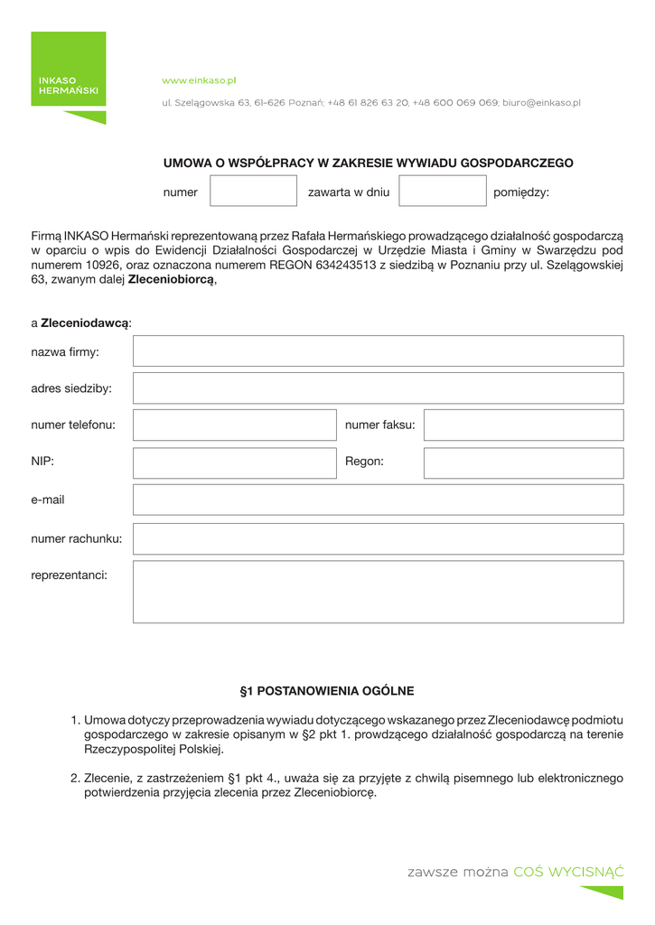 UMOWA O WSPÓŁPRACY W ZAKRESIE WYWIADU GOSPODARCZEGO numer zawarta w dniu pomiędzy: Firmą INKASO Hermański reprezentowaną przez Rafała Hermańskiego prowadzącego działalność gospodarczą w oparciu o wpis do Ewidencji Działalności Gospodarczej w Urzędzie Miasta i Gminy w Swarzędzu pod numerem 10926, oraz oznaczona numerem REGON 634243513 z siedzibą w Poznaniu przy ul. Szelągowskiej 63, zwanym dalej Zleceniobiorcą, a Zleceniodawcą: nazwa firmy: adres siedziby: numer telefonu: numer faksu: NIP: Regon: e-mail numer rachunku: reprezentanci: §1 POSTANOWIENIA OGÓLNE 1. Umowa dotyczy przeprowadzenia wywiadu dotyczącego wskazanego przez Zleceniodawcę podmiotu gospodarczego w zakresie opisanym w §2 pkt 1. prowdzącego działalność gospodarczą na terenie Rzeczypospolitej Polskiej. 2. Zlecenie, z zastrzeżeniem §1 pkt 4., uważa się za przyjęte z chwilą pisemnego lub elektronicznego potwierdzenia przyjęcia zlecenia przez Zleceniobiorcę. 3. Zleceniodawca zobowiązuje się przekazać Zleceniobiorcy pełną nazwę, formę prawną oraz posiadane dane adresowe badanego podmiotu. 4. Zleceniobiorca ma prawo odmowy przyjęcia zlecenia, zawiadamiając o tym fakcie Zleceniodawcę w terminie 24 godzin od daty otrzymania zlecenia. §2 TRYB PRACY NAD ZLECENIEM 1. Zleceniobiorca dołoży wszelkich starań, aby ustalić dla Zleceniodawcy następujące informacje o badanym podmiocie (w zależności od formy prawnej): a. dane teleadresowe oraz rejestrowe, b. strukturę kapitałową, powiązania i spółki zależne, c. sytuację finansową firmy, d. majątek spółki (nieruchomości, ruchomości), e. wielkość zatrudnienia, f. informacje o zaległościach finansowych, komorniczych postępowaniach egzekucyjnych oraz zleceniach prowadzonych przez firmy windykacyjne (w tym dane z biur informacji gospodarczej), g. dane członków zarządu i wspólników, h. aktualny nr rachunku bankowego, i. informacje dodatkowe np. informacje o dotacjach, inwestycjach, rozbudowach etc. 2. Zleceniobiorca nie gwarantuje pozyskania wymienionych w §2 pkt 1. informacji dla każdego badanego podmiotu. 3. Zleceniobiorca pozyskuje wymienione w §2 pkt 1. informacje z ogólnodostępnych źródeł, zgodnie z obowiązującymi w RP przepisami oraz zgodnie z branżowym kodeksem etycznym. 4. Na podstawie zabranych informacji Zleceniobiorca wystawi opinię na temat ryzyka związanego z podjęciem, lub kontynuowaniem współpracy z badanym podmiotem. 5. Zleceniobiorca oświadcza, że opinia o której mowa w §2 pkt 2. stanowi jednynie sugestę dla Zleceniodawcy. Zleceniobiorca nie gwarantuje i nie ponosi odpowiedzialności za rezultat decyzji podjętych przez Zleceniodawcę na podstawie wystawionej opinii. §3 ZAKOŃCZENIE ZLECENIA 1. Przekazanie Zleceniodawcy elektronicznie lub pocztą tradycyjną raportu uznawane jest za zakończenie zlecenia. Zleceniodawca zobowiązany jest do zapłacenia wynagrodzenia zgodnie z §4 niniejszej umowy. 2. W przypadku wycofania przez Zleceniodawcę zlecenia w trakcie realizajcji, Zleceniodawca jest zobowiązany do zapłacenia Zleceniobiorcy kary umownej w wysokości pełnego wynagrodzenia, które Zleceniobiorca otrzymałaby realizując zlecenie. 3. Zleceniobiorcy przysługuje prawo do odstąpienia od zlecenia w terminie do 24 godzin od powzięcia wiadomości o okoliczności uzasadniającej wykonanie prawa odstąpienia. 4. Do okoliczności, o której mowa w §3 pkt 3. należą: a. Zleceniodawca nie wywiązuje się w terminie z należnych opłat wobec Zleceniobiorcy, b. Zleceniodawca nie odpowiada na korespondencję kierowaną przez Zleceniobiorcę, c. Zleceniodawca nie wywiązuje się ze zobowiązań określonych w §6 pkt 2. 5. W przypadku odstąpienia od zlecenia przez Zleceniobiorcę z przyczyn, o których mowa w §3 pkt 4., Zleceniodawca zapłaci Zleceniobiorcy wynagrodzenie jak w §3 pkt 2. niniejszego paragrafu. §4 OPŁATY I PROWIZJE 1. Zleceniodawca zobowiązuje się zapłacić na rzecz Zleceniobiorcy wynagrodzenie w wysokości 420 zł netto (w opłacie uwzględiono już 40% rabatu) za każde wykonane badanie podmiotu gospodarczego (wywiadu). 2. Zleceniodawca zobowiązuje się do zapłaty wynagrodzenia przysługującego Zleceniobiorcy w terminie 7 dni od daty wystawienia faktury VAT §5 ROZWIĄZANIE UMOWY 1. Umowa zawarta jest na czas nieokreślony. 2. Rozwiązanie umowy może nastąpić wyłącznie w formie pisemnej pod rygorem nieważności, z zachowaniem trzymiesięcznego okresu wypowiedzenia ze skutkiem na koniec miesiąca kalendarzowego. 3. Zlecenia przyjęte w okresie wypowiedzenia umowy prowadzone są zgodnie z warunkami niniejszej umowy. 4. Zleceniobiorca może rozwiązać umowę bez okresu wypowiedzenia, gdy Zleceniodawca nie wywiązuje się w terminie z opłat wynikających z §4 niniejszej umowy. §6 POSTANOWIENIA KOŃCOWE 1. Zleceniobiorca zobowiązuje się do należytej staranności przy prowadzeniu zleconej sprawy, zgodnie z aktualnym stanem prawnym. 2. Zleceniodawca oświadcza, że przekazane Zleceniobiorcy dokumenty oraz wszelkie inne informacje niezależnie od formy ich przekazania są zgodne ze stanem faktycznym. 3. Wszelkie decyzje Zleceniodawcy dotyczące dalszego toku prowadzenia zlecenia podejmowane muszą być w formie pisemnej lub elektronicznej. 4. Zleceniobiorca zobowiązuje się do zachowania w tajemnicy informacji uzyskanych od Zleceniodawcy oraz do przetwarzania tych informacji tylko i wyłącznie do celów realizacji niniejszej umowy. 5. Strony zobowiązują się do zachowania tajemnicy dotyczącej wszelkich otrzymanych dokumentów i informacji na czas trwania umowy i po jej zakończeniu. 6. Wszelkie zmiany niniejszej umowy wymagają formy pisemnej pod rygorem nieważności. Formą obowiązującą dla zmian jest aneks do umowy. 7. Sądem właściwym do rozstrzygania spraw spornych, wynikających z niniejszej umowy, jest sąd właściwy dla siedziby Zleceniobiorcy. 8. Zleceniodawca upoważnia Zleceniobiorcę do wystawiania faktur VAT bez podpisu odbi