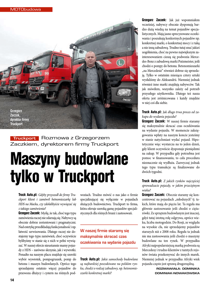 MOTObudowa Grzegorz Zaczek: Jak już wspomniałem wcześniej, nabywcy obecnie dysponują bardzo dużą wiedzą na temat pojazdów specjalistycznych. Mają jasno sprecyzowane oczekiwania i poszukują konkretnych pojazdów np. konkretnej marki, o konkretnej mocy i z taką a nie inną zabudową. Trudno tutaj snuć jakieś uogólnienia, choć na pewno największym zainteresowaniem cieszą się podwozia Mercedes-Benz z zabudową marki Putzmeister, jeśli chodzi o pompy do betonu. Betonomieszarki „na Mercedesie” również dobrze się sprzedają. Tylko w ostatnim miesiącu cztery sztuki wysłaliśmy do Aleksandrii. Niemniej jednak również inne marki znajdują nabywców. Tak jak mówiłem, wszystko zależy od potrzeb przyszłego użytkownika. Dlatego też nasza oferta jest zróżnicowana i każdy znajdzie w niej coś dla siebie. Grzegorz Zaczek, dyrektor firmy Truckport Truckport Rozmowa z Grzegorzem Zaczkiem, dyrektorem firmy Truckport Maszyny budowlane tylko w Truckport Truck Auto.pl: Gdyby przyszedł do firmy Truckport klient i zamówił betnomieszarkę lub HDS na Macku, czy zdołalibyście wywiązać się z takiego zamówienia? Grzegorz Zaczek: Myślę, że tak, choć tego typu zamówienia raczej nie zdarzają się. Nabywcy są obecnie dobrze zorientowani i pragmatyczni. Nad estetykę przedkładają funkcjonalność i np. łatwość serwisowania. Dlatego raczej nie dostajemy tego typu zamówień, choć oczywiście bylibyśmy w stanie się z nich w pełni wywiązać. W naszej ofercie nieustannie mamy pojazdy z HDS – zarówno skrzynie, jak i wywrotki. Ponadto na naszym placu znajduje się szeroki wybór wywrotek, pompogruszek, pomp do betonu i maszyn budowlanych. Oprócz tego sprzedajemy ostatnio więcej pojazdów do przewozu dłużycy i cystern na różnych pod14 woziach. Trudno mówić o nas jako o firmie specjalizującej się wyłącznie w pojazdach służących budownictwu. Truckport to firma, która oferuje szeroką gamę pojazdów specjalistycznych dla różnych branż i zastosowań. W naszej firmie staramy się maksymalnie skracać czas oczekiwania na wydanie pojazdu Truck Auto.pl: Jakie samochody budowlane są najbardziej poszukiwane na polskim rynku, chodzi o rodzaj zabudowy, np. betonomieszarki konkretnej marki? Truck Auto.pl: Jak długo trwa proces od zakupu do wydania pojazdu? Grzegorz Zaczek: W naszej firmie staramy się maksymalnie skracać czas oczekiwania na wydanie pojazdu. W momencie zaksięgowania wpłaty na naszym koncie jesteśmy w stanie natychmiast wydać pojazd. Hipotetycznie więc wystarcza na to jeden dzień, gdy klient oczywiście dysponuje pieniędzmi na zakup. W przypadku gdy potrzebna jest pomoc w finansowaniu, to cała procedura nieznacznie się wydłuża. Zazwyczaj jednak tego typu transakcje są finalizowane do dwóch tygodni. Truck Auto.pl: Z jakich rynków najczęściej sprowadzacie pojazdy, w jakim przeciętnym wieku? Grzegorz Zaczek: Obecnie staramy się koncentrować na pojazdach „młodszych” tj. takich, które mają do pięciu lat. Ta reguła ma głównie zastosowanie jeśli chodzi o ciężarówki. Ze sprzętem budowlanym jest inaczej, gdyż tutaj istotną rolę odgrywa, oprócz wieku, liczba motogodzin. Do Rosji, ze względu na wysokie cła, nie sprzedajemy pojazdów starszych niż z 2008 roku. Reguła ta jednak nie ma zastosowania jeśli chodzi o maszyny budowlane na ten rynek. W przypadku Afryki najpopularniejszą marką podwozia są Mercedesy i trudno klientów z tamtych rejonów świata przekonywać do innych marek. Niemniej jednak w przypadku Afryki wiek pojazdu często jest sprawą drugorzędną. Rozmawiała: DOMINIKA DOMINIAK-NOWAKOWSKA