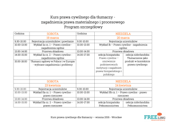 Kurs prawa cywilnego dla tłumaczy zagadnienia prawa materialnego i procesowego Program szczegółowy Godzina 9.30-10.00 10.00-13.00 13.00-14.00 14.00-15.00 15.00-18.00 SOBOTA 19 marca Rejestracja uczestników i powitanie Wykład Ia cz. 1 – Prawo cywilne zagadnienia ogólne Przerwa obiadowa Wykład Ia cz. 2 – Prawo cywilne zagadnienia ogólne Tłumacz sądowy w Polsce i w Europie - wybrane zagadnienia i problemy Godzina 9.30-10.00 10.00-13.00 13.00-14.00 14.00-17.00 SOBOTA 23 kwietnia 9.30-10.00 10.00-13.00 13.00-14.00 14.00-15.00 Rejestracja uczestników Wykład IIa cz. 1 – Prawo cywilne prawo rzeczowe Przerwa obiadowa Wykład IIa cz. 2 – Prawo cywilne prawo rzeczowe NIEDZIELA 20 marca Rejestracja uczestników Wykład Ib – Prawo cywilne - zagadnienia ogólne Przerwa obiadowa sekcja niderlandzka sekcja hiszpańska Prawo cywilne – Tłumaczenie jako omówienie produkt w kontekście podstawowych prawa cywilnego instytucji i zagadnień prawa hiszpańskiego i polskiego NIEDZIELA 24 kwietnia 9.30-10.00 10.00-13.00 13.00-14.00 14.00-17.00 Rejestracja uczestników Wykład IIb cz. 1 – Prawo cywilne - prawo rzeczowe Przerwa obiadowa sekcja hiszpańska sekcja niderlandzka Pełnomocnictwa Pełnomocnictwa Kurs prawa cywilnego dla tłumaczy – wiosna 2016 - Wrocław 15.00-18.00 Problemy z odmianą i zapisem nazwisk w języku polskim oraz wybrane trudności gramatyczne SOBOTA 14 maja 9.30-10.00 10.00-13.00 13.00-14.00 14.00-15.00 15.00-18.00 Rejestracja uczestników i powitanie Wykład IIIa cz. 1 – Prawo zobowiązań Przerwa obiadowa Wykład IIIa cz. 2 – Prawo zobowiązań Poprawność językowa w języku prawnym i prawniczym – cześć I NIEDZIELA 15 maja 9.30-10.00 10.00-13.00 13.00-14.00 14.00-17.00 SOBOTA 11 czerwca 9.30-10.00 10.00-13.00 13.00-14.00 14.00-15.00 15.00-18.00 Rejestracja uczestników i powitanie Wykład IVa cz. 1 – Prawo spadkowe Przerwa obiadowa Wykład IVa cz. 2 – Prawo spadkowe Poprawność językowa w języku prawnym i prawniczym – część II Rejestracja uczestników Wykład IIIb – Prawo zobowiązań Przerwa obiadowa sekcja hiszpańska sekcja niderlandzka Umowy Umowy cywilnoprawne cywilnoprawne NIEDZIELA 12 czerwca 9.30-10.00 10.00-13.00 13.00-14.00 14.00-17.00 Rejestracja uczestników Wykład IVb – Elementy prawa procesowego Przerwa obiadowa sekcja hiszpańska sekcja niderlandzka Dokumenty w Testamenty sprawach rodzinnych Kurs prawa cywilnego dla tłumaczy – wiosna 2016 - Wrocław PLAN WYKŁADÓW Prowadząca: Katarzyna Piórkowska-Frątczak Prawo cywilne - zagadnienia ogólne 1. System prawa cywilnego; źródła prawa. 2. Zakres przedmiotowy i podmiotowy prawa cywilnego 3. 4. 5. 6. 7. 8. 9. Zakres pojęciowy kodeksu cywilnego Podmioty prawa cywilnego Ustanie osoby prawnej Tzw. niepełne osoby prawne – istota i ich rola w obrocie Dobra osobiste i ich ochrona prawna Stosunek cywilnoprawny Czynności prawne Prawo cywilne - prawo rzeczowe 1. 2. 3. 4. 5. 6. 7. 8. Wady oświadczeń woli Skutki wadliwych oświadczeń woli Rodzaje przedstawicielstwa Pojęcie roszczenia w prawie cywilnym Rodzaje warunków w prawie cywilnym Prawo własności Pojęcie użytkowania wieczystego oraz zakres wykonywania prawa Prawa rzeczowe ograniczone Kurs prawa cywilnego dla tłumaczy – wiosna 2016 - Wrocław Prawo zobowiązań 1. 2. 3. 4. 5. 6. 7. 8. 9. 10. Zobowiązania umowne Rodzaje zobowiązań Skutki niewykonania zobowiązań Bezpodstawne wzbogacenie – definicja i skutki Czyny niedozwolone Zasada swobody umów Definicje kodeksowe Rodzaje umów Rękojmia a gwarancja Najem a dzierżawa Prawo spadkowe 1. 2. 3. 4. 5. 6. 7. Spadek Niegodność dziedziczenia Pojęcie przebaczenia Dziedziczenie ustawowe Dziedziczenie testamentowe Zapis i polecenie Zachowek Elementy prawa procesowego 1. 2. 3. 4. 5. 6. Zagadnienia ogólne procesu cywilnego Uczestnicy postępowania cywilnego Elementy formalne pozwu oraz skutki jego wniesienia Rodzaje dowodów Rodzaje orzeczeń Środki odwoławcze zwyczajne i nadzwyczajne Kurs prawa cywilnego dla tłumaczy – wiosna 2016 - Wrocław OPIS WARSZTATÓW Tłumacz sądowy w Polsce i w Europie - wybrane zagadnienia i problemy Prowadzący: dr Rafał Szubert 1. 2. 3. 4. 5. 6. Tłumaczenie sądowe - niejasne wyobrażenie Tłumaczenie sądowe - zakres pojęcia Tłumaczenie na sali sądowej - ewolucja pojęcia Sala sądowa jako obszar działania translatorycznego Nakreślenie ramy działania translatorycznego dla tłumacza sądowego w Europie Próba określenia teoretycznego konceptu translacyjnego; optymalizacja pracy tłumacza sądowego z perspektywy funkcjonalnopragmatycznej Problemy z odmianą i zapisem nazwisk w języku polskim oraz wybrane trudności gramatyczne Prowadzący: dr hab. Piotr Kładoczny Warsztaty w pierwszej części będą dotyczyć typowych kłopotów z odmianą nazwisk polskich oraz obcych. Zdecydowana większość polskich nazwisk odmienia się swobodnie, lecz z pewnych względów boimy się używać różnych form, by nie popełnić błędu lub nie urazić jego nosiciela. Warsztaty mają pokazać, jak należy nazwiska odmieniać, dać uczestnikom pewność w poprawnym zastosowaniu ich odmiany i pokazać najczęściej spotykane błędy. W drugiej części zostanie przedstawionych kilka problemów językowych z zapisem skrótów i skrótowców, użyciem imiesłowów w zdaniu oraz uproszczeń semantycznych w wypowiedziach. Kurs prawa cywilnego dla tłumaczy – wiosna 2016 - Wrocław Poprawność językowa w języku prawnym i prawniczym Prowadząca: dr Anna Mróz Cele szkolenia: Uczestnicy szkolenia zapoznają się ze specyfiką języka prawa na poziomie stylistycznym, leksykalnym i składniowym. Celem jest wskazanie na charakterystyczne błędy pojawiające się w tego rodzaju tekstach, jak również w ich tłumaczeniach z języków obcych. Uchybienia językowe w pismach prawnych i prawniczych prowadzą wielokrotnie do niejasności, problemów ze zrozumieniem wypowiedzi czy jej dwuznaczności. Dlatego tak ważna jest znajomość no