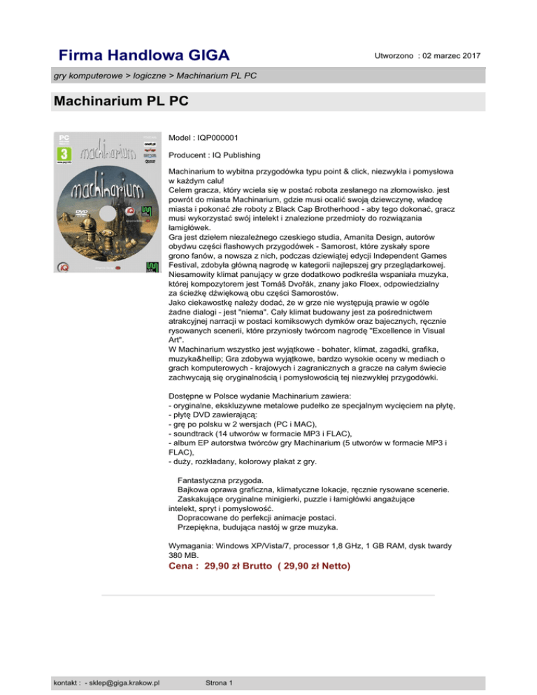Firma Handlowa GIGA Utworzono : 02 marzec 2017 gry komputerowe > logiczne > Machinarium PL PC Machinarium PL PC Model : IQP000001 Producent : IQ Publishing Machinarium to wybitna przygodówka typu point & click, niezwykła i pomysłowa w każdym calu! Celem gracza, który wciela się w postać robota zesłanego na złomowisko. jest powrót do miasta Machinarium, gdzie musi ocalić swoją dziewczynę, władcę miasta i pokonać złe roboty z Black Cap Brotherhood - aby tego dokonać, gracz musi wykorzystać swój intelekt i znalezione przedmioty do rozwiązania łamigłówek. Gra jest dziełem niezależnego czeskiego studia, Amanita Design, autorów obydwu części flashowych przygodówek - Samorost, które zyskały spore grono fanów, a nowsza z nich, podczas dziewiątej edycji Independent Games Festival, zdobyła główną nagrodę w kategorii najlepszej gry przeglądarkowej. Niesamowity klimat panujący w grze dodatkowo podkreśla wspaniała muzyka, której kompozytorem jest Tomáš Dvořák, znany jako Floex, odpowiedzialny za ścieżkę dźwiękową obu części Samorostów. Jako ciekawostkę należy dodać, że w grze nie występują prawie w ogóle żadne dialogi - jest "niema". Cały klimat budowany jest za pośrednictwem atrakcyjnej narracji w postaci komiksowych dymków oraz bajecznych, ręcznie rysowanych scenerii, które przyniosły twórcom nagrodę "Excellence in Visual Art". W Machinarium wszystko jest wyjątkowe - bohater, klimat, zagadki, grafika, muzyka… Gra zdobywa wyjątkowe, bardzo wysokie oceny w mediach o grach komputerowych - krajowych i zagranicznych a gracze na całym świecie zachwycają się oryginalnością i pomysłowością tej niezwykłej przygodówki. Dostępne w Polsce wydanie Machinarium zawiera: - oryginalne, ekskluzywne metalowe pudełko ze specjalnym wycięciem na płytę, - płytę DVD zawierającą: - grę po polsku w 2 wersjach (PC i MAC), - soundtrack (14 utworów w formacie MP3 i FLAC), - album EP autorstwa twórców gry Machinarium (5 utworów w formacie MP3 i FLAC), - duży, rozkładany, kolorowy plakat z gry. Fantastyczna przygoda. Bajkowa oprawa graficzna, klimatyczne lokacje, ręcznie rysowane scenerie. Zaskakujące oryginalne minigierki, puzzle i łamigłówki angażujące intelekt, spryt i pomysłowość. Dopracowane do perfekcji animacje postaci. Przepiękna, budująca nastój w grze muzyka. Wymagania: Windows XP/Vista/7, processor 1,8 GHz, 1 GB RAM, dysk twardy 380 MB. Cena : 29,90 zł Brutto ( 29,90 zł Netto) kontakt : - [email protected] Strona 1