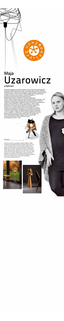 Maja Uzarowicz projektant Absolwentka Wydziału Architektury Wnętrz i Wzornictwa Przemysłowego ASP w Poznaniu (2009). Dyplomowy projekt, opracowany pod kierunkiem dr Marzeny Wolińskiej, został nominowany do Konkursu im. Marii Dokowicz i zaprezentowany w Galerii Arsenał w Poznaniu. Był to MOBILE HOME, dom dla współczesnych nomadów, mieszczący się w walizce o wymiarach 80x55 cm. Domeną jej aktywności twórczej pozostają wnętrza. Współpracuje z Adamem Pulwickim w pracowni projektowej „Pulva”, z którym rozwija również pomysł autorskiej pracowni kwiatowej „17/8”. Prostota, funkcjonalność, perfekcyjny detal, a przede wszystkim harmonia i spójność, to najważniejsze drogowskazy, którymi kieruje się w projektowaniu zarówno mebli, oświetlenia, ceramiki czy grafiki, jak i całych wnętrz. Doskonałym wzorem jest dla niej japoński minimalizm z jego bardzo surowym, ale i wysublimowanym, bionicznym projektowaniem. Zwłaszcza prace zespołu studia „Nendo”, który zmaga się z wieloma dziedzinami projektowania, mobilizują ją do ustawicznych poszukiwań. - Czasami myślę, że design to dodatek całkowicie zbędny człowiekowi, że my – projektanci – kreujemy w nim zupełnie niepotrzebnie sztuczne potrzeby. Jednak za każdym razem, kiedy trafiam na zacinające się drzwi, niefunkcjonalny mebel, brzydkie wnętrze, natychmiast mam ochotę zmieniać świat na ładniejszy i lepiej przystosowany do życia – mówi. Runaway Korzenie tej lampy wyrastają z projektu MOBILE HOME – mieszkania dla współczesnych nomadów. Można się z nią „nosić” po całym domu, a nawet wyjść na balkon lub do ogrodu. Sama jest bowiem bardzo długim przedłużaczem. Nowoczesna w formie nawiązuje do lampy z tradycyjnym, wręcz mieszczańskim abażurem. Bo przecież dom, to dom nawet dla tych, którzy ciągle żyją w ruchu. Chcą więc, żeby kojarzył się z ciepłem, przytulnością i bezpieczeństwem. Zależnie od wykończenia lampa nabiera różnego charakteru: może być transparentnym, subtelnym świetlikiem lub surową, drewnianą formą.