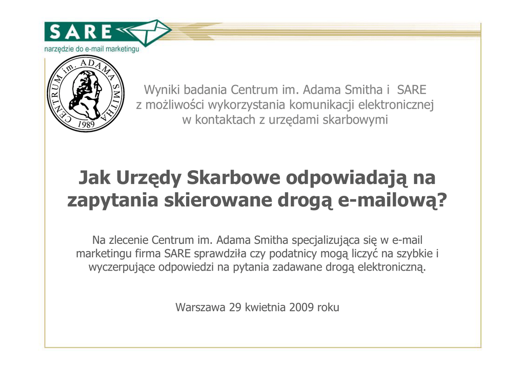 Wyniki badania Centrum im. Adama Smitha i SARE z możliwości wykorzystania komunikacji elektronicznej w kontaktach z urzędami skarbowymi Jak Urzędy Skarbowe odpowiadają na zapytania skierowane drogą e-mailową? Na zlecenie Centrum im. Adama Smitha specjalizująca się w e-mail marketingu firma SARE sprawdziła czy podatnicy mogą liczyć na szybkie i wyczerpujące odpowiedzi na pytania zadawane drogą elektroniczną. Warszawa 29 kwietnia 2009 roku Zapytanie - zapytanie o informację odnośnie nowo wprowadzonych ulg w rozliczeniach rocznych związanych z zakupem mieszkania - wysłane w dniu 5 marca do 51 Urzędów Skarbowych w woj.mazowieckim - baza adresów e-mail Urzędów Skarbowych pozyskana ze strony http://www.pracuj.pl/Kalkulatory/kalkulator_mapa_oddzialow_us.aspx?adwo rds&gclid=CKuyu7u49ZgCFQeRZgodj3vf7Q E-mail z pytaniem Odpowiedzi - odpisało zaledwie 54% - 4 urzędy odpowiedziały w dniu otrzymania zapytania: II US WarszawaŚródmieście, US Warszawa-Bielany, US w Szydłowcu i US w Radomiu - 1 urząd odpisał po miesiącu – US Targówek - informacje uzyskiwane drogą mailową różniły się między sobą: - zaledwie 3 urzędy przesłały prawidłową odpowiedź z powołaniem się na odpowiednie przepisy -17 urzędów Skarbowych nie podjęło się interpretacji przepisów i odesłało do ministra właściwego do spraw finansów lub do biura Krajowej Informacji Podatkowej w Płocku - w pozostałych przypadkach udzielano niepełnej odpowiedzi, proszono o kontakt telefoniczny, odsyłano do innych urzędów Wzorowa odpowiedź – przykład Kozienice, dnia 09.03.2009r. Naczelnik Urzędu Skarbowego w Kozienicach tel. (0-48) 611-22-59 e-mail: [email protected] 1408/PD/412-17/09/MŁ Pani Natalia Paczóska W nawiązaniu do Pani pisma przesłanego pocztą elektroniczną w dniu 05.03.2009r Naczelnik Urzędu Skarbowego w Kozienicach informuje, że zgodnie z art.168 par.2 ustawy z dnia 29 sierpnia 1997r. Ordynacja podatkowa /Dz.U. z 2005r. Nr 8, poz.60 z poźn.zm/ podanie powinno zawierać m.in. wskazanie osoby, od której pochodzi, oraz jej adres (miejsce zamieszkania lub pobytu, siedziba albo miejsce prowadzenia działalności), a także numer NIP (art.11 ustawy z dnia 13.10.1995r. o zasadach ewidencji i identyfikacji podatników i płatników /Dz.U. z 2004r. Nr 269, poz.2681 z późn.zm/. Jednocześnie informuję, że odliczanie wydatków na spłatę odsetek od kredytu reguluje przepis art.9 ustawy z dnia 16.11.2006r. o zmianie ustawy o podatku dochodowym od osób fizycznych oraz o zmianie niektórych innych ustaw /Dz.U Nr217, poz.1588, zm.Dz.U. z 2008r. Nr 209, poz.1316/ (na zasadzie praw nabytych, gdy kredyt został udzielony w latach 2002-2006) oraz art.26b ustawy z dnia 26 lipca 1991r o podatku dochodowym od osób fizycznych w brzmieniu obowiązującym do dnia 31.12.2006r. (Dz.U. z 2000r. nr 14, poz.176 z późn.zm.). Zgodnie z art.26b ust. 1 w/w ustawy od podstawy obliczenia podatku (…) odlicza się wydatki na spłatę odsetek od kredytu/pożyczki udzielonego na sfinansowanie inwestycji mającej na celu zaspokojenie własnych potrzeb mieszkaniowych, związanej z: • • • • budową budynku mieszkalnego albo wniesieniem wkładu budowlanego lub mieszkaniowego do spółdzielni mieszkaniowej na nabycie prawa do nowo budowanego budynku mieszkalnego albo lokalu mieszkalnego w takim budynku albo zakupem nowo wybudowanego budynku mieszkalnego lub lokalu mieszkalnego w takim budynku od gminy albo osoby, która wybudowała ten budynek w wykonywaniu działalności gospodarczej albo nadbudową lub rozbudową budynku na cele mieszkalne lub przebudową (przystosowaniem) budynku niemieszkalnego, jego części lub pomieszczenia niemieszkalnego na cele mieszkalne, w wyniku których powstanie samodzielne mieszkanie spełniające wymagania określone w przepisach prawa budowlanego. Kontakt telefoniczny z Urzędem Skarbowym pod numerem telefonu 611-22-59 wew.321 Naczelnik Urzędu Skarbowego mgr inż. Roman Frąckiewicz /podpis na oryginale/ Ogólne wnioski - co drugi e-mail pozostał bez odpowiedzi. Za zadowalającą trudno także uznać szybkość reakcji urzędników -problemów komunikacyjnych mogą przysparzać podatnikom mało intuicyjne adresy e-mail, którymi posługują się urzędnicy (np. [email protected]) oraz fakt, że część odpowiedzi wysyłana jest z zupełnie innych maili niż te, na które były kierowane zapytania. -pozytywne natomiast jest to, że do danych kontaktowych poszczególnych Urzędów Skarbowych stosunkowo łatwo można dotrzeć przez Internet. -coraz częściej administracja państwowa korzysta z newsletterów jako narzędzia komunikacji z petentami. Ogranicza to ilość pytań kierowanych do urzędników oraz umożliwia szybkie przekazanie najistotniejszych informacji. Na regularne informacje wysyłane w tej formie mogą liczyć choćby podatnicy podlegający Urzędowi Skarbowemu w Płońsku