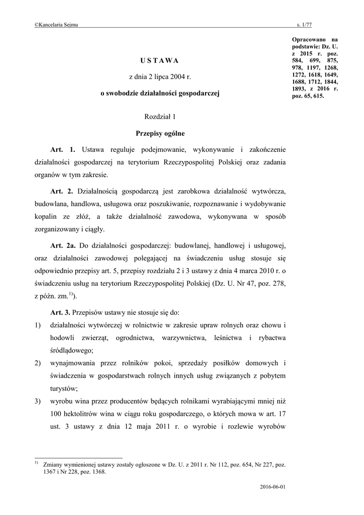 ©Kancelaria Sejmu s. 1/77 Opracowano na podstawie: Dz. U. z 2015 r. poz. 584, 699, 875, 978, 1197, 1268, 1272, 1618, 1649, 1688, 1712, 1844, 1893, z 2016 r. poz. 65, 615. U S T AWA z dnia 2 lipca 2004 r. o swobodzie działalności gospodarczej Rozdział 1 Przepisy ogólne Art. 1. Ustawa reguluje podejmowanie, wykonywanie i zakończenie działalności gospodarczej na terytorium Rzeczypospolitej Polskiej oraz zadania organów w tym zakresie. Art. 2. Działalnością gospodarczą jest zarobkowa działalność wytwórcza, budowlana, handlowa, usługowa oraz poszukiwanie, rozpoznawanie i wydobywanie kopalin ze złóż, a także działalność zawodowa, wykonywana w sposób zorganizowany i ciągły. Art. 2a. Do działalności gospodarczej: budowlanej, handlowej i usługowej, oraz działalności zawodowej polegającej na świadczeniu usług stosuje się odpowiednio przepisy art. 5, przepisy rozdziału 2 i 3 ustawy z dnia 4 marca 2010 r. o świadczeniu usług na terytorium Rzeczypospolitej Polskiej (Dz. U. Nr 47, poz. 278, z późn. zm.1)). Art. 3. Przepisów ustawy nie stosuje się do: 1) działalności wytwórczej w rolnictwie w zakresie upraw rolnych oraz chowu i hodowli zwierząt, ogrodnictwa, warzywnictwa, leśnictwa i rybactwa śródlądowego; 2) wynajmowania przez rolników pokoi, sprzedaży posiłków domowych i świadczenia w gospodarstwach rolnych innych usług związanych z pobytem turystów; 3) wyrobu wina przez producentów będących rolnikami wyrabiającymi mniej niż 100 hektolitrów wina w ciągu roku gospodarczego, o których mowa w art. 17 ust. 3 ustawy z dnia 12 maja 2011 r. o wyrobie i rozlewie wyrobów 1) Zmiany wymienionej ustawy zostały ogłoszone w Dz. U. z 2011 r. Nr 112, poz. 654, Nr 227, poz. 1367 i Nr 228, poz. 1368. 2016-06-01 ©Kancelaria Sejmu s. 2/77 winiarskich, obrocie tymi wyrobami i organizacji rynku wina (Dz. U. z 2014 r. poz. 1104); 4) działalności rolników w zakresie sprzedaży, o której mowa w art. 20 ust. 1c ustawy z dnia 26 lipca 1991 r. o podatku dochodowym od osób fizycznych (Dz. U. z 2012 r. poz. 361, z późn. zm. 2)). Art. 4. 1. Przedsiębiorcą w rozumieniu ustawy jest osoba fizyczna, osoba prawna i jednostka organizacyjna niebędąca osobą prawną, której odrębna ustawa przyznaje zdolność prawną – wykonująca we własnym imieniu działalność gospodarczą. 2. Za przedsiębiorców uznaje się także wspólników spółki cywilnej w zakresie wykonywanej przez nich działalności gospodarczej. Art. 5. Użyte w ustawie określenia oznaczają: 1) organ koncesyjny – organ administracji publicznej upoważniony na podstawie ustawy do udzielania, odmowy udzielania, zmiany i cofania koncesji; 2) osoba zagraniczna: a) osobę fizyczną nieposiadającą obywatelstwa polskiego, b) osobę prawną z siedzibą za granicą, c) jednostkę organizacyjną niebędącą osobą prawną posiadającą zdolność prawną, z siedzibą za granicą; 3) przedsiębiorca zagraniczny – osobę zagraniczną wykonującą działalność gospodarczą za granicą oraz obywatela polskiego wykonującego działalność gospodarczą za granicą; 4) oddział – wyodrębnioną i samodzielną organizacyjnie część działalności gospodarczej, wykonywaną przez przedsiębiorcę poza siedzibą przedsiębiorcy lub głównym miejscem wykonywania działalności; 5) działalność regulowana – działalność gospodarczą, której wykonywanie wymaga spełnienia szczególnych warunków, określonych przepisami prawa; 6) właściwy organ – właściwy w sprawach podejmowania, wykonywania lub zakończenia działalności gospodarczej organ administracji publicznej, samorządu zawodowego oraz inny organ władzy publicznej; 2) Zmiany tekstu jednolitego wymienionej ustawy zostały ogłoszone w Dz. U. z 2012 r. poz. 362, 596, 769, 1278, 1342, 1448, 1529 i 1540, z 2013 r. poz. 21, 888, 1027, 1036, 1287, 1304, 1387 i 1717, z 2014 r. poz. 223, 312, 567, 598, 773, 915, 1052, 1215, 1328, 1563, 1644, 1662 i 1863 oraz z 2015 r. poz. 73, 211, 251, 478, 693 i 615. 2016-06-01 ©Kancelaria Sejmu 7) s. 3/77 nadrzędny interes publiczny – nadrzędny interes publiczny w rozumieniu art. 2 ust. 1 pkt 7 ustawy z dnia 4 marca 2010 r. o świadczeniu usług na terytorium Rzeczypospolitej Polskiej. Art. 6. 1. Podejmowanie, wykonywanie i zakończenie działalności gospodarczej jest wolne dla każdego na równych prawach, z zachowaniem warunków określonych przepisami prawa. 2. Właściwy organ nie może żądać ani uzależniać swojej decyzji w sprawie podjęcia, wykonywania i zakończenia działalności gospodarczej przez zainteresowaną osobę od spełnienia przez nią dodatkowych warunków, w szczególności od przedłożenia dokumentów lub ujawnienia danych, nieprzewidzianych przepisami prawa. 3. Właściwy organ, z wyłączeniem sądu powszechnego, nie może żądać ani uzależnić swoich rozstrzygnięć w sprawie podjęcia, wykonywania lub zakończenia działalności gospodarczej od przedłożenia dokumentów w formie oryginału, poświadczonej kopii lub poświadczonego tłumaczenia, chyba że obowiązek taki jest przewidziany przepisami ustaw szczególnych z uwagi na nadrzędny interes publiczny lub wynika z bezpośrednio stosowanych przepisów powszechnie obowiązującego prawa wspólnotowego albo ratyfikowanych umów międzynarodowych. Art. 7. Państwo udziela przedsiębiorcom pomocy publicznej na zasadach i w formach określonych w odrębnych przepisach, z poszanowaniem zasad równości i konkurencji. Art. 8. 1. Organy administracji publicznej wspierają rozwój przedsiębiorczości, tworząc korzystne warunki do podejmowania i wykonywania działalności gospodarczej, w szczególności wspierają mikroprzedsiębiorców oraz małych i średnich przedsiębiorców. 2. Organy administracji publicznej, które wdrażają programy pomocowe w rozumieniu przepisów o postępowaniu w sprawach dotyczących pomocy publicznej, przekazują drogą elektroniczną informacje o warunkach i formach pomocy