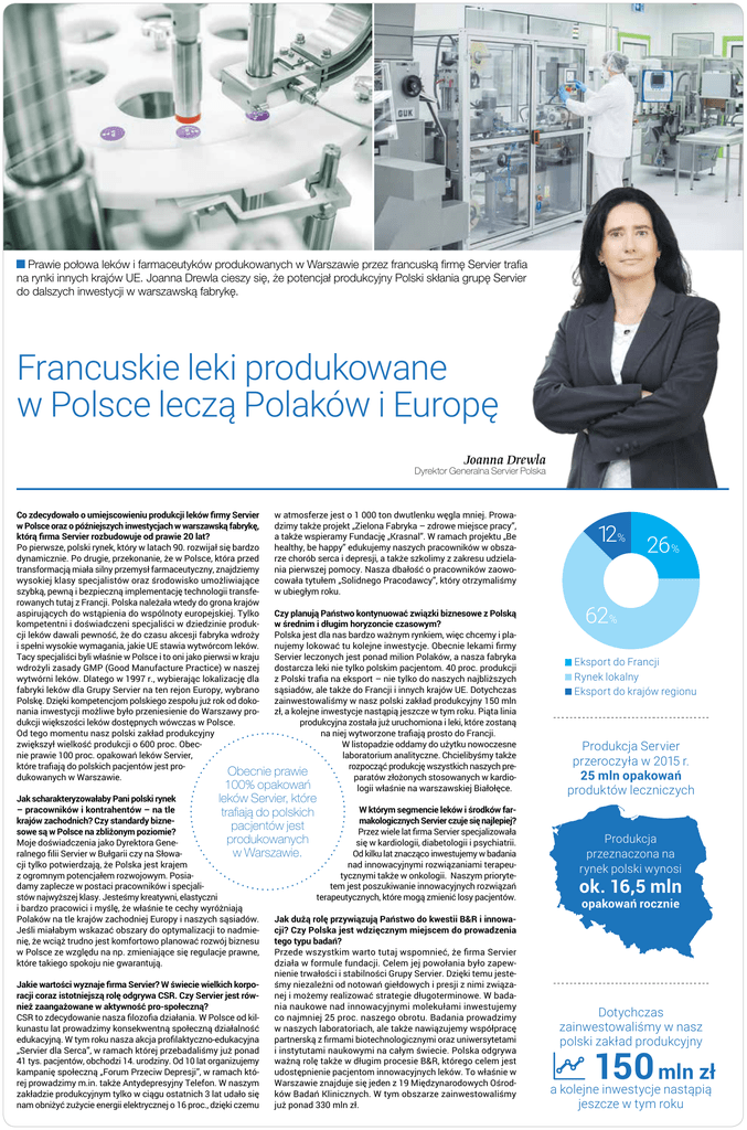 Prawie połowa leków i farmaceutyków produkowanych w Warszawie przez francuską firmę Servier trafia na rynki innych krajów UE. Joanna Drewla cieszy się, że potencjał produkcyjny Polski skłania grupę Servier do dalszych inwestycji w warszawską fabrykę. Francuskie leki produkowane w Polsce leczą Polaków i Europę Joanna Drewla Dyrektor Generalna Servier Polska Co zdecydowało o umiejscowieniu produkcji leków firmy Servier w Polsce oraz o późniejszych inwestycjach w warszawską fabrykę, którą firma Servier rozbudowuje od prawie 20 lat? Po pierwsze, polski rynek, który w latach 90. rozwijał się bardzo dynamicznie. Po drugie, przekonanie, że w Polsce, która przed transformacją miała silny przemysł farmaceutyczny, znajdziemy wysokiej klasy specjalistów oraz środowisko umożliwiające szybką, pewną i bezpieczną implementację technologii transferowanych tutaj z Francji. Polska należała wtedy do grona krajów aspirujących do wstąpienia do wspólnoty europejskiej. Tylko kompetentni i doświadczeni specjaliści w dziedzinie produkcji leków dawali pewność, że do czasu akcesji fabryka wdroży i spełni wysokie wymagania, jakie UE stawia wytwórcom leków. Tacy specjaliści byli właśnie w Polsce i to oni jako pierwsi w kraju wdrożyli zasady GMP (Good Manufacture Practice) w naszej wytwórni leków. Dlatego w 1997 r., wybierając lokalizację dla fabryki leków dla Grupy Servier na ten rejon Europy, wybrano Polskę. Dzięki kompetencjom polskiego zespołu już rok od dokonania inwestycji możliwe było przeniesienie do Warszawy produkcji większości leków dostępnych wówczas w Polsce. Od tego momentu nasz polski zakład produkcyjny zwiększył wielkość produkcji o 600 proc. Obecnie prawie 100 proc. opakowań leków Servier, które trafiają do polskich pacjentów jest proObecnie dukowanych w Warszawie. 100% w atmosferze jest o 1 000 ton dwutlenku węgla mniej. Prowadzimy także projekt „Zielona Fabryka – zdrowe miejsce pracy”, a także wspieramy Fundację „Krasnal”. W ramach projektu „Be healthy, be happy” edukujemy naszych pracowników w obszarze chorób serca i depresji, a także szkolimy z zakresu udzielania pierwszej pomocy. Nasza dbałość o pracowników zaowocowała tytułem „Solidnego Pracodawcy”, który otrzymaliśmy w ubiegłym roku. Czy planują Państwo kontynuować związki biznesowe z Polską w średnim i długim horyzoncie czasowym? Polska jest dla nas bardzo ważnym rynkiem, więc chcemy i planujemy lokować tu kolejne inwestycje. Obecnie lekami firmy Servier leczonych jest ponad milion Polaków, a nasza fabryka dostarcza leki nie tylko polskim pacjentom. 40 proc. produkcji z Polski trafia na eksport – nie tylko do naszych najbliższych sąsiadów, ale także do Francji i innych krajów UE. Dotychczas zainwestowaliśmy w nasz polski zakład produkcyjny 150 mln zł, a kolejne inwestycje nastąpią jeszcze w tym roku. Piąta linia produkcyjna została już uruchomiona i leki, które zostaną na niej wytworzone trafiają prosto do Francji. W listopadzie oddamy do użytku nowoczesne laboratorium analityczne. Chcielibyśmy także rozpocząć produkcję wszystkich naszych preprawie paratów złożonych stosowanych w kardioopakowań logii właśnie na warszawskiej Białołęce. Jak scharakteryzowałaby Pani polski rynek leków Servier, które – pracowników i kontrahentów – na tle W którym segmencie leków i środków fartrafiają do polskich krajów zachodnich? Czy standardy biznemakologicznych Servier czuje się najlepiej? pacjentów jest sowe są w Polsce na zbliżonym poziomie? Przez wiele lat firma Servier specjalizowała produkowanych Moje doświadczenia jako Dyrektora Genesię w kardiologii, diabetologii i psychiatrii. ralnego filii Servier w Bułgarii czy na SłowaOd kilku lat znacząco inwestujemy w badania w Warszawie. cji tylko potwierdzają, że Polska jest krajem nad innowacyjnymi rozwiązaniami terapeuz ogromnym potencjałem rozwojowym. Posiatycznymi także w onkologii. Naszym priorytedamy zaplecze w postaci pracowników i specjalitem jest poszukiwanie innowacyjnych rozwiązań stów najwyższej klasy. Jesteśmy kreatywni, elastyczni terapeutycznych, które mogą zmienić losy pacjentów. i bardzo pracowici i myślę, że właśnie te cechy wyróżniają Polaków na tle krajów zachodniej Europy i naszych sąsiadów. Jak dużą rolę przywiązują Państwo do kwestii B&R i innowaJeśli miałabym wskazać obszary do optymalizacji to nadmiecji? Czy Polska jest wdzięcznym miejscem do prowadzenia nię, że wciąż trudno jest komfortowo planować rozwój biznesu tego typu badań? w Polsce ze względu na np. zmieniające się regulacje prawne, Przede wszystkim warto tutaj wspomnieć, że firma Servier które takiego spokoju nie gwarantują. działa w formule fundacji. Celem jej powołania było zapewnienie trwałości i stabilności Grupy Servier. Dzięki temu jesteJakie wartości wyznaje firma Servier? W świecie wielkich korpośmy niezależni od notowań giełdowych i presji z nimi związaracji coraz istotniejszą rolę odgrywa CSR. Czy Servier jest równej i możemy realizować strategie długoterminowe. W badanież zaangażowane w aktywność pro-społeczną? nia naukowe nad innowacyjnymi molekułami inwestujemy CSR to zdecydowanie nasza filozofia działania. W Polsce od kilco najmniej 25 proc. naszego obrotu. Badania prowadzimy kunastu lat prowadzimy konsekwentną społeczną działalność w naszych laboratoriach, ale także nawiązujemy współpracę edukacyjną. W tym roku nasza akcja profilaktyczno-edukacyjna partnerską z firmami biotechnologicznymi oraz uniwersytetami „Servier dla Serca”, w ramach której przebadaliśmy już ponad i instytutami naukowymi na całym świecie. Polska odgrywa 41 tys. pacjentów, obchodzi 14. urodziny. Od 10 lat organizujemy ważną rolę także w długim procesie B&R, którego celem jest kampanię społeczną „Forum Przeciw Depresji”, w ramach któudostępnieni