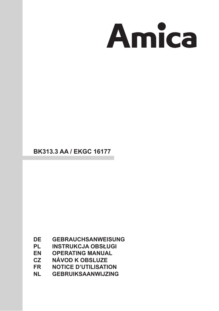 BK313.3 AA / EKGC 16177 DE PL EN CZ FR NL GEBRAUCHSANWEISUNG INSTRUKCJA OBSŁUGI OPERATING MANUAL NÁVOD K OBSLUZE NOTICE D’UTILISATION GEBRUIKSAANWIJZING INHALT SICHERHEITSHINWEISE INBETRIEBNAHME UND BETRIEBSBEDINGUNGEN DES GERÄTES BEDIENUNG UND FUNKTIONEN ENERGIESPARENDE NUTZUNG DES KÜHLSCHRANKS ABTAUEN, REINIGEN UND PFLEGEN LOKALISIERUNG VON STÖRUNGEN UMWELTSCHUTZ KLIMAKLASSE 8 8 10 12 13 14 15 16 SPIS TREŚCI WSKAZÓWKI DOTYCZĄCE BEZPIECZEŃSTWA UŻYTKOWANIA INSTALACJA I WARUNKI PRACY URZĄDZENIA OBSŁUGA I FUNKCJE JAK EKONOMICZNIE UŻYTKOWAĆ LODÓWKĘ ODSZRANIANIE, MYCIE I KONSERWACJA LOKALIZACJA USTEREK OCHRONA ŚRODOWISKA KLASA KLIMATYCZNA GWARANCJA, OBSŁUGA POSPRZEDAŻNA 17 17 19 21 22 23 24 25 25 TABLE OF CONTENTS GUIDELINES CONCERNING THE SAFETY OF USE INSTALLATION AND OPERATING CONDITIONS OF THE APPLIANCE OPERATION AND FUNCTIONS USING THE REFRIGERATOR EFFICIENTLY DEFROSTING, WASHING AND MAINTENANCE TROUBLE-SHOOTING ENVIRONMENTAL PROTECTION CLIMATE RANGE 26 26 28 30 31 32 33 34 OBSAH POKYNY TÝKAJÍCÍ SE BEZPEČNOSTI POUŽÍVÁNÍ INSTALACE A PROVOZNÍ PODMÍNKY SPOTŘEBIČE OBSLUHA A FUNKCE JAK EKONOMICKY POUŽÍVAT CHLADNIČKU ODMRAZOVÁNÍ, MYTÍ A ÚDRŽBA 40 URČOVÁNÍ ZÁVAD OCHRANA ŽIVOTNÍHO PROSTŘEDÍ KLIMATICKÁ TŘÍDA 35 35 37 39 41 42 43 TABLE DES MATIÈRES CONSIGNES DE SECURITÉ D’UTILISATION INSTALLATION ET CONDITIONS DE FONCTIONNEMENT DE L’APPAREIL SERVICE D’ENTRETIEN ET FONCTIONS COMMENT EXPLOITER LE REFRIGERATEUR DE FAÇON ECONOMIQUE ? DÉGIVRAGE, LAVAGE ET CONSERVATION LOCALISATION DES PANNES PROTECTION DE L’ENVIRONEMENT Classe climatique 44 44 46 48 49 50 51 52 INHOUD AANWIJZINGEN BETREFFENDE VEILIGHEID VAN GEBRUIK IINSTALLATIE EN WERKOMSTANDIGHEDEN VAN HET APPARAAT BEDIENING EN FUNCTIES HOE KAN DE KOELKAST ECONOMISCH GEBRUIKT WORDEN? ONTDOOIEN, WASSEN EN ONDERHOUD STORINGEN VINDEN EN VERHELPEN MILIEUBESCHERMING 53 53 55 57 58 59 60 DE Geehrte Kunden, das Kühl- und Gefriergerät steht für eine außergewöhnlich leichte Benutzung und ausgezeichnete Effektivität. Jedes Gerät wurde noch in der Fabrik auf Sicherheit und Funktionalität sorgfältig überprüft. Wir weisen Sie darauf hin, die Gebrauchsanweisung vor der Inbetriebnahme genau zu lesen. Achtung! Das Kühl- und Gefriergerät ist ausschließlich im Haushalt zu gebrauchen. Der Hersteller behält sich das Recht vor, bestimmte Änderungen, die den Betrieb des Gerätes nicht beeinflussen, vorzunehmen. Zulässig sind Ausstattungsänderungen sowie Veränderungen im Innen- und Außendesign, die sowohl die Funktionalität des Gerätes als auch seine Sicherheit nicht beeinträchtigen. PL Szanowni Państwo, Chłodziarko-zamrażarka Amica to połączenie wyjątkowej łatwości obsługi i doskonałej efektywności. Każde urządzenie przed opuszczeniem fabryki zostało dokładnie sprawdzone pod względem bezpieczeństwa i funkcjonalności. Prosimy Państwa o uważną lekturę instrukcji obsługi przed uruchomieniem urządzenia. Uwaga! Chłodziarko-zamrażarka przeznaczona jest wyłącznie do użytku domowego. Producent zastrzega sobie możliwość dokonywania zmian nie wpływających na działanie urządzenia. Dopuszczalne są zmiany w wyposażeniu, wystroju wewnętrznym i zewnętrznym wyrobu, nie wpływające na jego funkcjonalność i bezpieczeństwo. EN Dear Customer, This fridge-freezer combines exceptional user-friendliness and excellent efficiency. Prior to dispatch, each unit was carefully checked for its safety and operating capabilities. Before starting the appliance, please read this Operating Manual carefully Note! This fridge-freezer is intended for household use only. The manufacturer reserves the right to introduce modifications, which do not affect the operation of the appliance. CZ Vážení klienti, Chladnička s mrazničkou Amica je spojením výjimečně jednoduché obsluhy a dokonalé účinnosti. Každý spotřebič byl před expedicí z továrny důkladně zkontrolován s ohledem na bezpečnost a funkčnost. Prosíme Vás, abyste si důkladně přečetli návod k obsluze před uvedením spotřebiče do provozu. Upozornění! Chladnička s mrazničkou je určena výlučně pro domácí použití. Výrobce si vyhrazuje možnost provádění změn neovlivňujících fungování spotřebiče. Změny jsou přípustné ve vybavení, vnitřním a vnějším dizajnu, neovlivňující jeho funkčnost a bezpečnost. FR Mesdames et Messieurs, Le congélateur c’est une liason d’une exceptionnelle facilité d’utilisation et d’une efficacité parfaite. Avant de quitter l’usine, chaque appareil a été précisement contrôlé du point de vue de la securité et de la fonctionnalité. Il vous est demandé de bien vouloir lire attentivement la notice d’utilisation avant de la mise en marche de l’appareil. Attention! Le congélateur est destiné uniquement à l’usage domestique. Le fabricant se réserve le droit des procédér à des modification qui n’ont pas d’incidence sur le fonctionnement de l’appareil. Les modifications suivantes n’ayant pas d’incidences sur le fonctionnemment et la sécurité sont permises: de l’équipement, de la décoration intérieur et extérieur du produit. NL Geachte Klant, De vriezer biedt u een verbinding van makkelijke bediening en uitstekende efficiency. Elk apparaat, voordat het de fabriek uitgaat, wordt nauwkeurig gecontroleerd op het gebied van veiligheid en functionaliteit. Wij adviseren om deze handleiding aandachtig te lezen, voordat u het apparaat in gebruik neemt. Let Op! De vriezer is alleen voor thuisgebruik bestemd. Producent behoudt zich het recht voor op veranderingen die de functie van het apparaat niet beinvloeden. Wijzigingen in de uitrusting, binnen- en buiten inrichting van het product, die zijn werking en veiligheid niet aantasten, zijn toegelaten. 7 1 2 4 8 5 9 6 10 11 12 1 2 5 6 3 2 1 1 4 5 2 8 3 7 9 10 11 12 15 DE SICHERHEITSHINWEISE lDas aus dem Gefrierraum her- ausgenommene Gefriergut (Eis, Eiswürfel us