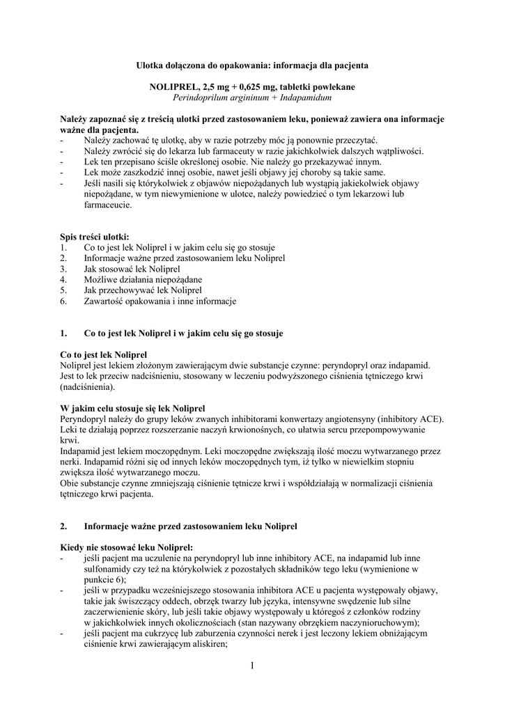 Ulotka dołączona do opakowania: informacja dla pacjenta NOLIPREL, 2,5 mg + 0,625 mg, tabletki powlekane Perindoprilum argininum + Indapamidum Należy zapoznać się z treścią ulotki przed zastosowaniem leku, ponieważ zawiera ona informacje ważne dla pacjenta. Należy zachować tę ulotkę, aby w razie potrzeby móc ją ponownie przeczytać. Należy zwrócić się do lekarza lub farmaceuty w razie jakichkolwiek dalszych wątpliwości. Lek ten przepisano ściśle określonej osobie. Nie należy go przekazywać innym. Lek może zaszkodzić innej osobie, nawet jeśli objawy jej choroby są takie same. Jeśli nasili się którykolwiek z objawów niepożądanych lub wystąpią jakiekolwiek objawy niepożądane, w tym niewymienione w ulotce, należy powiedzieć o tym lekarzowi lub farmaceucie. Spis treści ulotki: 1. Co to jest lek Noliprel i w jakim celu się go stosuje 2. Informacje ważne przed zastosowaniem leku Noliprel 3. Jak stosować lek Noliprel 4. Możliwe działania niepożądane 5. Jak przechowywać lek Noliprel 6. Zawartość opakowania i inne informacje 1. Co to jest lek Noliprel i w jakim celu się go stosuje Co to jest lek Noliprel Noliprel jest lekiem złożonym zawierającym dwie substancje czynne: peryndopryl oraz indapamid. Jest to lek przeciw nadciśnieniu, stosowany w leczeniu podwyższonego ciśnienia tętniczego krwi (nadciśnienia). W jakim celu stosuje się lek Noliprel Peryndopryl należy do grupy leków zwanych inhibitorami konwertazy angiotensyny (inhibitory ACE). Leki te działają poprzez rozszerzanie naczyń krwionośnych, co ułatwia sercu przepompowywanie krwi. Indapamid jest lekiem moczopędnym. Leki moczopędne zwiększają ilość moczu wytwarzanego przez nerki. Indapamid różni się od innych leków moczopędnych tym, iż tylko w niewielkim stopniu zwiększa ilość wytwarzanego moczu. Obie substancje czynne zmniejszają ciśnienie tętnicze krwi i współdziałają w normalizacji ciśnienia tętniczego krwi pacjenta. 2. Informacje ważne przed zastosowaniem leku Noliprel Kiedy nie stosować leku Noliprel: jeśli pacjent ma uczulenie na peryndopryl lub inne inhibitory ACE, na indapamid lub inne sulfonamidy czy też na którykolwiek z pozostałych składników tego leku (wymienione w punkcie 6); jeśli w przypadku wcześniejszego stosowania inhibitora ACE u pacjenta występowały objawy, takie jak świszczący oddech, obrzęk twarzy lub języka, intensywne swędzenie lub silne zaczerwienienie skóry, lub jeśli takie objawy występowały u któregoś z członków rodziny w jakichkolwiek innych okolicznościach (stan nazywany obrzękiem naczynioruchowym); jeśli pacjent ma cukrzycę lub zaburzenia czynności nerek i jest leczony lekiem obniżającym ciśnienie krwi zawierającym aliskiren; 1 - jeśli u pacjenta występuje ciężka choroba wątroby lub stan nazywany encefalopatią wątrobową (choroba uszkadzająca mózg); jeśli u pacjenta występuje ciężka choroba nerek lub pacjent jest poddawany dializie; jeśli u pacjenta występuje małe lub duże stężenie potasu we krwi; jeśli u pacjenta występują objawy niewyrównanej niewydolności serca (nasilone zatrzymanie wody w organizmie, trudności w oddychaniu); jeśli pacjentka jest w ciąży powyżej 3 miesięcy (lepiej także unikać stosowania leku Noliprel we wczesnej ciąży - patrz „Ciąża i karmienie piersią”); jeśli pacjentka karmi piersią. Ostrzeżenia i środki ostrożności Jeśli którakolwiek z wymienionych sytuacji dotyczy pacjenta, należy poinformować o tym lekarza przed zastosowaniem leku Noliprel: jeśli występuje stenoza zastawki aortalnej (zwężenie głównego naczynia krwionośnego odprowadzającego krew z serca) lub kardiomiopatia przerostowa (choroba mięśnia sercowego) czy też zwężenie tętnicy nerkowej (zwężenie naczynia krwionośnego dostarczającego krew do nerki); jeśli występują jakiekolwiek inne choroby serca lub nerek; jeśli występują choroby wątroby; jeśli występuje kolagenoza (choroba skóry), taka jak toczeń rumieniowaty układowy lub twardzina; jeśli występuje miażdżyca naczyń (stwardnienie naczyń krwionośnych); jeśli występuje nadczynność przytarczyc (zaburzenie czynności przytarczyc); jeśli występuje dna moczanowa; jeśli występuje cukrzyca; jeśli pacjent stosuje dietę ubogosolną lub zamienniki soli kuchennej zawierające potas; jeśli pacjent stosuje lit lub leki moczopędne oszczędzające potas (spironolakton, triamteren); leków tych powinno się unikać podczas stosowania leku Noliprel (patrz ,,Inne leki i Noliprel”); jeśli pacjent przyjmuje którykolwiek z poniższych leków, stosowanych w leczeniu wysokiego ciśnienia krwi: - antagonistę receptora angiotensyny II (ang. Angiotensin Receptor Blockers, ARB) (znane również jako sartany - na przykład walsartan, telmisartan, irbesartan), zwłaszcza jeśli pacjent ma zaburzenia czynności nerek związane z cukrzycą; - aliskiren. Lekarz prowadzący może monitorować czynność nerek, ciśnienie krwi oraz stężenie elektrolitów (np. potasu) we krwi w regularnych odstępach czasu. Patrz także informacje pod nagłówkiem „Kiedy nie stosować leku Noliprel”. Pacjentka musi powiedzieć lekarzowi, jeśli myśli, że jest (lub może być) w ciąży. Lek Noliprel nie jest zalecany we wczesnym okresie ciąży i nie wolno go zażywać, jeśli pacjentka jest w ciąży powyżej 3 miesięcy, ponieważ lek może powodować poważne uszkodzenia u dziecka, jeżeli był stosowany w tym stanie (patrz ,,Ciąża i karmienie piersią”). Stosując lek Noliprel należy poinformować lekarza lub personel medyczny: jeśli pacjent ma być poddany znieczuleniu i (lub) zabiegowi chirurgicznemu; jeśli w ostatnim czasie występowała biegunka lub wymioty, lub pacjent jest odwodniony; jeśli ma być przeprowadzona dializa lub zabieg aferezy LDL (usunięcie cholesterolu z krwi przy użyciu specjalnego urządzenia); jeśli ma być przeprowadzone leczenie odczulające w celu zmniej