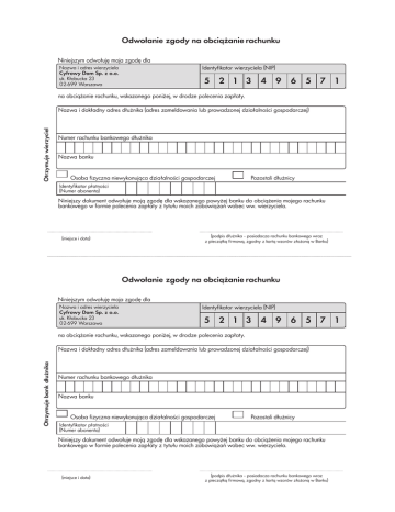 Odwołanie zgody na obciążanie rachunku Niniejszym odwołuję moja zgodę dla Identyfikator wierzyciela (NIP) Nazwa i adres wierzyciela Cyfrowy Dom Sp. z o.o. uk. Kłobucka 23 02-699 Warszawa 5 2 1 3 4 9 6 5 7 1 na obciążanie rachunku, wskazanego poniżej, w drodze polecenia zapłaty. Otrzymuje wierzyciel Nazwa i dokładny adres dłużnika (adres zameldowania lub prowadzonej działalności gospodarczej) Numer rachunku bankowego dłużnika Nazwa banku Osoba fizyczna niewykonująca działalności gospodarczej Pozostali dłużnicy Identyfikator płatności (Numer abonenta) Niniejszy dokument odwołuje moją zgodę dla wskazanego powyżej banku do obciążenia mojego rachunku bankowego w formie polecenia zapłaty z tytułu moich zobowiązań wobec ww. wierzyciela. (podpis dłużnika – posiadacza rachunku bankowego wraz z pieczątką firmową, zgodny z kartą wzorów złożoną w Banku) (miejsce i data) Odwołanie zgody na obciążanie rachunku Niniejszym odwołuję moja zgodę dla Nazwa i adres wierzyciela Cyfrowy Dom Sp. z o.o. uk. Kłobucka 23 02-699 Warszawa Identyfikator wierzyciela (NIP) 5 2 1 3 4 9 6 5 7 na obciążanie rachunku, wskazanego poniżej, w drodze polecenia zapłaty. Otrzymuje bank dłużnika Nazwa i dokładny adres dłużnika (adres zameldowania lub prowadzonej działalności gospodarczej) Numer rachunku bankowego dłużnika Nazwa banku Osoba fizyczna niewykonująca działalności gospodarczej Pozostali dłużnicy Identyfikator płatności (Numer abonenta) Niniejszy dokument odwołuje moją zgodę dla wskazanego powyżej banku do obciążenia mojego rachunku bankowego w formie polecenia zapłaty z tytułu moich zobowiązań wobec ww. wierzyciela. (miejsce i data) (podpis dłużnika – posiadacza rachunku bankowego wraz z pieczątką firmową, zgodny z kartą wzorów złożoną w Banku) 1 Odwołanie zgody na obciążanie rachunku Niniejszym odwołuję moja zgodę dla Identyfikator wierzyciela (NIP) Nazwa i adres wierzyciela ITI Neovision Sp. z o.o. ul. Kłobucka 23 02-699 Warszawa 5 2 1 0 0 8 2 7 7 4 na obciążanie rachunku, wskazanego poniżej, w drodze polecenia zapłaty. Otrzymuje wierzyciel Nazwa i dokładny adres dłużnika (adres zameldowania lub prowadzonej działalności gospodarczej) Numer rachunku bankowego dłużnika Nazwa banku Osoba fizyczna niewykonująca działalności gospodarczej Pozostali dłużnicy Identyfikator płatności (Numer abonenta) Niniejszy dokument odwołuje moją zgodę dla wskazanego powyżej banku do obciążenia mojego rachunku bankowego w formie polecenia zapłaty z tytułu moich zobowiązań wobec ww. wierzyciela. (podpis dłużnika – posiadacza rachunku bankowego wraz z pieczątką firmową, zgodny z kartą wzorów złożoną w Banku) (miejsce i data) Odwołanie zgody na obciążanie rachunku Niniejszym odwołuję moja zgodę dla Nazwa i adres wierzyciela ITI Neovision Sp. z o.o. ul. Kłobucka 23 02-699 Warszawa Identyfikator wierzyciela (NIP) 5 2 1 0 0 8 2 7 7 4 na obciążanie rachunku, wskazanego poniżej, w drodze polecenia zapłaty. Otrzymuje bank dłużnika Nazwa i dokładny adres dłużnika (adres zameldowania lub prowadzonej działalności gospodarczej) Numer rachunku bankowego dłużnika Nazwa banku Osoba fizyczna niewykonująca działalności gospodarczej Pozostali dłużnicy Identyfikator płatności (Numer abonenta) Niniejszy dokument odwołuje moją zgodę dla wskazanego powyżej banku do obciążenia mojego rachunku bankowego w formie polecenia zapłaty z tytułu moich zobowiązań wobec ww. wierzyciela. (miejsce i data) (podpis dłużnika – posiadacza rachunku bankowego wraz z pieczątką firmową, zgodny z kartą wzorów złożoną w Banku) Odwołanie zgody na obciążanie rachunku Niniejszym odwołuję moja zgodę dla Identyfikator wierzyciela (NIP) Nazwa i adres wierzyciela CANAL+ Cyfrowy S.A. Al. gen. Sikorskiego 9 02-758 Warszawa 5 2 6 2 2 4 6 2 7 1 na obciążanie rachunku, wskazanego poniżej, w drodze polecenia zapłaty. Otrzymuje wierzyciel Nazwa i dokładny adres dłużnika (adres zameldowania lub prowadzonej działalności gospodarczej) Numer rachunku bankowego dłużnika Nazwa banku Osoba fizyczna niewykonująca działalności gospodarczej Pozostali dłużnicy Identyfikator płatności (Numer abonenta) Niniejszy dokument odwołuje moją zgodę dla wskazanego powyżej banku do obciążenia mojego rachunku bankowego w formie polecenia zapłaty z tytułu moich zobowiązań wobec ww. wierzyciela. (podpis dłużnika – posiadacza rachunku bankowego wraz z pieczątką firmową, zgodny z kartą wzorów złożoną w Banku) (miejsce i data) Odwołanie zgody na obciążanie rachunku Niniejszym odwołuję moja zgodę dla Nazwa i adres wierzyciela CANAL+ Cyfrowy S.A. Al. gen. Sikorskiego 9 02-758 Warszawa Identyfikator wierzyciela (NIP) 5 2 6 2 2 4 6 2 7 na obciążanie rachunku, wskazanego poniżej, w drodze polecenia zapłaty. Otrzymuje bank dłużnika Nazwa i dokładny adres dłużnika (adres zameldowania lub prowadzonej działalności gospodarczej) Numer rachunku bankowego dłużnika Nazwa banku Osoba fizyczna niewykonująca działalności gospodarczej Pozostali dłużnicy Identyfikator płatności (Numer abonenta) Niniejszy dokument odwołuje moją zgodę dla wskazanego powyżej banku do obciążenia mojego rachunku bankowego w formie polecenia zapłaty z tytułu moich zobowiązań wobec ww. wierzyciela. (miejsce i data) (podpis dłużnika – posiadacza rachunku bankowego wraz z pieczątką firmową, zgodny z kartą wzorów złożoną w Banku) 1