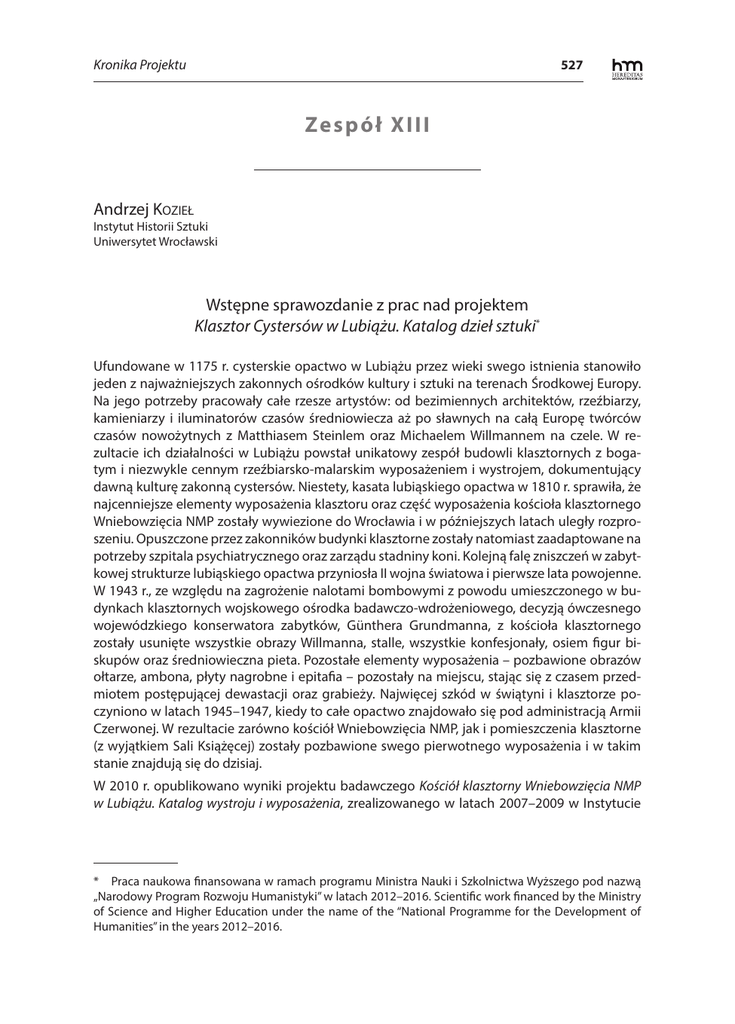 Kronika Projektu 527 Ze s p ó ł XIII Andrzej Kozieł Instytut Historii Sztuki Uniwersytet Wrocławski Wstępne sprawozdanie z prac nad projektem Klasztor Cystersów w Lubiążu. Katalog dzieł sztuki* Ufundowane w 1175 r. cysterskie opactwo w Lubiążu przez wieki swego istnienia stanowiło jeden z najważniejszych zakonnych ośrodków kultury i sztuki na terenach Środkowej Europy. Na jego potrzeby pracowały całe rzesze artystów: od bezimiennych architektów, rzeźbiarzy, kamieniarzy i iluminatorów czasów średniowiecza aż po sławnych na całą Europę twórców czasów nowożytnych z Matthiasem Steinlem oraz Michaelem Willmannem na czele. W rezultacie ich działalności w Lubiążu powstał unikatowy zespół budowli klasztornych z bogatym i niezwykle cennym rzeźbiarsko-malarskim wyposażeniem i wystrojem, dokumentujący dawną kulturę zakonną cystersów. Niestety, kasata lubiąskiego opactwa w 1810 r. sprawiła, że najcenniejsze elementy wyposażenia klasztoru oraz część wyposażenia kościoła klasztornego Wniebowzięcia NMP zostały wywiezione do Wrocławia i w późniejszych latach uległy rozproszeniu. Opuszczone przez zakonników budynki klasztorne zostały natomiast zaadaptowane na potrzeby szpitala psychiatrycznego oraz zarządu stadniny koni. Kolejną falę zniszczeń w zabytkowej strukturze lubiąskiego opactwa przyniosła II wojna światowa i pierwsze lata powojenne. W 1943 r., ze względu na zagrożenie nalotami bombowymi z powodu umieszczonego w budynkach klasztornych wojskowego ośrodka badawczo-wdrożeniowego, decyzją ówczesnego wojewódzkiego konserwatora zabytków, Günthera Grundmanna, z kościoła klasztornego zostały usunięte wszystkie obrazy Willmanna, stalle, wszystkie konfesjonały, osiem figur biskupów oraz średniowieczna pieta. Pozostałe elementy wyposażenia – pozbawione obrazów ołtarze, ambona, płyty nagrobne i epitafia – pozostały na miejscu, stając się z czasem przedmiotem postępującej dewastacji oraz grabieży. Najwięcej szkód w świątyni i klasztorze poczyniono w latach 1945–1947, kiedy to całe opactwo znajdowało się pod administracją Armii Czerwonej. W rezultacie zarówno kościół Wniebowzięcia NMP, jak i pomieszczenia klasztorne (z wyjątkiem Sali Książęcej) zostały pozbawione swego pierwotnego wyposażenia i w takim stanie znajdują się do dzisiaj. W 2010 r. opublikowano wyniki projektu badawczego Kościół klasztorny Wniebowzięcia NMP w Lubiążu. Katalog wystroju i wyposażenia, zrealizowanego w latach 2007–2009 w Instytucie * Praca naukowa finansowana w ramach programu Ministra Nauki i Szkolnictwa Wyższego pod nazwą „Narodowy Program Rozwoju Humanistyki” w latach 2012–2016. Scientific work financed by the Ministry of Science and Higher Education under the name of the “National Programme for the Development of Humanities” in the years 2012–2016. 528 Kronika Projektu Historii Sztuki Uniwersytetu Wrocławskiego1. Obecny projekt jest pomyślany jako kontynuacja poprzedniego zadania. Jego celem jest stworzenie kompletnego katalogu wszystkich zachowanych dzieł sztuki (architektury, rzeźby, malarstwa i sztuk użytkowych), które przed 1810 r. znajdowały się w lubiąskim klasztorze. Opracowanie to obejmie wszystkie zachowane budynki architektoniczne, rzeźby kamienne i drewniane, obrazy olejne na płótnie i desce, sprzęty użytkowe, a także elementy wystroju wnętrza, jak kamienna rzeźba architektoniczna oraz sklepienne malowidła freskowe. Będzie to pierwszy kompletny katalog wszystkich zachowanych dzieł sztuki z lubiąskiego klasztoru. Projekt jest realizowany przez zespół historyków sztuki w składzie: prof. dr hab. Jan Wrabec (emerytowany profesor Uniwersytetu Wrocławskiego), dr Artur Kolbiarz (Uniwersytet Szczeciński) oraz prof. Uniwersytetu Wrocławskiego, dr hab. Andrzej Kozieł (Uniwersytet Wrocławski, koordynator zespołu). Zgodnie z harmonogramem realizacji projektu prace badawcze rozpoczęły się w 2013 r. od kwerend terenowych w dawnym opactwie cystersów w Lubiążu oraz w kościołach i muzeach na terenie Polski, w których są lub mogą być przechowywane rozproszone dzieła sztuki z lubiąskiego klasztoru. Dotąd wykonane zostały częściowe kwerendy w dawnym klasztorze i Pałacu Opata w Lubiążu (malarstwo i rzeźba), w Muzeum Narodowym we Wrocławiu (malarstwo) oraz pełne kwerendy w kościołach znajdujących się w następujących miejscowościach, które przed 1810 r. należały do klasztoru cystersów w Lubiążu: Kwiatkowicach, Moczydlnicy Klasztornej, Sicinach, Smogorzowie Wielkim, Starej Górze i Tymowej. Rozpoczęto także przygotowywanie kompletnej dokumentacji fotograficznej dzieł sztuki znajdujących się w klasztorze. Profesjonalny fotograf Jerzy Buława przystąpił do wykonywania wysokiej jakości digitalnych fotografii zachowanego wystroju i wyposażenia Sali Książęcej z obrazami Christiana Philippa Bentuma, rzeźbami Franza Josepha Mangoldta oraz sztukateriami Albrechta Ignaza Provisorego. Reasumując, aktualny stan realizacji projektu Klasztor Cystersów w Lubiążu. Katalog dzieł sztuki – mimo zaledwie początkowego etapu prac – można ocenić jako dobry, planowy i dobrze rokujący na terminowe wykonanie całości opracowania do 2016 r. 1 A. Kozieł (red.), Kościół klasztorny Wniebowzięcia NMP w Lubiążu. Historia, stan zachowania, koncepcja rewitalizacji (Acta Universitatis Wratislaviensis, 3253, Historia Sztuki, 30), Wrocław 2010.