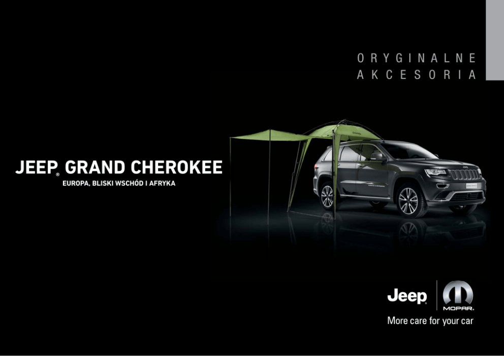 O R Y G I N A L N E A K C E S O R I A JEEP® GRAND CHEROKEE EUROPA, BLISKI WSCHÓD I AFRYKA DWUKOLOROWA FELGA ALUMINIOWA 20” Z kapslem piasty z logo Jeep. Do wszystkich modeli z wyjątkiem SRT. Nr kat. K82212221 FELGA ALUMINIOWA 20” Chromowana, kapsel piasty z logo Jeep. Do wszystkich modeli z wyjątkiem SRT. 2 Nr kat. K82212334 3 PERSONALIZACJA Twój Grand Cherokee jeszcze bardziej wyjątkowy. Teraz w przygotowanej przez markę Mopar kolekcji oryginalnych akcesoriów Jeep® znajdziesz szereg ciekawych rozwiązań dla swojego samochodu. Spraw, by Twój Grand Cherokee był, zgodnie z Twoim stylem, jeszcze bardziej charakterystyczny i doskonały. 10-RAMIENNA FELGA ALUMINIOWA 18” W kolorze jasnosrebrnym, z kapslem piasty z logo Jeep. Do wszystkich modeli z wyjątkiem SRT. Nr kat. K82212335 FELGA ALUMINIOWA OFF-ROAD 18” Z kapslem piasty z logo Jeep. Do wszystkich modeli z wyjątkiem SRT. Nr kat. K82212154 4 PERSONALIZACJA PERSONALIZACJA 10-RAMIENNA FELGA ALUMINIOWA 18” W kolorze ciemnoszarym metalicznym z logo Jeep i kapslem piasty w kolorze włókna węglowego. Do wszystkich modeli z wyjątkiem SRT. Nr kat. K82212286 10-RAMIENNA FELGA ALUMINIOWA 18” W kolorze czarnym matowym z wygrawerowanym logo Jeep i kapslem piasty w kolorze włókna węglowego. Do wszystkich modeli z wyjątkiem SRT. Nr kat. K82212377 5 CZARNA KOŃCÓWKA RURY WYDECHOWEJ Końcówka na prawą i lewą stronę samochodu, z logo Jeep. Do wszystkich modeli z wyjątkiem Summit i SRT. Nr kat. K82212760 CHROMOWANA KOŃCÓWKA RURY WYDECHOWEJ Tylko do wersji Laredo. Wyłącznie na rynki Bliskiego Wschodu i Afryki. Nr kat. K82212400AB 6 PERSONALIZACJA SPORTOWY DYFUZOR TYLNY Ze srebrną wstawką. Możliwość polakierowania. Do wszystkich modeli z wyjątkiem Summit i SRT. CHROMOWANA KOŃCÓWKA RURY WYDECHOWEJ Końcówka na prawą i lewą stronę samochodu, z logo Jeep. Do wszystkich modeli z wyjątkiem Summit i SRT. Nr kat. K82212680AB Nr kat. K82212694 PERSONALIZACJA LISTWA OZDOBNA POKRYWY BAGAŻNIKA WYKONANA ZE STALI NIERDZEWNEJ Nr kat. K82212292 CHROMOWANE OBUDOWY LUSTEREK Nr kat. K82212218 PRZYCIEMNIANE OWIEWKI SZYB PRZEDNICH Zestaw dwóch owiewek. Z logo Jeep. Nr kat. K82213118 PRZEDNIE ZACZEPY HOLOWNICZE 2 sztuki w zestawie. Wyłącznie na rynki Bliskiego Wschodu i Afryki. Nr kat. K82212095 7 LISTWA PROGOWA Ze stali nierdzewnej, z logo Grand Cherokee, na drzwi przednie. Zestaw 4 sztuk. Nr kat. K82212118 NAKŁADKA PROGOWA Ze stali nierdzewnej, z podświetlanym logo Jeep, na drzwi przednie. Zestaw 2 sztuk. Nr kat. K82212120 NAKŁADKI PEDAŁÓW Aluminiowe nakładki pedału przyspieszenia i hamulca. Nr kat. K82212055 8 PERSONALIZACJA PERSONALIZACJA CHROMOWANE ALUMINIOWE STOPNIE BOCZNE Do wszystkich modeli z wyjątkiem Summit i SRT. Nr kat. K82212129AC CZARNE ALUMINIOWE STOPNIE BOCZNE Do wszystkich modeli z wyjątkiem Summit i SRT. NAKLEJKA NA POKRYWĘ KOMORY SILNIKA W KOLORZE CZARNYM MATOWYM Z logo Jeep. Nr kat. K82212889 NAKLEJKA NA POKRYWĘ KOMORY SILNIKA W KOLORZE SREBRNYM MATOWYM Z logo Jeep. Nr kat. K82213201 Nr kat. K82212130AC 9 CZAS WOLNY Dzięki naszym rozwiązaniom Twój Jeep® Grand Cherokee jest gotowy, by zabrać Cię w dowolne miejsce. Wybierz spośród produktów Mopar te, które najlepiej pasują do Twoich potrzeb. 10 11 ROZKŁADANY BOX DACHOWY 500 L Innowacyjny design, kolor czarny błyszczący. Do zamontowania na belkach poprzecznych Mopar. Pojemność: 500 l. Nr kat. K82213714AB MIĘKKA TORBA TRANSPORTOWA Z czarnego nieprzemakalnego winylu, 4 paski mocujące. Wymagane belki poprzeczne, do których mocuje się pasy. Nr kat. KTCTAH867 UCHWYT NA NARTY I DESKI SNOWBOARDOWE Do przewozu maksymalnie 6 par nart lub 4 desek snowboardowych. Do zamontowania na belkach poprzecznych Mopar. Nr kat. KTC727DEL UCHWYT ROWEROWY Do zamontowania na belkach poprzecznych Mopar. Nr kat. KTC591PRO BAGAŻNIK NA 2 ROWERY MONTOWANY NA HAKU HOLOWNICZYM Możliwość zamontowania na wszystkich hakach holowniczych Mopar. Nr kat. KTH920EUR BAGAŻNIK NA 3 ROWERY MONTOWANY NA HAKU HOLOWNICZYM Możliwość zamontowania na wszystkich hakach holowniczych Mopar. Nr kat. KTH922EUR 12 CZAS WOLNY 13 DWUSTRONNA MATA BAGAŻNIKA Z zabezpieczeniem tylnego zderzaka. Nr kat. K82212233 SIATKA DO MOCOWANIA BAGAŻU Nr kat. K82213308 MATA BAGAŻNIKA W kolorze ciemnoszarym, z logo Jeep. MATA BAGAŻNIKA Z powierzchnią antypoślizgową i logo Jeep. Nr kat. K82212085 Nr kat. K82212688 NAMIOT SAMOCHODOWY Z LOGO JEEP Główna część namiotu może być przymocowana do tyłu samochodu z otwartą pokrywą bagażnika. Nr kat. K82213290 MARKIZA PRZECIWSŁONECZNA Z LOGO JEEP Mocowana do boku samochodu. Nr kat. K82213291 14 15 PRZYDATNE ROZWIĄZANIA Wszystkie akcesoria Mopar mają konkretną misję: sprawić, by Twój Jeep® Grand Cherokee był jeszcze bardziej wszechstronny, gotowy stawić czoła każdej przygodzie przy zachowaniu maksymalnych osiągów i stylu godnego marki Jeep®. Zobacz dział akcesoriów na naszej stronie internetowej: jeep.mopar.eu POBIERZ ZADZWOŃ Aplikację, dzięki której uzyskasz informacje, usługi oraz wsparcie. MORE CARE mój Zadbaj o swojego Jeepa na jeep.mopar.eu Mopar to marka odniesienia w zakresie usług, obsługi klienta oraz oryginalnych części zamiennych i akcesoriów do marek grupy Fiat Chrysler Automobiles. Informacje i zdjęcia zawarte w tym katalogu są jedynie orientacyjne. Producent zastrzega sobie prawo wprowadzenia zmian w każdej chwili i bez uprzedniego powiadomienia, jeżeli uważałby takie zmiany za konieczne z punktu widzenia konstrukcyjnego lub handlowego. Mopar Parts & Services L.go Senatore Agnelli, 5 - 10040 Volvera (TO) – Włochy. Wydrukowano dla Fiat Auto Poland 01/2015.