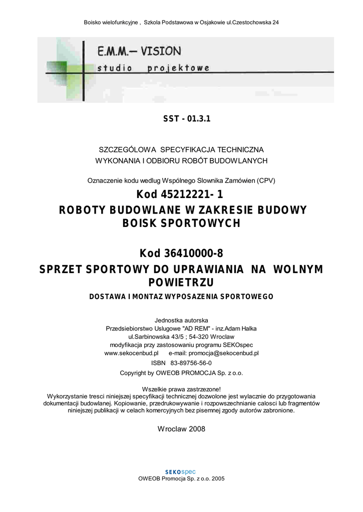 Boisko wielofunkcyjne , Szkola Podstawowa w Osjakowie ul.Czestochowska 24 SST - 01.3.1 SZCZEGÓLOWA SPECYFIKACJA TECHNICZNA WYKONANIA I ODBIORU ROBÓT BUDOWLANYCH Oznaczenie kodu wedlug Wspólnego Slownika Zamówien (CPV) Kod 45212221- 1 ROBOTY BUDOWLANE W ZAKRESIE BUDOWY BOISK SPORTOWYCH Kod 36410000-8 SPRZET SPORTOWY DO UPRAWIANIA NA WOLNYM POWIETRZU DOSTAWA I MONTAZ WYPOSAZENIA SPORTOWEGO Jednostka autorska Przedsiebiorstwo Uslugowe "AD REM" - inz.Adam Halka ul.Sarbinowska 43/5 ; 54-320 Wroclaw modyfikacja przy zastosowaniu programu SEKOspec www.sekocenbud.pl e-mail: [email protected] ISBN 83-89756-56-0 Copyright by OWEOB PROMOCJA Sp. z o.o. Wszelkie prawa zastrzezone! Wykorzystanie tresci niniejszej specyfikacji technicznej dozwolone jest wylacznie do przygotowania dokumentacji budowlanej. Kopiowanie, przedrukowywanie i rozpowszechnianie calosci lub fragmentów niniejszej publikacji w celach komercyjnych bez pisemnej zgody autorów zabronione. Wroclaw 2008 SEKOspec OWEOB Promocja Sp. z o.o. 2005 Boisko wielofunkcyjne , Szkola Podstawowa w Osjakowie ul.Czestochowska 24 SPIS TRESCI 1. WSTEP ......................................................................................................... 3 1.1. Przedmiot ST ............................................................................................. 3 1.2. Zakres stosowania ST ............................................................................... 3 1.3. Zakres robót objetych ST ........................................................................... 3 1.4. Okreslenia podstawowe ............................................................................. 3 1.5. Ogólne wymagania dotyczace robót ........................................................... 3 2. MATERIALY .................................................................................................. 4 3. SPRZET ........................................................................................................ 6 4. TRANSPORT ................................................................................................. 6 5. WYKONANIE ROBÓT ................................................................................... 6 6. KONTROLA JAKOSCI ROBÓT ...................................................................... 7 7. OBMIAR ROBÓT ........................................................................................... 7 8. ODBIÓR ROBÓT ........................................................................................... 7 9. PODSTAWA PLATNOSCI ............................................................................. 7 10. PRZEPISY ZWIAZANE ............................................................................... 8 Najwazniejsze oznaczenia i skróty: ST – Specyfikacja Techniczna SST – Szczególowa Specyfikacja Techniczna ITB – Instytut Techniki Budowlanej SEKOspec OWEOB Promocja Sp. z o.o. 2005 Boisko wielofunkcyjne , Szkola Podstawowa w Osjakowie ul.Czestochowska 24 1. W STEP 1.1. Przedm iot SST Przedmiotem niniejszej standardowej specyfikacji technicznej (SST) sa wymagania dotyczace wykonania i odbioru podbudowy i nawierzchni bioska ze "sztucznej trawy" oraz montazu wyposazenia sportowego w ramach przedsiewziecia inwestycyjnego pn.: Budowa boisk a wielofunkc yjnego ,na terenie Czes toc hows ka 24 dz. Nr 454/2 Szkoly Podstawowej w Osjakowie ul. - ( pilk a rec zna -1k pl , koszykówk a-2k pl , s iatkówka-1k pl) 1.2. Zak res s tosowania SST Specyfikacja techniczna (SST) stanowi dokument przetargowy i kontraktowy przy zlecaniu i realizacji robót wymienionych w pkt. 1.1. Odstepstwa od wymagan podanych w niniejszej specyfikacji moga miec miejsce tylko w przypadkach malych prostych robót i konstrukcji drugorzednych o niewielkim znaczeniu, dla których istnieje pewnosc, ze podstawowe wymagania beda spelnione przy zastosowaniu metod wykonania na podstawie doswiadczenia i przy przestrzeganiu zasad sztuki budowlanej. 1.3. Zak res robót objetyc h SST Zakres robót obejmuje budowe nawierzchni boiska wielofunkcyjnego ze sztucznej trawy do gry w pilke reczne , koszykówke i siatkówke . Ustalenia zawarte w niniejszej specyfikacji dotycza zasad prowadzenia robót zwiazanych z wykonywaniem podbudowy ,nawierzchni bioska oraz dostawy i montazu wyposazenia sportowego a wiec: ü warstw podbudowy i nawierzchni ze "sztucznej trawy", ü montazu obrzezy, ü dostawe i montaz wyposazenia sportowego ü oraz kontrola jakosci robót i materialów 1.4. Ok res lenia pods tawowe Okreslenia podane w niniejszej Specyfikacji sa zgodne z odpowiednimi normami oraz okresleniami podanymi w SST-00.00 Kod CPV 45000000-7 „Wymagania ogólne”. Kons trukc ja nawierzchni. Uklad warstw nawierzchni i podbudowy wraz ze sposobem ich polaczenia , tu: przeznaczony dla bois k sportowyc h Sztuc zna trawa : nawierzchnia sportowa z wlókien polipropylenowych przeznaczona dla uprawiania dyscyplin sportowych Sprzet sportowy do m ontazu na boisku - slupki , tablice, bramki , siatki , wieszaki antenki , tuleje do mocowania konstrukcji , konstrukcje mocujace Pozostale okreslenia podstawowe sa zgodne z obowiazujacymi, odpowiednimi polskimi normami i z definicjami podanymi w specyfikacji technicznej „Wymagania ogólne" punkt 1.4. 1.5. Ogólne wym agania dotyczac e robót Wykonawca robót jest odpowiedzialny za jakosc ich wykonania oraz za zgodnosc z dokumentacja projektowa, ST i poleceniami Inspektora nadzoru. Ogólne wymagania dotyczace robót podano w SST 00.00 Kod CPV 45000000-7. 2. MATERIALY SEKOspec OWEOB Promocja Sp. z o.o. 2005 Boisko wielofunkcyjne , Szkola Podstawowa w Osjakowie ul.Czestochowska 24 Ogólne wymagania dotyczace materialów, ich pozyskiwania i skladowania podano w SST -00.00 Kod CPV 45000000-7 „Wymagania ogólne” pkt 2. 2.1. Ogólne w ymagania dotyczace materialów i w yrobów Wykonawca jest zobowiazany do: ü dostarczenia materialów i wyrobów zgodnie z wymaganiami specyfikacji technicznych, ü stosowania materialów i wyrobów pro