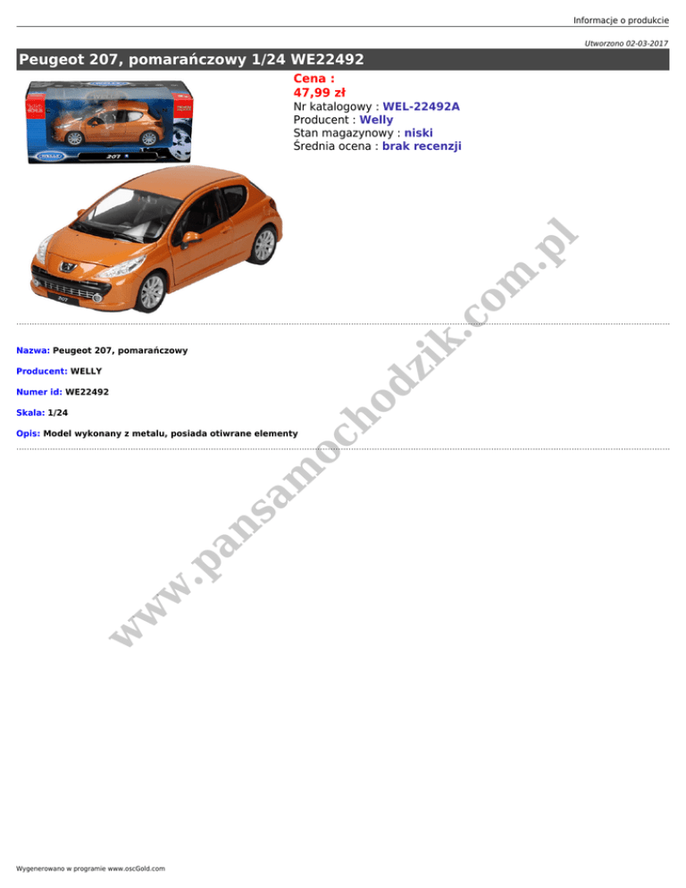 Informacje o produkcie Utworzono 02-03-2017 Peugeot 207, pomarańczowy 1/24 WE22492 Cena : 47,99 zł dz ik .c om .p l Nr katalogowy : WEL-22492A Producent : Welly Stan magazynowy : niski Średnia ocena : brak recenzji Nazwa: Peugeot 207, pomarańczowy Producent: WELLY Skala: 1/24 w w w .p an sa m oc Opis: Model wykonany z metalu, posiada otiwrane elementy ho Numer id: WE22492 Wygenerowano w programie www.oscGold.com