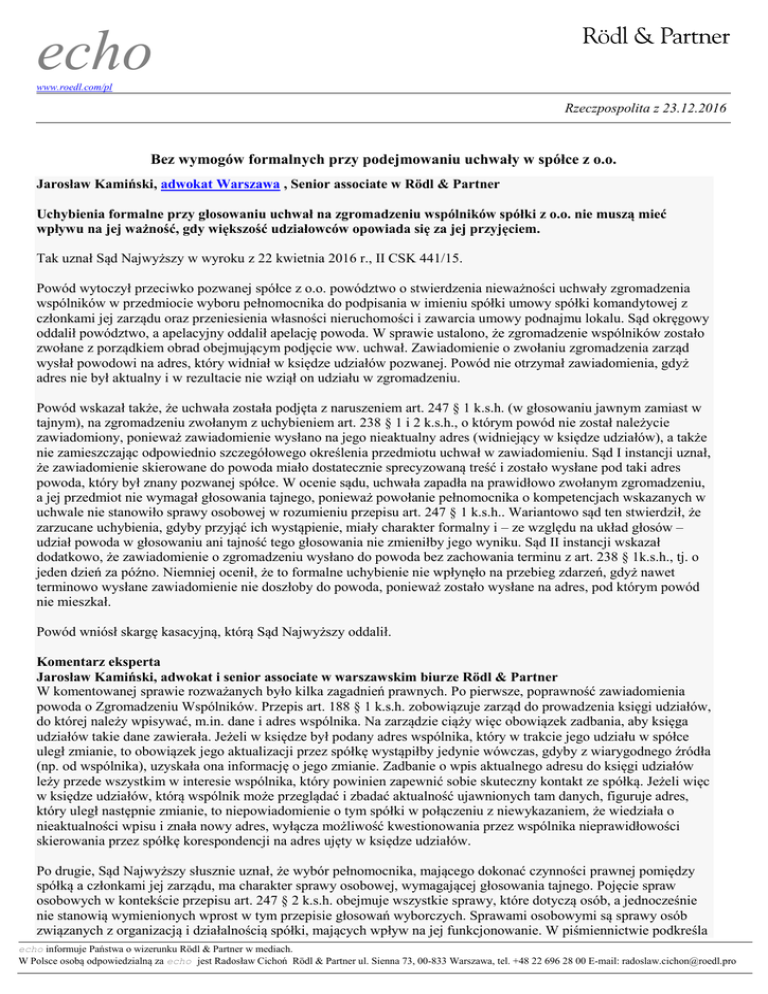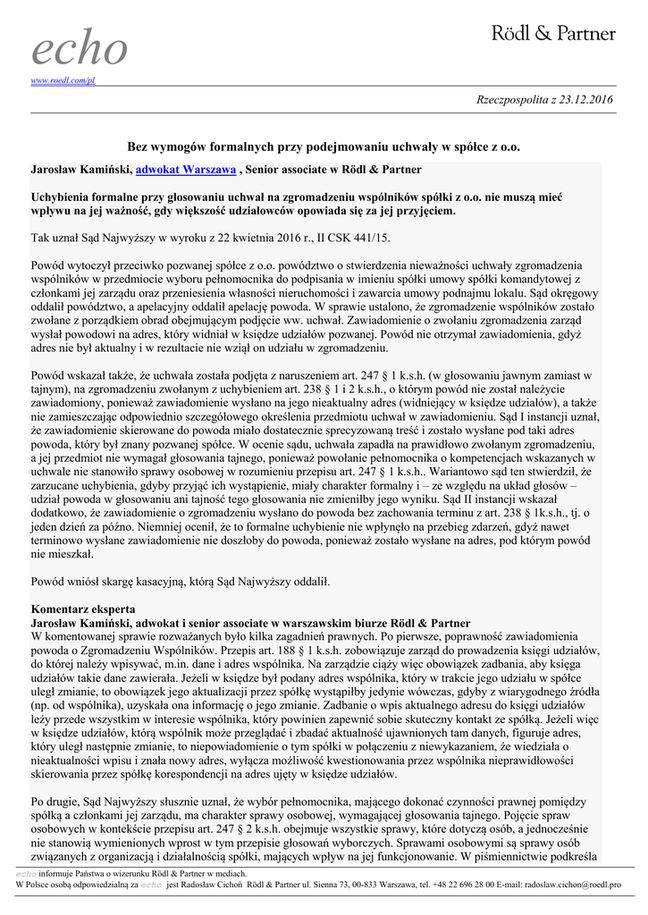 echo www.roedl.com/pl Rzeczpospolita z 23.12.2016 Bez wymogów formalnych przy podejmowaniu uchwały w spółce z o.o. Jarosław Kamiński, adwokat Warszawa , Senior associate w Rödl & Partner Uchybienia formalne przy głosowaniu uchwał na zgromadzeniu wspólników spółki z o.o. nie muszą mieć wpływu na jej ważność, gdy większość udziałowców opowiada się za jej przyjęciem. Tak uznał Sąd Najwyższy w wyroku z 22 kwietnia 2016 r., II CSK 441/15. Powód wytoczył przeciwko pozwanej spółce z o.o. powództwo o stwierdzenia nieważności uchwały zgromadzenia wspólników w przedmiocie wyboru pełnomocnika do podpisania w imieniu spółki umowy spółki komandytowej z członkami jej zarządu oraz przeniesienia własności nieruchomości i zawarcia umowy podnajmu lokalu. Sąd okręgowy oddalił powództwo, a apelacyjny oddalił apelację powoda. W sprawie ustalono, że zgromadzenie wspólników zostało zwołane z porządkiem obrad obejmującym podjęcie ww. uchwał. Zawiadomienie o zwołaniu zgromadzenia zarząd wysłał powodowi na adres, który widniał w księdze udziałów pozwanej. Powód nie otrzymał zawiadomienia, gdyż adres nie był aktualny i w rezultacie nie wziął on udziału w zgromadzeniu. Powód wskazał także, że uchwała została podjęta z naruszeniem art. 247 § 1 k.s.h. (w głosowaniu jawnym zamiast w tajnym), na zgromadzeniu zwołanym z uchybieniem art. 238 § 1 i 2 k.s.h., o którym powód nie został należycie zawiadomiony, ponieważ zawiadomienie wysłano na jego nieaktualny adres (widniejący w księdze udziałów), a także nie zamieszczając odpowiednio szczegółowego określenia przedmiotu uchwał w zawiadomieniu. Sąd I instancji uznał, że zawiadomienie skierowane do powoda miało dostatecznie sprecyzowaną treść i zostało wysłane pod taki adres powoda, który był znany pozwanej spółce. W ocenie sądu, uchwała zapadła na prawidłowo zwołanym zgromadzeniu, a jej przedmiot nie wymagał głosowania tajnego, ponieważ powołanie pełnomocnika o kompetencjach wskazanych w uchwale nie stanowiło sprawy osobowej w rozumieniu przepisu art. 247 § 1 k.s.h.. Wariantowo sąd ten stwierdził, że zarzucane uchybienia, gdyby przyjąć ich wystąpienie, miały charakter formalny i – ze względu na układ głosów – udział powoda w głosowaniu ani tajność tego głosowania nie zmieniłby jego wyniku. Sąd II instancji wskazał dodatkowo, że zawiadomienie o zgromadzeniu wysłano do powoda bez zachowania terminu z art. 238 § 1k.s.h., tj. o jeden dzień za późno. Niemniej ocenił, że to formalne uchybienie nie wpłynęło na przebieg zdarzeń, gdyż nawet terminowo wysłane zawiadomienie nie doszłoby do powoda, ponieważ zostało wysłane na adres, pod którym powód nie mieszkał. Powód wniósł skargę kasacyjną, którą Sąd Najwyższy oddalił. Komentarz eksperta Jarosław Kamiński, adwokat i senior associate w warszawskim biurze Rödl & Partner W komentowanej sprawie rozważanych było kilka zagadnień prawnych. Po pierwsze, poprawność zawiadomienia powoda o Zgromadzeniu Wspólników. Przepis art. 188 § 1 k.s.h. zobowiązuje zarząd do prowadzenia księgi udziałów, do której należy wpisywać, m.in. dane i adres wspólnika. Na zarządzie ciąży więc obowiązek zadbania, aby księga udziałów takie dane zawierała. Jeżeli w księdze był podany adres wspólnika, który w trakcie jego udziału w spółce uległ zmianie, to obowiązek jego aktualizacji przez spółkę wystąpiłby jedynie wówczas, gdyby z wiarygodnego źródła (np. od wspólnika), uzyskała ona informację o jego zmianie. Zadbanie o wpis aktualnego adresu do księgi udziałów leży przede wszystkim w interesie wspólnika, który powinien zapewnić sobie skuteczny kontakt ze spółką. Jeżeli więc w księdze udziałów, którą wspólnik może przeglądać i zbadać aktualność ujawnionych tam danych, figuruje adres, który uległ następnie zmianie, to niepowiadomienie o tym spółki w połączeniu z niewykazaniem, że wiedziała o nieaktualności wpisu i znała nowy adres, wyłącza możliwość kwestionowania przez wspólnika nieprawidłowości skierowania przez spółkę korespondencji na adres ujęty w księdze udziałów. Po drugie, Sąd Najwyższy słusznie uznał, że wybór pełnomocnika, mającego dokonać czynności prawnej pomiędzy spółką a członkami jej zarządu, ma charakter sprawy osobowej, wymagającej głosowania tajnego. Pojęcie spraw osobowych w kontekście przepisu art. 247 § 2 k.s.h. obejmuje wszystkie sprawy, które dotyczą osób, a jednocześnie nie stanowią wymienionych wprost w tym przepisie głosowań wyborczych. Sprawami osobowymi są sprawy osób związanych z organizacją i działalnością spółki, mających wpływ na jej funkcjonowanie. W piśmiennictwie podkreśla echo informuje Państwa o wizerunku Rödl & Partner w mediach. W Polsce osobą odpowiedzialną za echo jest Radosław Cichoń Rödl & Partner ul. Sienna 73, 00-833 Warszawa, tel. +48 22 696 28 00 E-mail: [email protected] się, że przedmiot konkretnej sprawy nie jest istotny, decyduje to, czy odnosi się ona do członków organów spółki, likwidatorów, wspólników. O osobowym charakterze sprawy decyduje więc związek funkcjonalny pomiędzy przedmiotem uchwały, a interesami osób mających wpływ na działanie lub funkcjonowanie spółki i jej organów. Tajność głosowania w tym wypadku gwarantować ma możliwość swobodnego wyrażenia poglądu w poddanej pod głosowanie sprawie. Uchwała w sprawie powołania pełnomocnika, który ma złożyć oświadczenie w sprawach majątkowych spółki, i to w zakresie stosunków pomiędzy tą spółką a członkami jej zarządu, jest sprawą osobową. Po trzecie, Sąd Najwyższy nie podzielił stanowiska powoda o naruszeniu przepisów art. 239 § 1 w zw. z art. 238 § 2 k.s.h., iż zawiadomienie powoda o zgromadzeniu zawierało nienależycie sformułowany porządek obrad. Szczegółowy porządek ob