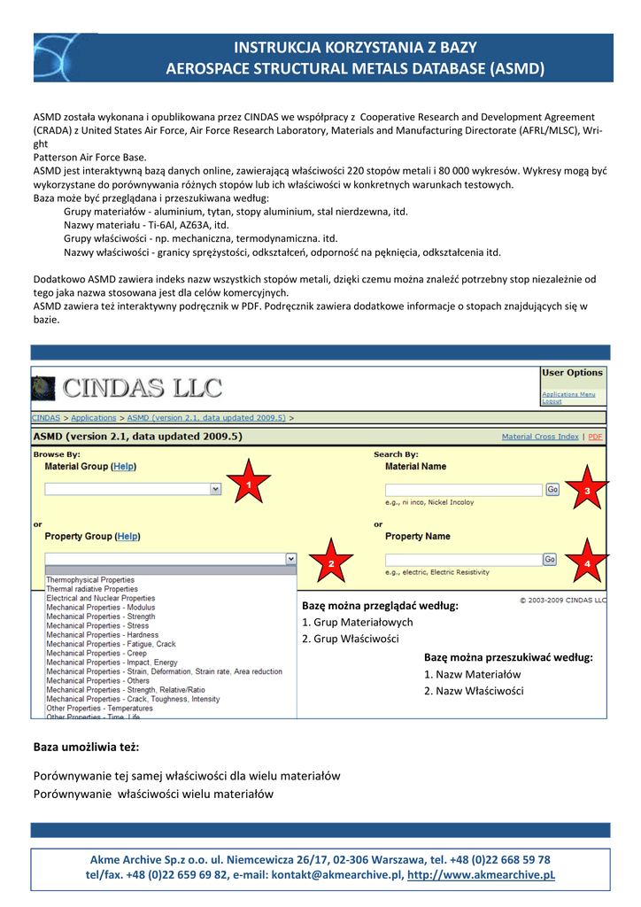INSTRUKCJA KORZYSTANIA Z BAZY AEROSPACE STRUCTURAL METALS DATABASE (ASMD) ASMD została wykonana i opublikowana przez CINDAS we współpracy z Cooperative Research and Development Agreement (CRADA) z United States Air Force, Air Force Research Laboratory, Materials and Manufacturing Directorate (AFRL/MLSC), Wright Patterson Air Force Base. ASMD jest interaktywną bazą danych online, zawierającą właściwości 220 stopów metali i 80 000 wykresów. Wykresy mogą być wykorzystane do porównywania różnych stopów lub ich właściwości w konkretnych warunkach testowych. Baza może być przeglądana i przeszukiwana według: Grupy materiałów - aluminium, tytan, stopy aluminium, stal nierdzewna, itd. Nazwy materiału - Ti-6Al, AZ63A, itd. Grupy właściwości - np. mechaniczna, termodynamiczna. itd. Nazwy właściwości - granicy sprężystości, odkształceń, odporność na pęknięcia, odkształcenia itd. Dodatkowo ASMD zawiera indeks nazw wszystkich stopów metali, dzięki czemu można znaleźć potrzebny stop niezależnie od tego jaka nazwa stosowana jest dla celów komercyjnych. ASMD zawiera też interaktywny podręcznik w PDF. Podręcznik zawiera dodatkowe informacje o stopach znajdujących się w bazie. 1 3 2 4 Bazę można przeglądać według: 1. Grup Materiałowych 2. Grup Właściwości Bazę można przeszukiwać według: 1. Nazw Materiałów 2. Nazw Właściwości Baza umożliwia też: Porównywanie tej samej właściwości dla wielu materiałów Porównywanie właściwości wielu materiałów Akme Archive Sp.z o.o. ul. Niemcewicza 26/17, 02-306 Warszawa, tel. +48 (0)22 668 59 78 tel/fax. +48 (0)22 659 69 82, e-mail: [email protected], http://www.akmearchive.pL INSTRUKCJA KORZYSTANIA Z BAZY AEROSPACE STRUCTURAL METALS DATABASE (ASMD) PRZEGLĄDANIE WEDŁUG GRUP MATERIAŁOWYCH 1 6 2 3 4 5 1. Rozwiń menu Material Group i wybierz na przykład Nickel Chromium Steels 2. Następnie rozwiń menu Select Material Name i zaznacz Nickel Chromium Steel HR-1 3. Rozwiń menu Select Property and Independent Variable i wybierz Tensile Strength, Ultimate (ksi) . Możesz teraz 4. Zobaczyć wykres (Show Graph) - Wyświetli się graficzny wykres danych dla największej wytrzymałości na rozciąganie stali niklowo-chromowej HR-1 5. Sprawdzić opis próbek, warunków, w jakich przeprowadzono test, materiały źródłowe ( Show Text ) 6. Przejść do dodatkowych informacji na temat danego materiału w podręczniku (View PDF for this material) Uwaga: Podczas dokonywania wyboru grupy, materiału i właściwości system automatycznie przeładowuje strony podając dalsze opcje. Jeżeli stopy podświetlone są na niebiesko, oznacza to, że są właśnie dodawane do bazy i informacje o nich nie są jeszcze dostępne. PRZEGLĄDANIE WEDŁUG WŁAŚCIWOŚCI 1 2 1. Rozwiń menu Select Property Group i wybierz na przykład Mechanical Properties - Stress 2. Następnie rozwiń menu Select Property Name i zaznacz Tensile Strength 3. Wyświetli się lista Independent Variable , z której możesz wybrać interesującą Cię zmienną 3 Możesz teraz 4. Zobaczyć wykres (Show Graph) - Wyświetli się lista materiałów dla których dostępne dane dotyczące różnych warunków testowych 5. Sprawdzić opis próbek, warunków, w jakich przeprowadzono test, materiały źródłowe ( Show Text ) Uwaga: Podczas dokonywania wyboru grupy, materiału i właściwości system automatycznie przeładowuje strony podając dalsze opcje. 4 5 Akme Archive Sp.z o.o. ul. Niemcewicza 26/17, 02-306 Warszawa, tel. +48 (0)22 668 59 78 tel/fax. +48 (0)22 659 69 82, e-mail: [email protected], http://www.akmearchive.pL INSTRUKCJA KORZYSTANIA Z BAZY AEROSPACE STRUCTURAL METALS DATABASE (ASMD) WYSZUKIWANIE MATERIAŁÓW 1 2 6 3 4 5 1. W polu Material Name wpisz nazwę potrzebnego Ci materiału, na przykład Steel i wybierz przycisk GO 2. Następnie rozwiń menu Select Material Name i zaznacz na przykład Stainless Steel Type 422 3. Rozwiń menu Select Property and Independent Variable i wybierz Crack Strength (ksi) z temperaturą jako zmienną niezależną. Możesz teraz 4. Zobaczyć wykres (Show Graph) - Wyświetli się graficzny wykres danych dla największej wytrzymałości na rozciąganie stali niklowo-chromowej HR-1 z temperaturą jako zmienną niezależną. 5. Sprawdzić opis próbek, warunków, w jakich przeprowadzono test, materiały źródłowe ( Show Text ) 6. Przejść do dodatkowych informacji na temat danego materiału w podręczniku (View PDF for this material) Uwaga: Podczas dokonywania wyboru grupy, materiału i właściwości system automatycznie przeładowuje strony podając dalsze opcje. Jeżeli stopy podświetlone są na niebiesko, oznacza to, że są właśnie dodawane do bazy i informacje o nich nie są jeszcze dostępne. WYSZUKIWANIE WŁAŚCIWOŚCI 1 2 1. Rozwiń menu Search By Property i wybierz na przykład hardness 2. Następnie rozwiń menu Select Property Name i zaznacz właściwość, na przykład Rockwell E Hardness 3. Wyświetli się lista Independent Variable , z której należywybrać interesującą Cię zmienną 3 Możesz teraz 4. Zobaczyć wykres (Show Graph) - Wyświetli się lista materiałów dla których dostępne dane dotyczące różnych warunków testowych 5. Sprawdzić opis próbek, warunków, w jakich przeprowadzono test, materiały źródłowe ( Show Text ) Uwaga: Podczas dokonywania wyboru grupy, materiału i właściwości system automatycznie przeładowuje strony podając dalsze opcje. 4 5 Akme Archive Sp.z o.o. ul. Niemcewicza 26/17, 02-306 Warszawa, tel. +48 (0)22 668 59 78 tel/fax. +48 (0)22 659 69 82, e-mail: [email protected], http://www.akmearchive.pL INSTRUKCJA KORZYSTANIA Z BAZY AEROSPACE STRUCTURAL METALS DATABASE (ASMD) PRACA Z WYKRESAMI 2 RODZAJE WYKRESÓW 1. Liniowy—gdy wykres przedstawia właściwość z danymi dla zmiennych niezależnych 2. Blokowy—gdy wykres przedstawia konkretną właściwość bez danych dla zmiennych niezależnych 1 1 6 2 1 4 3 5 1. Nazwa materiału—Nick