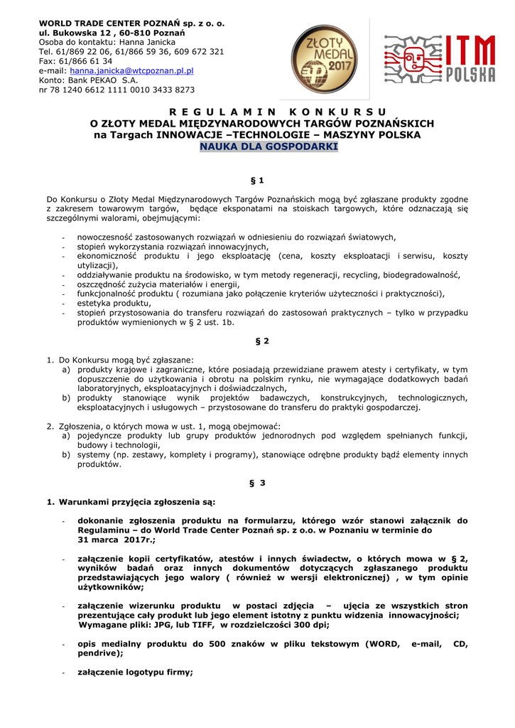 WORLD TRADE CENTER POZNAŃ sp. z o. o. ul. Bukowska 12 , 60-810 Poznań Osoba do kontaktu: Hanna Janicka Tel. 61/869 22 06, 61/866 59 36, 609 672 321 Fax: 61/866 61 34 e-mail: [email protected] Konto: Bank PEKAO S.A. nr 78 1240 6612 1111 0010 3433 8273 R E G U L A M I N K O N K U R S U O ZŁOTY MEDAL MIĘDZYNARODOWYCH TARGÓW POZNAŃSKICH na Targach INNOWACJE –TECHNOLOGIE – MASZYNY POLSKA NAUKA DLA GOSPODARKI §1 Do Konkursu o Złoty Medal Międzynarodowych Targów Poznańskich mogą być zgłaszane produkty zgodne z zakresem towarowym targów, będące eksponatami na stoiskach targowych, które odznaczają się szczególnymi walorami, obejmującymi: - nowoczesność zastosowanych rozwiązań w odniesieniu do rozwiązań światowych, stopień wykorzystania rozwiązań innowacyjnych, ekonomiczność produktu i jego eksploatację (cena, koszty eksploatacji i serwisu, koszty utylizacji), oddziaływanie produktu na środowisko, w tym metody regeneracji, recycling, biodegradowalność, oszczędność zużycia materiałów i energii, funkcjonalność produktu ( rozumiana jako połączenie kryteriów użyteczności i praktyczności), estetyka produktu, stopień przystosowania do transferu rozwiązań do zastosowań praktycznych – tylko w przypadku produktów wymienionych w § 2 ust. 1b. §2 1. Do Konkursu mogą być zgłaszane: a) produkty krajowe i zagraniczne, które posiadają przewidziane prawem atesty i certyfikaty, w tym dopuszczenie do użytkowania i obrotu na polskim rynku, nie wymagające dodatkowych badań laboratoryjnych, eksploatacyjnych i doświadczalnych, b) produkty stanowiące wynik projektów badawczych, konstrukcyjnych, technologicznych, eksploatacyjnych i usługowych – przystosowane do transferu do praktyki gospodarczej. 2. Zgłoszenia, o których mowa w ust. 1, mogą obejmować: a) pojedyncze produkty lub grupy produktów jednorodnych pod względem spełnianych funkcji, budowy i technologii, b) systemy (np. zestawy, komplety i programy), stanowiące odrębne produkty bądź elementy innych produktów. § 3 1. Warunkami przyjęcia zgłoszenia są: - dokonanie zgłoszenia produktu na formularzu, którego wzór stanowi załącznik do Regulaminu – do World Trade Center Poznań sp. z o.o. w Poznaniu w terminie do 31 marca 2017r.; - załączenie kopii certyfikatów, atestów i innych świadectw, o których mowa w § 2, wyników badań oraz innych dokumentów dotyczących zgłaszanego produktu przedstawiających jego walory ( również w wersji elektronicznej) , w tym opinie użytkowników; - załączenie wizerunku produktu w postaci zdjęcia – ujęcia ze wszystkich stron prezentujące cały produkt lub jego element istotny z punktu widzenia innowacyjności; Wymagane pliki: JPG, lub TIFF, w rozdzielczości 300 dpi; - opis medialny produktu do 500 znaków w pliku tekstowym (WORD, pendrive); - załączenie logotypu firmy; e-mail, CD, - dokonanie opłaty w momencie zgłoszenia ( wpisowe) w wysokości 400 PLN +23%VAT = 492 PLN i po pozytywnej ocenie ekspertów dokonanie pozostałej opłaty w wysokości 1500 PLN + 23% VAT= 1845 PLN .Całkowity koszt udziału w konkursie wynosi 1900 PLN netto +23% VAT =2337 PLN brutto za każdy zgłaszany do Konkursu produkt (system) na rachunek bankowy World Trade Center Poznań sp. z o.o. w Poznaniu i załączenie dowodu dokonanej wpłaty do zgłoszenia; 2. Zgłoszenie oraz uzasadnienie i dodatkowe materiały informacyjne o produkcie należy składać sformułowane w językach: polskim lub angielskim (wymagane jest podanie nazwy i opisu produktu w języku polskim). 3. Zgłoszenia i załączone materiały podlegają weryfikacji formalnej dokonywanej przez World Trade Center Poznań sp. z o.o. w Poznaniu. Materiały wymienione w ust. 1 nie podlegają zwrotowi. 4. Podanie nieprawdziwych lub niepełnych danych w Konkursie jest podstawą do odrzucenia zgłoszenia do Konkursu. §4 1. Ocenę produktów zgłoszonych do Konkursu przeprowadza, na podstawie kryteriów określonych w §1 oraz nadesłanych materiałów informacyjnych o produkcie Sąd Konkursowy, powołany przez Prezesa Zarządu Międzynarodowych Targów Poznańskich sp. z o.o. Członkowie Sądu Konkursowego są przedstawicielami nauki i praktyki, specjalistami dziedzin wiedzy właściwej branży targów. 2. Sąd Konkursowy przed rozpoczęciem targów dokonuje oceny zgłoszonych produktów na podstawie nadesłanej dokumentacji i w oparciu o wstępną ocenę produktu dokonaną przez Zespół Ekspertów Sądu konkursowego. 3. Sąd Konkursowy w oparciu o ustalone kryteria podejmuje decyzje o przyznaniu Złotego Medalu MTP w głosowaniu tajnym. Sąd Konkursowy może dokonać wyboru jednego produktu lub wydzielonej grupy, albo podgrupy produktów ze zgłoszonego systemu, zestawu, kompletu lub programu. 4. Członkowie Sądu Konkursowego nie mogą udostępniać materiałów i informacji związanych z przeprowadzanym Konkursem osobom trzecim. Obrady Sądu Konkursowego są niejawne, a jego decyzje są ostateczne. 5. Zgłoszony do Konkursu produkt nie będzie poddany ocenie przez Sąd Konkursowy, jeżeli zgłoszenie nie będzie zgodne z regulaminem Konkursu, w tym nie dokonano opłaty. Produkt nie zostanie nagrodzony, jeśli nie będzie prezentowany na stoisku targowym. §5 1. Każdy zgłoszony do Konkursu produkt może być wyróżniony Złotym Medalem Międzynarodowych Targów Poznańskich tylko jeden raz. 2. Ograniczenie, o którym mowa wyżej w ust. 1, nie dotyczy produktów, w których wprowadzono znaczące zmiany, noszące znamiona innowacyjności, pozwalające zakwalifikować produkt do nowej generacji. §6 1. Sąd Konkursowy ogłasza decyzję o przyznaniu Złotych Medali MTP przed rozpoczęciem targów, za pośrednictwem World Trade Center Poznań sp. z o.o. w Poznaniu oraz Międzynarodowych Targów Poznańskich sp. z o.o. w Poznaniu. 2. World Trade Center Poznań sp. z o.o. informuje zgłaszających produkty do Konkursu wystawców w dniu podjęcia decyzji o przyznaniu Złotego Medalu MTP.