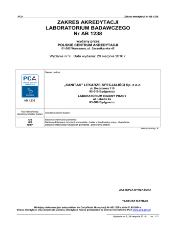 PCA Zakres akredytacji Nr AB 1238 ZAKRES AKREDYTACJI LABORATORIUM BADAWCZEGO Nr AB 1238 wydany przez POLSKIE CENTRUM AKREDYTACJI 01-382 Warszawa, ul. Szczotkarska 42 Wydanie nr 9 Data wydania: 29 sierpnia 2016 r. Nazwa i adres „SANITAS” LEKARZE SPECJALIŚCI Sp. z o.o. ul. Dworcowa 110 85-010 Bydgoszcz LABORATORIUM HIGIENY PRACY ul. Libelta 2a 85-080 Bydgoszcz AB 1238 Kod identyfikacji dziedziny/obiektu badań C/9 G/9 N/9/P Dziedzina/obiekt badań: Badania chemiczne powietrza Badania dotyczące inżynierii środowiska - hałas w środowisku pracy, oświetlenie Badania właściwości fizycznych powietrza i pobieranie próbek Wersja strony: A ZASTĘPCA DYREKTORA TADEUSZ MATRAS Niniejszy dokument jest załącznikiem do Certyfikatu Akredytacji Nr AB 1238 z dnia 01.09.2014 r. Status akredytacji oraz aktualność zakresu akredytacji można potwierdzić na stronie internetowej PCA www.pca.gov.pl Wydanie nr 9, 29 sierpnia 2016 r. str. 1/ 3 PCA Zakres akredytacji Nr AB 1238 Laboratorium Higieny Pracy ul. Libelta 2a, 85-080 Bydgoszcz Przedmiot badań/wyrób Środowisko pracy − powietrze Środowisko pracy − pyły Środowisko pracy − hałas Środowisko pracy − oświetlenie elektryczne we wnętrzach Rodzaj działalności /badane cechy/metoda Pobieranie próbek w celu oceny narażenia zawodowego na: - pyły przemysłowe − frakcja wdychalna − frakcja respirabilna - metale Metoda stacjonarna Wskaźnik narażenia (z obliczeń) Stężenie pyłu – frakcja wdychalna Zakres: (0,5 − 50) mg/m³ Metoda filtracyjno-wagowa Stężenie pyłu - frakcja respirabilna Zakres: (0,3 − 33) mg/m³ Metoda filtracyjno-wagowa Zawartość wolnej krystalicznej krzemionki Zakres: (1,3 − 100) % Metoda spektrofotometryczna Równoważny poziom dźwięku A Maksymalny poziom dźwięku A Zakres: (40 – 135 dB) Szczytowy poziom dźwięku C Zakres (40 – 138 dB) Metoda pomiarowa bezpośrednia Poziom ekspozycji na hałas odniesiony do 8 godzinnego dobowego wymiaru czasu pracy (z obliczeń) Natężenie oświetlenia Zakres: (5 − 5 000) lx Metoda pomiarowa bezpośrednia Równomierność oświetlenia (z obliczeń) Dokumenty odniesienia PN-Z-04008-07:2002+Az1:2004 PN-91/Z-04030/05 PN-91/Z-04030/06 PN-91/Z-04018/04 PN-N-01307:1994 PN-EN ISO 9612:2011 z wyłączeniem metody obejmującej Strategię 3 - p.11 PN-83/E-04040/03 Wersja strony: A Wydanie nr 9, 29 sierpnia 2016 r. str. 2/3 PCA Zakres akredytacji Nr AB 1238 Wykaz zmian Zakresu Akredytacji Nr AB 1238 Status zmian: wersja pierwotna A Zatwierdzam status zmian ZASTĘPCA DYREKTORA HOLOGRAM HOLOGRAM HOLOGRAM HOLOGRAM TADEUSZ MATRAS dnia: 29.08.2016 r. Wydanie nr 9, 29 sierpnia 2016 r. str. 3/3 PCA Zakres akredytacji Nr AB 1238 ZAKRES AKREDYTACJI LABORATORIUM BADAWCZEGO Nr AB 1238 wydany przez POLSKIE CENTRUM AKREDYTACJI 01-382 Warszawa, ul. Szczotkarska 42 Wydanie nr 9 Data wydania: 29 sierpnia 2016 r. Nazwa i adres „SANITAS” LEKARZE SPECJALIŚCI Sp. z o.o. ul. Dworcowa 110 85-010 Bydgoszcz LABORATORIUM HIGIENY PRACY ul. Libelta 2a 85-080 Bydgoszcz AB 1238 Kod identyfikacji dziedziny/obiektu badań C/9 G/9 N/9/P Dziedzina/obiekt badań: Badania chemiczne powietrza Badania dotyczące inżynierii środowiska - hałas w środowisku pracy, oświetlenie Badania właściwości fizycznych powietrza i pobieranie próbek Wersja strony: A ZASTĘPCA DYREKTORA TADEUSZ MATRAS Niniejszy dokument jest załącznikiem do Certyfikatu Akredytacji Nr AB 1238 z dnia 01.09.2014 r. Status akredytacji oraz aktualność zakresu akredytacji można potwierdzić na stronie internetowej PCA www.pca.gov.pl Wydanie nr 9, 29 sierpnia 2016 r. str. 1/ 3 PCA Zakres akredytacji Nr AB 1238 Laboratorium Higieny Pracy ul. Libelta 2a, 85-080 Bydgoszcz Przedmiot badań/wyrób Środowisko pracy − powietrze Środowisko pracy − pyły Środowisko pracy − hałas Środowisko pracy − oświetlenie elektryczne we wnętrzach Rodzaj działalności /badane cechy/metoda Pobieranie próbek w celu oceny narażenia zawodowego na: - pyły przemysłowe − frakcja wdychalna − frakcja respirabilna - metale Metoda stacjonarna Wskaźnik narażenia (z obliczeń) Stężenie pyłu – frakcja wdychalna Zakres: (0,5 − 50) mg/m³ Metoda filtracyjno-wagowa Stężenie pyłu - frakcja respirabilna Zakres: (0,3 − 33) mg/m³ Metoda filtracyjno-wagowa Zawartość wolnej krystalicznej krzemionki Zakres: (1,3 − 100) % Metoda spektrofotometryczna Równoważny poziom dźwięku A Maksymalny poziom dźwięku A Zakres: (40 – 135 dB) Szczytowy poziom dźwięku C Zakres (40 – 138 dB) Metoda pomiarowa bezpośrednia Poziom ekspozycji na hałas odniesiony do 8 godzinnego dobowego wymiaru czasu pracy (z obliczeń) Natężenie oświetlenia Zakres: (5 − 5 000) lx Metoda pomiarowa bezpośrednia Równomierność oświetlenia (z obliczeń) Dokumenty odniesienia PN-Z-04008-07:2002+Az1:2004 PN-91/Z-04030/05 PN-91/Z-04030/06 PN-91/Z-04018/04 PN-N-01307:1994 PN-EN ISO 9612:2011 z wyłączeniem metody obejmującej Strategię 3 - p.11 PN-83/E-04040/03 Wersja strony: A Wydanie nr 9, 29 sierpnia 2016 r. str. 2/3 PCA Zakres akredytacji Nr AB 1238 Wykaz zmian Zakresu Akredytacji Nr AB 1238 Status zmian: wersja pierwotna A Zatwierdzam status zmian ZASTĘPCA DYREKTORA HOLOGRAM HOLOGRAM HOLOGRAM HOLOGRAM TADEUSZ MATRAS dnia: 29.08.2016 r. Wydanie nr 9, 29 sierpnia 2016 r. str. 3/3