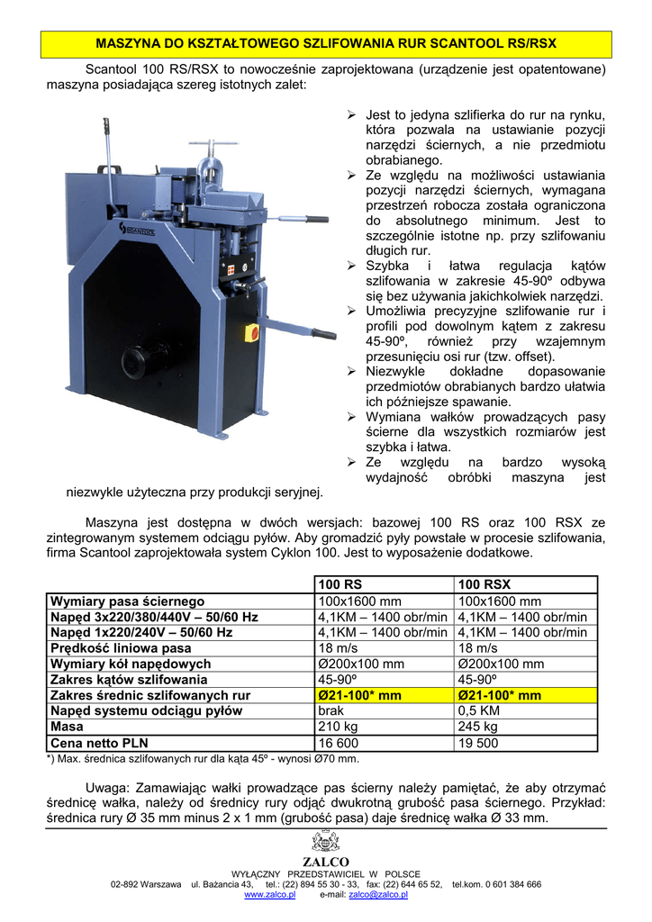 MASZYNA DO KSZTAŁTOWEGO SZLIFOWANIA RUR SCANTOOL RS/RSX Scantool 100 RS/RSX to nowocześnie zaprojektowana (urządzenie jest opatentowane) maszyna posiadająca szereg istotnych zalet: Jest to jedyna szlifierka do rur na rynku, która pozwala na ustawianie pozycji narzędzi ściernych, a nie przedmiotu obrabianego. Ze względu na moŜliwości ustawiania pozycji narzędzi ściernych, wymagana przestrzeń robocza została ograniczona do absolutnego minimum. Jest to szczególnie istotne np. przy szlifowaniu długich rur. Szybka i łatwa regulacja kątów szlifowania w zakresie 45-90º odbywa się bez uŜywania jakichkolwiek narzędzi. UmoŜliwia precyzyjne szlifowanie rur i profili pod dowolnym kątem z zakresu 45-90º, równieŜ przy wzajemnym przesunięciu osi rur (tzw. offset). Niezwykle dokładne dopasowanie przedmiotów obrabianych bardzo ułatwia ich późniejsze spawanie. Wymiana wałków prowadzących pasy ścierne dla wszystkich rozmiarów jest szybka i łatwa. Ze względu na bardzo wysoką obróbki maszyna jest wydajność niezwykle uŜyteczna przy produkcji seryjnej. Maszyna jest dostępna w dwóch wersjach: bazowej 100 RS oraz 100 RSX ze zintegrowanym systemem odciągu pyłów. Aby gromadzić pyły powstałe w procesie szlifowania, firma Scantool zaprojektowała system Cyklon 100. Jest to wyposaŜenie dodatkowe. Wymiary pasa ściernego Napęd 3x220/380/440V – 50/60 Hz Napęd 1x220/240V – 50/60 Hz Prędkość liniowa pasa Wymiary kół napędowych Zakres kątów szlifowania Zakres średnic szlifowanych rur Napęd systemu odciągu pyłów Masa Cena netto PLN 100 RS 100x1600 mm 4,1KM – 1400 obr/min 4,1KM – 1400 obr/min 18 m/s Ø200x100 mm 45-90º Ø21-100* mm brak 210 kg 16 600 100 RSX 100x1600 mm 4,1KM – 1400 obr/min 4,1KM – 1400 obr/min 18 m/s Ø200x100 mm 45-90º Ø21-100* mm 0,5 KM 245 kg 19 500 *) Max. średnica szlifowanych rur dla kąta 45º - wynosi Ø70 mm. Uwaga: Zamawiając wałki prowadzące pas ścierny naleŜy pamiętać, Ŝe aby otrzymać średnicę wałka, naleŜy od średnicy rury odjąć dwukrotną grubość pasa ściernego. Przykład: średnica rury Ø 35 mm minus 2 x 1 mm (grubość pasa) daje średnicę wałka Ø 33 mm. ZALCO 02-892 Warszawa WYŁĄCZNY PRZEDSTAWICIEL W POLSCE ul. BaŜancia 43, tel.: (22) 894 55 30 - 33, fax: (22) 644 65 52, www.zalco.pl e-mail: [email protected] tel.kom. 0 601 384 666 MASZYNA DO KSZTAŁTOWEGO SZLIFOWANIA RUR SCANTOOL RS/RSX Scantool 150 RS/RSX to nowocześnie zaprojektowana (urządzenie jest opatentowane) maszyna posiadająca szereg istotnych zalet: Jest to jedyna szlifierka do rur na rynku, która pozwala na ustawianie pozycji narzędzi ściernych, a nie przedmiotu obrabianego. Ze względu na moŜliwości ustawiania pozycji narzędzi ściernych, wymagana robocza została przestrzeń ograniczona do absolutnego minimum. Jest to szczególnie istotne np. przy szlifowaniu długich rur. Szybka i łatwa regulacja kątów szlifowania w zakresie 25-90º odbywa się bez uŜywania jakichkolwiek narzędzi. UmoŜliwia precyzyjne szlifowanie rur i profili pod dowolnym kątem z zakresu 25-90º, równieŜ przy wzajemnym przesunięciu osi rur (tzw. offset). Niezwykle dokładne dopasowanie przedmiotów obrabianych bardzo ułatwia ich późniejsze spawanie. Wymiana wałków prowadzących pasy ścierne dla wszystkich rozmiarów jest szybka i łatwa. Ze względu na bardzo wysoką wydajność obróbki maszyna jest niezwykle uŜyteczna przy produkcji seryjnej. Maszyna jest dostępna w dwóch wersjach: bazowej 150 RS oraz 150 RSX ze zintegrowanym systemem odciągu pyłów. Aby gromadzić pyły powstałe w procesie szlifowania, firma Scantool zaprojektowała system Cyklon 100. Jest to wyposaŜenie dodatkowe. Wymiary pasa ściernego Napęd 3x220/380/440V – 50/60 Hz Napęd 1x220/240V – 50/60 Hz Prędkość liniowa pasa Wymiary kół napędowych Zakres kątów szlifowania Zakres średnic szlifowanych rur Napęd systemu odciągu pyłów Masa 150 RS 150x1600 mm 4,1KM – 1400 obr/min 4,1KM – 1400 obr/min 18 m/s Ø200x150 mm 25-90º Ø21-150* mm brak 210 kg 150 RSX 150x1600 mm 4,1KM – 1400 obr/min 4,1KM – 1400 obr/min 18 m/s Ø200x150 mm 25-90º Ø21-150* mm 0,5 KM 235 kg *) Max. średnica szlifowanych rur dla kąta 45º wynosi Ø100 mm Uwaga: Zamawiając wałki prowadzące pas ścierny naleŜy pamiętać, Ŝe aby otrzymać średnicę wałka, naleŜy od średnicy rury odjąć dwukrotną grubość pasa ściernego. Przykład: średnica rury Ø 35 mm minus 2 x 1 mm (grubość pasa) daje średnicę wałka Ø 33 mm. Uwaga: Zaprezentowana na zdjęciu maszyna wyposaŜona jest w dostępny jako opcja odciąg pyłów wraz z filtrem Cyclon. ZALCO 02-892 Warszawa WYŁĄCZNY PRZEDSTAWICIEL W POLSCE ul. BaŜancia 43, tel.: (22) 894 55 30 - 33, fax: (22) 644 65 52, www.zalco.pl e-mail: [email protected] tel.kom. 0 601 384 666 MASZYNA DO KSZTAŁTOWEGO SZLIFOWANIA RUR SCANTOOL RS/RSX Typ 100 RS 100 RSX 150 RS 150 RSX Opis i informacje dodatkowe Cena netto PLN Pas 100x1600 mm, zakres kątów 45°-90°, do rur Ø21-70 m 16.600,00 Jak wyŜej + wbudowany standardowy system odciągu pyłów 20.600,00 Pas 150x1600 mm, zakres kątów 25º-90°, do rur Ø21-100 mm 19.700,00 Jak wyŜej + wbudowany standardowy system odciągu pyłów 23.800,00 Oferowane urządzenia objęte są roczną gwarancją. Silniki – 3 lata gwarancji. Wszystkie ceny są cenami netto w PLN, niezawieraną kosztów sprowadzenia ZALCO 02-892 Warszawa WYŁĄCZNY PRZEDSTAWICIEL W POLSCE ul. BaŜancia 43, tel.: (22) 894 55 30 - 33, fax: (22) 644 65 52, www.zalco.pl e-mail: [email protected] tel.kom. 0 601 384 666