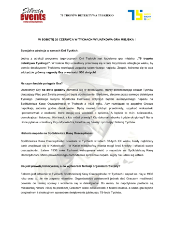 75 TROPÓW DETEKTYWA TYSKIEGO W SOBOTĘ 20 CZERWCA W TYCHACH WYJĄTKOWA GRA MIEJSKA ! Specjalna atrakcja w ramach Dni Tyskich. Jedną z atrakcji programu tegorocznych Dni Tyskich jest fabularna gra miejska „75 tropów detektywa Tyskiego”. W trakcie Gry uczestnicy przeniosą się w lata trzydzieste ubiegłego wieku, by pomóc detektywowi Tyskiemu rozwiązać zagadkę tajemniczego napadu. Zespół, któremu się to uda zdobędzie główną nagrodę Gry o wartości 500 złotych! Na czym będzie polegała Gra? Uczestnicy Gry na dwie godziny zamienią się w detektywów, którzy przemierzając obszar Tychów otaczający Plac pod Żyrafą prowadzić będą dochodzenie. Śledztwo, zlecone przez samego detektywa Tyskiego (dalekiego kuzyna Sherlocka Holmesa) dotyczyć będzie autentycznego napadu na Spółdzielczą Kasę Oszczędności w Tychach z 1936 roku. Aby rozwiązać tę zagadkę Gracze napotkają zadania godne detektywów. Będą musieli zdobyć przedmioty, uzyskać wskazówki i porozmawiać z osobami, które mogą coś wiedzieć o sprawie. A będzie to m.in. śpiewaczka, domokrążca i listonosz. Kto kręci, a kto mówi prawdę? Kto dokonał rabunku i gdzie ukryto łup? Na te i inne pytania uczestnicy Gry odpowiedzą świetnie się bawiąc i poznając historię Tychów. Historia napadu na Spółdzielczą Kasę Oszczędności Spółdzielcza Kasa Oszczędności powstała w Tychach w latach 30-tych XX wieku, kiedy najbliższy bank znajdował się w Katowicach. W Kasie mieszkańcy miasta mogli brać kredyty i składać swoje oszczędności. Latem 1936 roku Tychami wstrząsnęła wieść o napadzie na Spółdzielczą Kasę Oszczędności. Mimo prowadzonego dochodzenia sprawców napadu nigdy nie udało się ustalić. Co jest prawdą historyczną, a co wytworem fantazji organizatorów Gry? Faktem jest istnienie w Tychach Spółdzielczej Kasy Oszczędności w Tychach i napad na nią w 1936 roku oraz to, że nie złapano rabusiów. Organizatorzy postanowili jednak dać Graczom możliwość powrotu do tamtej sprawy i wcielenia się w detektywów. Bo mimo, że napotykane postacie są mieszanką historii i fikcji to przekażą Graczom wiele ciekawostek z historii miasta, a sama gra będzie oryginalnym i atrakcyjnym sposobem świętowania jubileuszu 75-lecia Tychów. 75 TROPÓW DETEKTYWA TYSKIEGO Jak wziąć udział w Grze? Udział w grze jest bezpłatny i wymaga rejestracji chętnych zespołów do Gry. Każdy zespół może się składać minimalnie z 2 a maksymalnie z 4 osób, w tym jedna z osób musi mieć ukończone 18 lat. Rejestracji dokonuje się osobiście w dniu gry, czyli 20 czerwca od godz. 12.00 do 14.30 (lub do wcześniejszego momentu wyczerpania limitu 200 uczestników) w hallu Urzędu Miasta Tychy (al. Niepodległości 49) Start Gry zaplanowany jest na godzinę 15.00, a na zakończenie Gry zespoły będą miały czas do 17.00. Gra nie wymaga żadnej wiedzy wyjściowej na temat historii Tychów. Uczestnicy wszystkie informacje będą zdobywać w trakcie zabawy, poznając tym samym mnóstwo ciekawostek z życia miasta. Podczas uroczystego finału Gry, który zaplanowano na godz. 17.30 na scenie Dni Tyskich (plac pod Żyrafą) oprócz wręczenia nagrody zwycięskiemu zespołowi rozlosowane zostaną również atrakcyjne nagrody dodatkowe. Zespoły, w których składzie będą dzieci mogą liczyć na specjalne niespodzianki detektywa Tyskiego dla swoich pociech. Organizatorzy: Urząd Miasta Tychy, Miejskie Centrum Kultury w Tychach Producent wykonawczy: Silesia Events – Eventy z pozytywną energią Osoba do kontaktu: Iwona Ciepał Tel. 603 55 00 23