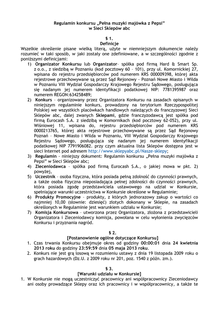 Regulamin konkursu „Pełna muzyki majówka z Pepsi” w Sieci Sklepów abc § 1. Definicje Wszelkie określenie pisane wielką literą, użyte w niemniejszym dokumencie należy rozumieć w taki sposób, w jaki zostały one zdefiniowane, a w szczególności zgodnie z poniższymi definicjami: 1) Organizator Konkursu lub Organizator– spółka pod firmą Hard & Smart Sp. z o.o., z siedzibą w Poznaniu (kod pocztowy 60 – 101), przy ul. Komornickiej 27, wpisana do rejestru przedsiębiorców pod numerem KRS 000009398, której akta rejestrowe przechowywane są przez Sąd Rejonowy - Poznań Nowe Miasto i Wilda w Poznaniu VIII Wydział Gospodarczy Krajowego Rejestru Sądowego, posługująca się nadanym jej numerem identyfikacji podatkowej NIP: 7781395987 oraz numerem REGON:634258489; 2) Konkurs – organizowany przez Organizatora Konkursu na zasadach opisanych w niniejszym regulaminie konkurs, prowadzony na terytorium Rzeczypospolitej Polskiej we wszystkich placówkach handlowych należących do franczyzowej Sieci Sklepów abc, dalej zwanych Sklepami, gdzie franczyzodawcą jest spółka pod firmą Eurocash S.A. z siedzibą w Komornikach (kod pocztowy 62-052), przy ul. Wiśniowej 11, wpisana do, rejestru przedsiębiorców pod numerem KRS 0000213765, której akta rejestrowe przechowywane są przez Sąd Rejonowy Poznań – Nowe Miasto i Wilda w Poznaniu, VIII Wydział Gospodarczy Krajowego Rejestru Sądowego, posługująca się nadanym jej numerem identyfikacji podatkowej NIP 7791906082. przy czym aktualna lista Sklepów dostępna jest w sieci Internet pod adresem http://www.sklepyabc.pl/Nasze-sklepy; 3) Regulamin - niniejszy dokument: Regulamin konkursu „Pełna muzyki majówka z Pepsi” w Sieci Sklepów abc; 4) Zleceniodawca – spółka pod firmą Eurocash S.A., o jakiej mowa w pkt. 2) powyżej, 5) Uczestnik – osoba fizyczna, która posiada pełną zdolność do czynności prawnych, a także osoba fizyczna nieposiadająca pełnej zdolności do czynności prawnych, która posiada zgodę przedstawiciela ustawowego na udział w Konkursie, spełniające warunki uczestnictwa w Konkursie określone w Regulaminie; 6) Produkty Promocyjne – produkty, z których jednorazowy zakup o wartości co najmniej 10,00 (słownie: dziesięć) złotych dokonany w Sklepie, na zasadach określonych w Regulaminie jest warunkiem udziału w Konkursie; 7) Komisja Konkursowa – utworzona przez Organizatora, złożona z przedstawicieli Organizatora i Zleceniodawcy komisja, powołana w celu wyłonienia zwycięzców Konkursu i przyznania nagród. § 2. [Postanowienie ogólne dotyczące Konkursu] 1. Czas trwania Konkursu obejmuje okres od godziny 00:00:01 dnia 24 kwietnia 2013 roku do godziny 23:59:59 dnia 05 maja 2013 roku. 2. Konkurs nie jest grą losową w rozumieniu ustawy z dnia 19 listopada 2009 roku o grach hazardowych (Dz.U. z 2009 roku nr 201, poz. 1540 z późn. zm.). § 3. [Warunki udziału w Konkursie] 1. W Konkursie nie mogą uczestniczyć pracownicy ani współpracownicy Zleceniodawcy ani osoby prowadzące Sklepy oraz ich pracownicy i w współpracownicy, a także te osoby, które są lub będą w czasie trwania Promocji w I (słownie: pierwszej) lub II (słownie: drugiej) grupie podatkowej w rozumieniu przepisów ustawy z dnia 28 lipca 1983 roku o podatku od spadków i darowizn (t.j. Dz. U. 2009 r., Nr 93, poz. 768, z późn. zm.) wobec współpracowników lub pracowników Zleceniodawcy lub Organizatora, osób prowadzących Sklepy lub ich pracowników lub współpracowników. 2. Warunkiem uczestnictwa w Konkursie, jest dokonanie przez Uczestnika w jednym ze Sklepów, w okresie od 24 kwietnia 2013 roku do 05 maja 2013 roku, potwierdzonego jednym paragonem fiskalnym lub fakturą VAT, zwanymi dalej łącznie i każdy z osobna Dowodem Zakupu, zakupu produktów wybranych spośród Produktów Promocyjnych wymienionych w postanowieniach § 4 ust. 1 Regulaminu za minimum 10,00 (słownie: dziesięć) złotych brutto , oraz wykonanie Zadania Konkursowego, na zasadach opisanych w postanowieniach § 4 Regulaminu. 3. Każdy Uczestnik może wziąć udział w Konkursie wielokrotnie, dokonując wielu zakupów Produktów Promocyjnych o łącznej wartości 10,00 (słownie: dziesięć) złotych brutto, przy czym każdy zakup musi zostać stwierdzony odrębnym Dowodem Zakupu, i wielokrotnie wykonując Zadanie Konkursowe, jednakże zgodnie z zasadą, że na jedno Zadanie Konkursowe winien przypadać jeden Dowód Zakupu. § 4. [Produkty Promocyjne, Zadanie Konkursowe] 1. Produktami Promocyjnymi są następujące produkty: Napój Pepsi cola 2,5L PET Napój Pepsi cola 0,33L PUSZKA Napój Pepsi Cola Gaz 1L PET Napój Pepsi Cola 0,5L PET Napój Pepsi Cola gaz 0,2L BUTELKA ZWROTNA Napój Mountain Dew gaz 0,33L PUSZKA Napój Mirinda Orange 0,33L PUSZKA Napój Mirinda Orange gaz 2,5L PET Napój Mirinda Orange gaz 1L PET Napój Pepsi Cola gaz 1,5L Napój Mirinda Orange gaz 1,5 PET Napój Pepsi Twist 0,33L PUSZKA Napój 7UP 0,33L PUSZKA Napój Ice Tea Lipton Green 0,33 L PUSZKA Napój Ice Tea Lipton Lemon 0,33 L PUSZKA Napój Ice Tea Lipton Brzosk. 0,33 L PUSZKA Napój Slice Cytryna gaz 0,5L PET Napój Lipton Green Tea 0,5L Napój Lipton Green Tea 1,5L Napój Mirina Orange 0,5L PET Napój Montain Dew 1L PET Napój Lipton Ice Tea Cytrynowy 0,5L PET Napój 7UP gaz. 1L PET Napój Mountain Dew gaz 0,5L PET Napój 7UP 0,5L PET Napój Slice Pomarańcza gaz 0,5L PET Napój Lipton Ice Tea Brzoskw. 0,5L PET Napój Mountain Dew gaz 1,5L PET Napój 7UP gaz 2,5L PET Napój Mirinda Lemon 0,5L PET Napój Mirinda Lemon 1,0L PET Napój Napój Napój Napój Napój Napój Napój Napój Napój Napój Napój Napój Napój Napój Napój Napój Napój Napój Napój Napój Napój Napój Napój Napój Napój 2. 3. 4. 5. 6. Lipton Ice Tea Cytrynowy 1,5L PET Lipton Green Tea Lemon 0,5L PET Mirinda Lemon 1,5L PET 7UP gaz 1,5L PET Pepsi Twist gaz 1L Pepsi Light 0,33L PUSZKA Lipton Green Lemon 1,5L Energet. Adrenaline MD 0,25L PUSZKA Lipton Rasberry 0,5L PET 