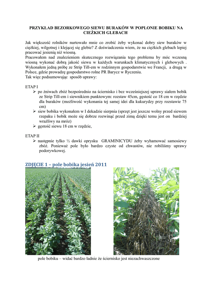 PRZYKŁAD BEZORKOWEGO SIEWU BURAKÓW W POPLONIE BOBIKU NA CIEŻKICH GLEBACH Jak większość rolników nurtowało mnie co zrobić żeby wykonać dobry siew buraków w ciężkiej, wilgotnej i klejącej się glebie? Z doświadczenia wiem, że na ciężkich glebach lepiej pracować jesienią niż wiosną. Pracowałem nad znalezieniem skutecznego rozwiązania tego problemu by móc wczesną wiosną wykonać dobrą jakość siewu w każdych warunkach klimatycznych i glebowych . Wykonałem jedną próbę ze Strip Till-em w rodzinnym gospodarstwie we Francji, a drugą w Polsce, gdzie prowadzę gospodarstwo rolne PR Barycz w Ryczeniu. Tak więc podsumowując sposób uprawy: ETAP I po żniwach zbóż bezpośrednio na ściernisko i bez wcześniejszej uprawy siałem bobik ze Strip Till-em i siewnikiem punktowym: rozstaw 45cm, gęstość co 18 cm w rzędzie dla buraków (możliwość wykonania tej samej idei dla kukurydzy przy rozstawie 75 cm) siew bobika wykonałem w I dekadzie sierpnia (sprzęt jest jeszcze wolny przed siewem rzepaku i bobik może się dobrze rozwinąć przed zimą dzięki temu jest on bardziej wrażliwy na mróz) gęstość siewu 18 cm w rzędzie, ETAP II następnie tylko ½ dawki oprysku GRAMINICYDU żeby wyhamować samosiewy zbóż. Ponieważ pole było bardzo czyste od chwastów, nie robiliśmy uprawy podorywkowej. ZDJĘCIE 1 – pole bobika jesień 2011 pole bobiku – widać bardzo ładnie że ściernisko jest niezachwaszczone Korzeń palowy bobiku + brodawy „N”. Siew buraków dokładnie w rzędach bobiku ZDJĘCIE 2 Pole bobiku po zimie, początek marca 2012 ZDJĘCIE 3 Na wiosnę przejazd Strip Till-em zmodyfikowanym: talerze falowane zamiast słupic. Talerze falowane zamiast słupic Praca tylko w rzędach na głębokości 3 cm Docelowo użyłem Strip till-a zmodyfikowanego po to żeby usunąć pozostałości w rzędzie i ruszyć glebę na głębokości 3-4 cm aby: zniszczyć łodygi bobika ogrzać ziemię przed siewem, aktywować mineralizację azotu przygotować strukturę ziemi do wykonania siewu, ponieważ na ciężkich glebach problemem jest żeby zamknąć rząd po siewie (dobrze przykryć ziarno) Wybrałem bobik jako poplon ponieważ : ma system korzeniowy palowy (zaletą tej rośliny jest dobrze i głęboko utrzymać profil glebowy za Strip Till-em) jest rośliną motylkową (dostarcza azot pod rzędy buraków) jest rośliną stojącą, więc łatwo trafić wiosną w rzędy żeby siać buraki Przejazd Strip Till-a zmodyfikowanego z talerzami falowanymi wykonałem z wysoką prędkością 12-15 km/h (prędkość jest ważna w celu wykonania dobrej jakości pracy). Moc ciągnika 90 KM dla 6 rzędów. Siew powinien być wykonany od kilku godzin do kilku dni po uprawie Strip Till-em w zależności od warunków klimatycznych (kiedy ziemia się lekko osuszy). Po zimie badania pokazały, że po bobiku zapotrzebowanie azotu dla buraków jest na poziomie 30 kg czystego azotu. Następnie siew buraków, przejazd samego siewnika punktowego w rzędach bobiku. ZDJĘCIE 4 Czekamy na pierwsze wschody buraków… .