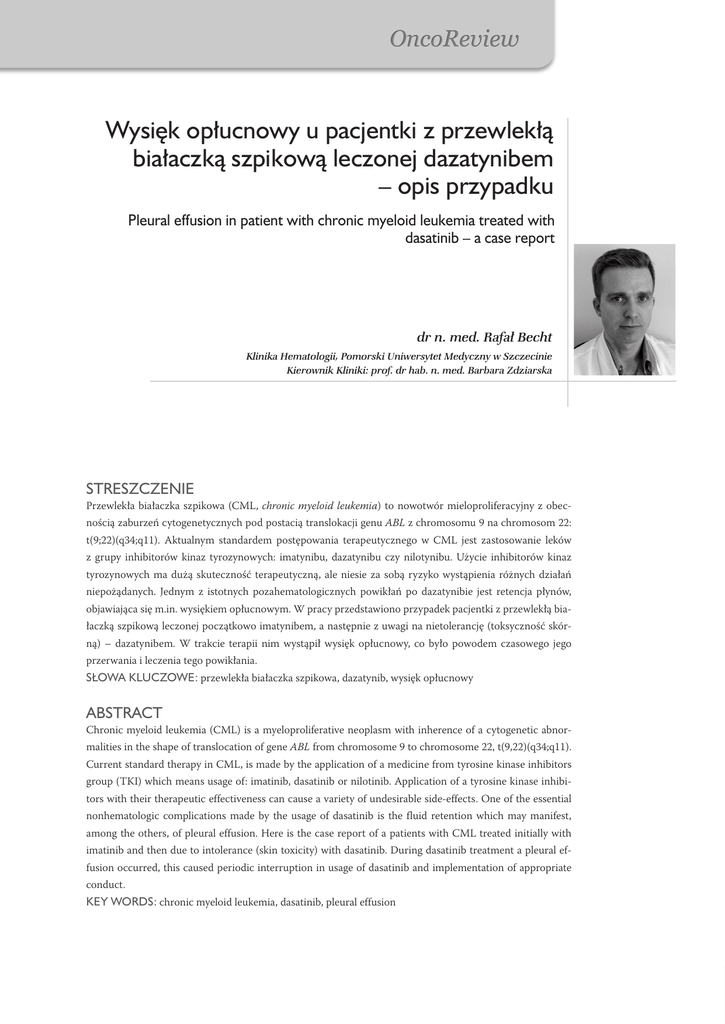 Wysięk opłucnowy u pacjentki z przewlekłą białaczką szpikową leczonej dazatynibem – opis przypadku Pleural effusion in patient with chronic myeloid leukemia treated with dasatinib – a case report dr n. med. Rafał Becht Klinika Hematologii, Pomorski Uniwersytet Medyczny w Szczecinie Kierownik Kliniki: prof. dr hab. n. med. Barbara Zdziarska Streszczenie Przewlekła białaczka szpikowa (CML, chronic myeloid leukemia) to nowotwór mieloproliferacyjny z obecnością zaburzeń cytogenetycznych pod postacią translokacji genu ABL z chromosomu 9 na chromosom 22: t(9;22)(q34;q11). Aktualnym standardem postępowania terapeutycznego w CML jest zastosowanie leków z grupy inhibitorów kinaz tyrozynowych: imatynibu, dazatynibu czy nilotynibu. Użycie inhibitorów kinaz tyrozynowych ma dużą skuteczność terapeutyczną, ale niesie za sobą ryzyko wystąpienia różnych działań niepożądanych. Jednym z istotnych pozahematologicznych powikłań po dazatynibie jest retencja płynów, objawiająca się m.in. wysiękiem opłucnowym. W pracy przedstawiono przypadek pacjentki z przewlekłą białaczką szpikową leczonej początkowo imatynibem, a następnie z uwagi na nietolerancję (toksyczność skórną) – dazatynibem. W trakcie terapii nim wystąpił wysięk opłucnowy, co było powodem czasowego jego przerwania i leczenia tego powikłania. Słowa kluczowe: przewlekła białaczka szpikowa, dazatynib, wysięk opłucnowy Abstract Chronic myeloid leukemia (CML) is a myeloproliferative neoplasm with inherence of a cytogenetic abnormalities in the shape of translocation of gene ABL from chromosome 9 to chromosome 22, t(9,22)(q34;q11). Current standard therapy in CML, is made by the application of a medicine from tyrosine kinase inhibitors group (TKI) which means usage of: imatinib, dasatinib or nilotinib. Application of a tyrosine kinase inhibitors with their therapeutic effectiveness can cause a variety of undesirable side-effects. One of the essential nonhematologic complications made by the usage of dasatinib is the fluid retention which may manifest, among the others, of pleural effusion. Here is the case report of a patients with CML treated initially with imatinib and then due to intolerance (skin toxicity) with dasatinib. During dasatinib treatment a pleural effusion occurred, this caused periodic interruption in usage of dasatinib and implementation of appropriate conduct. Key words: chronic myeloid leukemia, dasatinib, pleural effusion Wysięk opłucnowy u pacjentki z przewlekłą białaczką szpikową leczonej dazatynibem – opis przypadku R. Becht Wstęp czenia objawy toksyczności dotyczą układu krwiotwórczego, Przewlekła białaczka szpikowa (CML, chronic myeloid leu- są to w szczególności małopłytkowość i granulocytopenia. kemia) należy do grupy nowotworów mieloproliferacyjnych Z objawów toksyczności pozahematologicznej wymienia (MPN, myeloproliferative neoplasms) z obecnością zaburzeń się: nudności, biegunki, bóle brzucha i bóle mięśniowe, bóle cytogenetycznych pod postacią translokacji genu ABL z chro- głowy, rumień skóry, zaburzenia elektrolitowe, przemijający mosomu 9 na 22 – t(9;22)(q34;q11). W efekcie tego zaburze- wzrost aktywności enzymów wątrobowych oraz retencję pły- nia dochodzi do utworzenia nowego, hybrydowego genu fu- nów. Retencja płynów klinicznie objawia się umiarkowanie na- zyjnego (BCR-ABL), który koduje onkoproteinę (P210, P190, silonymi wysiękami opłucnowymi, nierzadko obustronnymi, P230), mającą silną aktywność kinazy tyrozynowej aktywują- wysiękami w worku osierdziowym z obrzękiem powierzch- cej się konstytutywnie. Taka sytuacja odpowiada za aktywację niowym lub bez, z wodobrzuszem lub nagłym obrzękiem płuc kilku innych elementów sygnałowych przekształcających he- [6]. Patomechanizm tego powikłania nie został do końca po- matopoetyczne komórki macierzyste [1]. znany. Nie można wykluczyć zaangażowania procesów auto- Zapadalność na przewlekłą białaczkę szpikową wynosi ok. immunizacyjnych w ten proces. Jednoznacznie nie poznano 1 zachorowania na 100 000 osób w populacji ogólnej na rok. do końca również czynników, które mogłyby predysponować Stanowi ona ok. 15–25% wszystkich białaczek u osób doro- do wystąpienia takiego powikłania. Wiadomo, że prawdopo- słych oraz poniżej 5% białaczek u dzieci, częściej rozpoznawa- dobieństwo wystąpienia po dazatynibie retencji płynów wzra- na jest u mężczyzn niż u kobiet (1,3:1) [2]. sta wraz z jego dawką [5]. Jest to choroba ludzi starszych (mediana wieku 60–65 lat), Poniżej przedstawiono przypadek wysięku opłucnowego u pa- choć ostatnio obserwuje się tendencję do zachorowań cjentki leczonej dazatynibem z powodu CML. w młodszej populacji [3]. Obecnie w terapii CML stosuje się leki z grupy inhibitorów kinaz tyrozynowych (TKI, tyrosine kinase inhibitors), do któ- Opis przypadku rych zaliczamy imatynib, dazatynib i nilotynib oraz nowsze – Sześćdziesięcioletnia chora z rozpoznaniem przewlekłej bia- bosutynib i ponatynib. Inhibitory kinaz tyrozynowych działają łaczki szpikowej w fazie przewlekłej. Rozpoznanie choro- na BCR-ABL onkoproteinę fuzyjną kodowaną przez chromo- by postawiono w grudniu 2010 r. (wówczas pacjentka miała som Philadelphia (Ph) [4]. Oprócz wspomnianych wyżej TKI 56 lat) podczas hospitalizacji w Klinice Hematologii PUM w leczeniu CML nadal stosuje się inne leki, takie jak hydro- w Szczecinie, na podstawie obrazu klinicznego oraz wyników ksymocznik czy interferon α. Część pacjentów jest kandyda- badań laboratoryjnych: morfologii krwi obwodowej, badania tami do alotransplantacji komórek macierzystych [1]. cytologicznego i histopatologicznego szpiku kostnego oraz Inhibitory kinaz tyrozynowych, oprócz działania na onkopro- badań cytogenetycznych i molekularnych. Przy rozpoznaniu teinę BCR-ABL, wpływają również na inne szlaki enzyma- pacjentka podawała miernie n