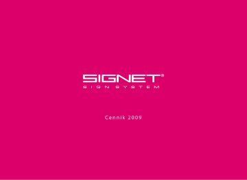 Cennik 2009 Witamy Państwa w świecie informacji wizualnej Signet! Na pozostałych stronach znajdziecie opis i charakterystykę każdego systemu oraz ceny przykładowych konstrukcji. Proszę pamiętać, że system signet polega na kompletnej dowolności w budowaniu tablic i tabliczek informacyjnych, dlatego przedstawione tablice traktować należy jako przykłady. Jeśli zaistniałaby potrzeba indywidualnej wyceny, prosimy o kontakt. Rafał Mrozowski Domax - Autoryzowany Dystrybutor Spis Treści Classic strona 4 Convexa strona 13 Elegance strona 18 Totem strona 21 Magnetic strona 24 Informacje strona 26 Classic Classic to unikalny modularny system dwustronnych profili; jedna strona pozwala na wsuwanie treści, druga jest płaska i pozwala na nanoszenie tekstów. Dwustronne profile produkowane są w 9 różnych wymiarach, niektóre z nich mają aż do 4 wsuwanych wierszy. Co więcej, Signet Classic zawiera także profile dzielące oraz delikatne profile boczne, pozwalające na zbudowanie modnych i eleganckich tabliczek z jednym bokiem. System Classic może być użyty jako konstrukcja z wsuwanymi profilami, oraz jako tablica z wyjmowanymi elementami typu „click“ (dzięki zastosowaniu unikalnej taśmy magnetycznej). Możliwe są także kombinajce z systemem Convexa. • Modny • Proste, czyste linie • Unikalna wydajność dwustronnych profili • Wsuwane lub typu „click“ • Nieograniczone wymiary • Duże i małe konstrukcje 5 CLASSIC obok:. : tablica informacyjna signet classic, srebro, rama S25. 29/35 wierszy nazwiskowych (profil 20-1), 4/3 wiersze podziałowe (profil 20-2, 20-1), 6 wierszy tytułowych (profil 35-1) oraz 2 wiersze główne (profil 25-4). Wymiary: 1400 mm x 1300 mm. Część profili malowana proszkowo. Grafika wyplotowana z folii PCV, bezpośrednio na profilach (wiersze tytułowe) lub na foliach bezbarwnych wsuwanych do wnętrza (wiersze z nazwiskami) 6 CLASSIC tablica informacyjna signet classic, złoto. Wymiar: 1300 x 1300 mm. 28 wierszy (profil 50-1), jeden wiersz tytułowy (25-4). Tablica dzielona profilem M-25. Rama z profilu S-25. Grafika wyplotowana bezpośrednio na powierzchni tablicy. 7 CLASSIC lewo: Tablica informacyjna signet classic, srebro. Rama po 2 stronach (S25). Prosile 13-2 oraz 20-3. Szerokość: 600 mm, wysokość 450 mm. prawo góra: Tablica Informacyjna Signet Classic, złoto. Rama S25, dzielona profilem M25. 25 wierszy 13-2, jeden wiersz 20-3, oraz jeden wiersz główny 25-4. Wymiary: 700 mm x 1000 mm. prawo dół: Tabliczka Informacyjna, ramka S-12, jeden profil 50-1. Wymiar: 200mm x 55 mm. Grafika - wydruk cyfrowy na folii bezbarwnej przykryty bezbawną folią vivak 1mm. classic Tabliczki Informacyjne ilo wierszy* szeroko tabliczki (mm) 100 150 200 250 300 3 45 z 56 z 66 z 79 z 88 z 4 55 z 69 z 83 z 95 z 109 z 5 64 z 80 z 98 z 114 z 129 z 6 73 z 91 z 112 z 135 z 150 z 7 84 z 105 z 128 z 150 z 170 z 8 92 z 118 z 143 z 169 z 192 z 9 103 z 130 z 159 z 186 z 212 z *cena dla tabliczek srebrnych, złożonych z odpowiednio: 3, 4, 5, 6, 7, 8, i 9 profili 25-1 (28mm). Istnieje możliwość stworzenia zupełnie indywidualnej kompozycji. Cena zawiera druk cyfrowy na folii chroniony folią vivak 1mm, nie zawiera opracowania loga. Tablice Informacyjne (rama S-25) ilo wierszy szeroko tablicy (mm) 1000 1200 1400 2000 2500 20 2 450 z 2 720 z 3 185 z 4 310 z 5 338 z 25 2 790 z 3 209 z 3 685 z 5 127 z 6 362 z 30 3 350 z 3 698 z 4 235 z 5 908 z 7 373 z 35 3 590 z 4 187 z 4 816 z 6 685 z 8 236 z 40 4 090 z 4 590 z 5 383 z 7 480 z 9 247 z *wycena dla tablic w klorze srebrnym. Każda tablica zawiera odpowiednią ilość wierszy (profil 35-1), oraz profil tytułowy - 25-4. Wycenione tablice nie zawierają podziału pionowego (profil M-25) oraz opracowania i wykonania grafiki która musi być przedmiotem osobnego szacunku. classic Tablice Informacyjne ( magnetyczne) ilo wierszy szeroko tablicy (mm) 1000 1200 1400 2000 2500 20 2 590 z 2 920 z 3 409 z 4 590 z 5 687 z 25 2 839 z 3 590 z 3 930 z 5 589 z 6 750 z 30 3 490 z 3 980 z 4 590 z 6 495 z 7 790 z 35 3 710 z 4 650 z 5 289 z 7 120 z 8 690 z 40 4 390 z 4 950 z 5 695 z 7 900 z 9 850 z classic classic Tablice Podwieszane symbol opis cena netto szt.* SCH2W600 2 wiersze 50-1, 600 mm szeroko , jednostronna 189 z SCH4W600 4 wiersze 50-1, 600 mm szeroko , jednostronna 289 z SCH6W800 6 wierszy 50-1, 800 mm szeroko , dwustronna SCH4W800 4 wiersze 50-1, 800 mm szeroko , dwustronna 1 350 z 867 z *Cena zawiera komplet wraz z uchwytami i mocowaniem sufitowym oraz konstrukcję magnetyczną. Cena nie zawiera grafiki. Wersja jednostronna zawiera profile zinformacją tylko z jednej strony. Wersja dwustronna posiada widoczną informację z obu stron. Profile koloru srebrnego. classic Stojaczki Biurkowe symbol opis cena netto szt.* SCD48150 Identyfikator biurkowy, 150 mm, 1 wiersz 50 mm 56 z SCD48100 Identyfikator biurkowy, 100 mm, 1 wiersz 30 mm 40 z *Cena zawiera folię ochronną vivak 1mm, oraz czarny wydruk na foli. Kolor profili - srebrny. Convexa Convexa to łatwy w obsłudze system, umożliwiający codzienną wymianę informacji. Profile Convexa dostępne są w sześciu różnych wymiarach, które odpowiadają standardom wymiarów papieru (wydruk A4 pasuje do profilu C4, wydruk A5 do C5 itp.) Profile tego systemu mogą być montowane bezpośrednio na ścianie lub połączone z magnetycznym systemem „click“. • Informacja łatwa w obsłudze • Dopasowana do standardowych wymiarów papieru • Końcówki z możliwością przykręcenia śrubką • Małe i duże tablice 14 CONVEXA góra: podwieszona tablica convexa C5, 1000 mm szerokości wraz z grafiką na płycie PCV prawo: złota tabliczka convexa C4, 300 mm, grafika wyplotowana na wsuniętej anodowanej płytce aluminiowej prawo góra: tabliczka BHP, convexa C7, 150 mm, grafika wyplotowana bezpośrednio na powierzchni profilu. Convexa Tablice Jednoelementowe symbol format tabliczki cena netto szt.* C3330 330 mm x 330 mm, szare za lepki z wkr tami, grafika na p yt