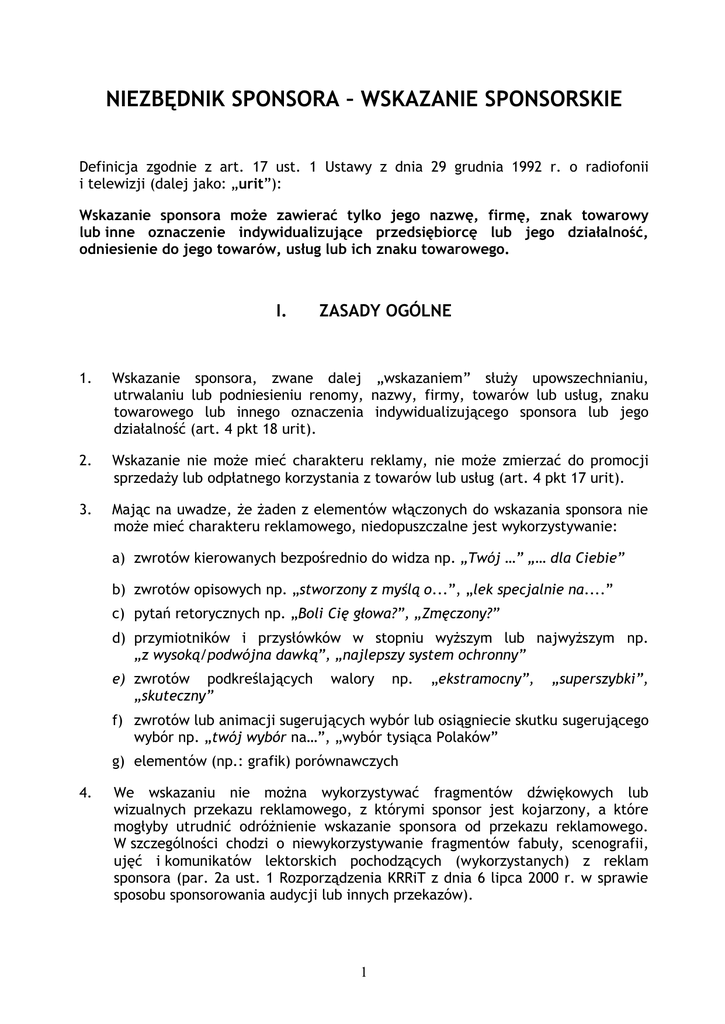 NIEZBĘDNIK SPONSORA – WSKAZANIE SPONSORSKIE Definicja zgodnie z art. 17 ust. 1 Ustawy z dnia 29 grudnia 1992 r. o radiofonii i telewizji (dalej jako: „urit”): Wskazanie sponsora może zawierać tylko jego nazwę, firmę, znak towarowy lub inne oznaczenie indywidualizujące przedsiębiorcę lub jego działalność, odniesienie do jego towarów, usług lub ich znaku towarowego. I. ZASADY OGÓLNE 1. Wskazanie sponsora, zwane dalej „wskazaniem” służy upowszechnianiu, utrwalaniu lub podniesieniu renomy, nazwy, firmy, towarów lub usług, znaku towarowego lub innego oznaczenia indywidualizującego sponsora lub jego działalność (art. 4 pkt 18 urit). 2. Wskazanie nie może mieć charakteru reklamy, nie może zmierzać do promocji sprzedaży lub odpłatnego korzystania z towarów lub usług (art. 4 pkt 17 urit). 3. Mając na uwadze, że żaden z elementów włączonych do wskazania sponsora nie może mieć charakteru reklamowego, niedopuszczalne jest wykorzystywanie: a) zwrotów kierowanych bezpośrednio do widza np. „Twój …” „… dla Ciebie” b) zwrotów opisowych np. „stworzony z myślą o...”, „lek specjalnie na....” c) pytań retorycznych np. „Boli Cię głowa?”, „Zmęczony?” d) przymiotników i przysłówków w stopniu wyższym lub najwyższym np. „z wysoką/podwójna dawką”, „najlepszy system ochronny” e) zwrotów podkreślających „skuteczny” walory np. „ekstramocny”, „superszybki”, f) zwrotów lub animacji sugerujących wybór lub osiągniecie skutku sugerującego wybór np. „twój wybór na…”, „wybór tysiąca Polaków” g) elementów (np.: grafik) porównawczych 4. We wskazaniu nie można wykorzystywać fragmentów dźwiękowych lub wizualnych przekazu reklamowego, z którymi sponsor jest kojarzony, a które mogłyby utrudnić odróżnienie wskazanie sponsora od przekazu reklamowego. W szczególności chodzi o niewykorzystywanie fragmentów fabuły, scenografii, ujęć i komunikatów lektorskich pochodzących (wykorzystanych) z reklam sponsora (par. 2a ust. 1 Rozporządzenia KRRiT z dnia 6 lipca 2000 r. w sprawie sposobu sponsorowania audycji lub innych przekazów). 1 5. Sponsor składa w treści umowy o sponsorowaniu audycji stosowne oświadczenie, iż przy tworzeniu wskazania sponsorskiego nie wykorzystuje fragmentów wizualnych lub dźwiękowych przekazu reklamowego, o których mowa w pkt 4 Niezbędnika. 6. Wskazanie nie może zawierać jakichkolwiek informacji komercyjnych, sprzedażowych, czy odniesień o charakterze reklamowym, typu: „Najlepszy w swojej branży”, „Pismo od jutra w kioskach”, „Płyta już w sprzedaży”, „(w kinach) od 15 lutego”, „dostępny w ……………”itp. 7. Audycję sponsoruje sponsor, czyli określony podmiot (firma), a nie produkty lub usługi tej firmy, zatem komunikat: „Sponsorem audycji jest...” powinien zawierać nazwę (firmę) sponsora. 8. Jeżeli sponsor chce być identyfikowany tylko przez nazwę produktu z pominięciem nazwy firmy, wówczas komunikat w billboardzie powinien brzmieć: „Sponsorem audycji jest producent/ dystrybutor towaru (usługi) X”. Dopuszczalne jest przy tym określenie cech produktu (usługi), które nie maja charakteru reklamowego. PRZYKŁAD: „Sponsorem audycji jest X producent okien z PCV”, „Sponsorem audycji jest X producent balsamu do ciała”, „Sponsorem audycji jest X producent kremu do skóry wrażliwej”, „Sponsorem audycji jest X dystrybutor soku Y o smaku pomarańczowym”. 9. Wskazanie może odnosić się tylko do podmiotów sponsorujących oraz ich towarów lub usług. Nie może w jakikolwiek sposób promować nazw, marek, znaków towarowych, produktów lub usług osób trzecich niezwiązanych bezpośrednio z działalnością sponsora. Powyższe ograniczenie nie dotyczy sieci dystrybucyjnych lub przedstawicieli handlowych osób trzecich. PRZYKŁAD: „Sponsorem audycji jest właściciel sklepów X, dystrybutor produktów marki Y”. 10. We wskazaniu możliwa jest wizualizacja dowolnej liczby produktów lub usług z oferty handlowej sponsora. Wizualizacja produktów lub usług nie może mieć cech reklamy. 11. We wskazaniu można umieścić znak towarowy sponsora z zastrzeżeniem, że nie ma on znamion reklamowych (nie zmierza do promocji sprzedaży albo innych form korzystania z produktów lub usług sponsora), odpowiednie zastosowanie mają postanowienia pkt 3. 12. Sponsor zobowiązany jest przedstawić odpowiedni dokument potwierdzający prawo używania określonego znaku towarowego. 13. We wskazaniu dopuszcza się oznaczenie indywidualizujące przedsiębiorcę lub jego działalność takie jak: a) adres strony internetowej sponsora b) informację o zdobytych prestiżowych nagrodach 2 14. W każdym wskazaniu musi znajdować się informacja o sponsorowaniu zawierająca słowo lub wyraz „sponsor” w odpowiednim przypadku i liczbie oraz czytelne wskazanie sponsorowanej audycji. Jeśli lektor nie informuje o sponsorowaniu, musi zostać umieszczony czytelny, odróżniający się od tła płaszczyzny poziomy napis, zajmujący nie mniej niż jedną czwartą powierzchni ekranu. PRZYKŁAD treści napisu: „Sponsorem audycji jest/był X, producent towaru Y”. W przypadku, jeśli lektor czyta: „Na program zaprasza/zaprosił... Program oglądają/obejrzeli państwo dzięki...” lub inną treść pomijającą słowo „sponsor” w odpowiednim przypadku i liczbie, zamieszczenie napisu, o którym mowa wyżej jest obligatoryjne. Wszystkie czcionki użyte w informacji o sponsorowaniu przedstawionej w sposób graficzny muszą być tej samej wielkości. 15. Wskazanie sponsorskie w przypadku jednego sponsora trwa do 8 sek., w przypadku dwóch sponsorów do 16 sek., w przypadku trzech i więcej sponsorów do 24 sek., przy czym wskazanie każdego ze sponsorów nie może trwać dłużej niż 8 sek. 16. W celu odróżnienia wskazania sponsorskiego od innych przekazów zaleca się, aby informacja o sponsorowaniu pojaw