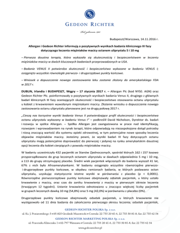Budapeszt/Warszawa, 14.11.2016 r. Allergan i Gedeon Richter informują o pozytywnych wynikach badania klinicznego III fazy dotyczącego leczenia mięśniaków macicy octanem uliprystalu 5 i 10 mg – Pierwsza doustna terapia, która wykazała się skutecznością i bezpieczeństwem w leczeniu mięśniaków macicy w dwóch kluczowych badaniach przeprowadzonych w USA. – Badanie VENUS II potwierdza skuteczność i bezpieczeństwo wykazane w badaniu VENUS I; osiągnięto wszystkie równoległe pierwszo- i drugorzędowe punkty końcowe. – Wniosek o dopuszczenie nowego zastosowania leku zostanie złożony do amerykańskiego FDA w 2017 r. DUBLIN, Irlandia i BUDAPESZT, Węgry – 17 stycznia 2017 r. – Allergan Plc (kod NYSE: AGN) oraz Gedeon Richter Plc. poinformowały o pozytywnych wynikach badania Venus II, drugiego z głównych badań klinicznych III fazy oceniających skuteczność i bezpieczeństwo stosowania octanu uliprystalu u kobiet z krwawieniem wywołanym mięśniakami macicy. Złożenie wniosku o dopuszczenie nowego zastosowania octanu uliprystalu planowane jest na drugą połowę 2017 r. „Cieszą nas korzystne wyniki badania Venus II potwierdzające profil skuteczności i bezpieczeństwa octanu uliprystalu wykazany w badaniu Venus I” – podkreślił David Nicholson, Dyrektor ds. badań i rozwoju w spółce Allergan. – Spółka Allergan jest zaangażowana w prace nad identyfikacją, rozwojem i wprowadzeniem na rynek terapii, które odpowiadają na niezaspokojone dotąd potrzeby i niosą znaczącą wartość dla systemu opieki zdrowotnej, w tym potencjalne nowe sposoby leczenia objawów mięśniaków macicy. Jesteśmy pewni, że wyniki badań III fazy dotyczących octanu uliprystalu mogą potencjalnie doprowadzić do pierwszej i jedynej na rynku amerykańskim doustnej opcji leczenia dla kobiet cierpiących z powodu mięśniaków macicy. W badaniu uczestniczyły 432 pacjentki ze Stanów Zjednoczonych, spośród których 162 i 157 losowo przyporządkowano do grup leczonych octanem uliprystalu w dawkach odpowiednio 5 mg i 10 mg, a 113 do grupy otrzymującej placebo. Średni wiek pacjentek włączonych do badania wynosił 41 lat, 67% z nich było Afroamerykankami. W badaniu osiągnięto wszystkie równorzędne pierwszoi drugorzędowe punkty końcowe, w obydwu ramionach badania, w których podawano octan uliprystalu, uzyskując statystycznie istotne wyniki w porównaniu z placebo (p < 0,0001). Równorzędne pierwszorzędowe punkty końcowe obejmowały odsetek pacjentek, u który ustało krwawienie z macicy, oraz czas do zaniku krwawienia z macicy w pierwszym okresie leczenia (trwającym 12 tygodni). Ustanie krwawienia odnotowano u znacząco większej liczby pacjentek w grupach leczonych dawką 10 mg (54,8%) oraz 5 mg (42,0%) w porównaniu z placebo (0%). Drugorzędowe punkty końcowe obejmowały odsetek pacjentek, u których krwawienie nie występowało od 11 dnia badania do zakończenia pierwszego okresu leczenia; odsetek pacjentek, u których do ustania krwawienia z macicy doszło w trakcie drugiego okresu leczenia; czas do zaniku krwawienia z macicy pod wpływem terapii w trakcie drugiego okresu leczenia; zmianę w stosunku do wartości wyjściowych na zmodyfikowanej podskali aktywności UFS-QOL po zakończeniu pierwszego okresu leczenia. W ciągu 10 dni od rozpoczęcia terapii w ramach pierwszego okresu leczenia krwawienie ustało u większej liczby pacjentek w grupach otrzymujących octan uliprystalu w dawce 10 mg (55,4%) i 5 mg (34,6%) w porównaniu z placebo (0,0%). W trakcie drugiego okresu leczenia istotnie więcej pacjentek w grupach otrzymujących 10 mg (57,3%) i 5 mg (40,5%) odnotowało ustanie krwawienia w porównaniu z placebo (8,0%). Poprawa w stosunku do wartości wyjściowych na zmodyfikowanej podskali aktywności UFS-QOL była istotnie większa w grupach otrzymujących octan uliprystalu w dawce 10 mg (56,7%) i 5 mg (48,3%) w porównaniu z placebo (13,0%). Kwestionariusz UFS-QOL stanowi zweryfikowane narzędzie przeznaczone do oceny objawów specyficznych dla schorzenia oraz jakości życia powiązanej ze stanem zdrowia. Stanowi uznany instrument oceny wpływu choroby na dobrostan kobiet z mięśniakami macicy. „To bardzo zachęcające, że kolejne badanie III fazy przeprowadzone z udziałem pacjentek z objawami mięśniaków macicy zostało uwieńczone powodzeniem, co dowodzi, że octan uliprystalu może stanowić obiecujący lek dla kobiet z tym schorzeniem” – powiedział dr István Greiner, dyrektor ds. badań w spółce Gedeon Richter Plc. „Podtrzymujemy swoje zaangażowanie na rzecz rozwoju produktów służących ochronie zdrowia kobiet, które przyczyniają się do poprawy jakości ich życia we wszystkich grupach wiekowych.” Do najczęściej występujących działań niepożądanych (≥5%) octanu uliprystalu, które wystąpiły łącznie w pierwszym okresie leczenia oraz pierwszym okresie przejściowym po leczeniu, należały: uderzenia gorąca, ból głowy, zmęczenie i nudności. Najczęściej występującym działaniem niepożądanym (≥5%) octanu uliprystalu występującym łącznie w drugim okresie leczenia oraz drugim okresie przejściowym po leczeniu był ból głowy. Badanie kliniczne Venus II Było to wieloośrodkowe, randomizowane, podwójnie zaślepione kontrolowane placebo badanie kliniczne z udziałem kobiet z Ameryki Północnej w wieku od 18 do 50 lat, które nie przechodziły jeszcze menopauzy i u których w trakcie co najmniej 4 spośród 6 ostatnich cykli menstruacyjnych występowały regularne (od 22 do 35 dni) patologiczne krwawienia z macicy, utrata krwi menstruacyjnej określana metodą hematyny alkalicznej w ciągu pierwszych 8 dni miesiączki wynosiła co najmniej 80 ml, występował co najmniej 1 mięśniak macicy o dowolnym rozmiarze i umiejscowieniu wykrywalny w przezpochwowym badaniu ultrasonograficznym, poziom hormonu folikulotropowego nie przekraczał 20 mIU/ml, i dokonano oceny objętości macicy do 20 tygodni